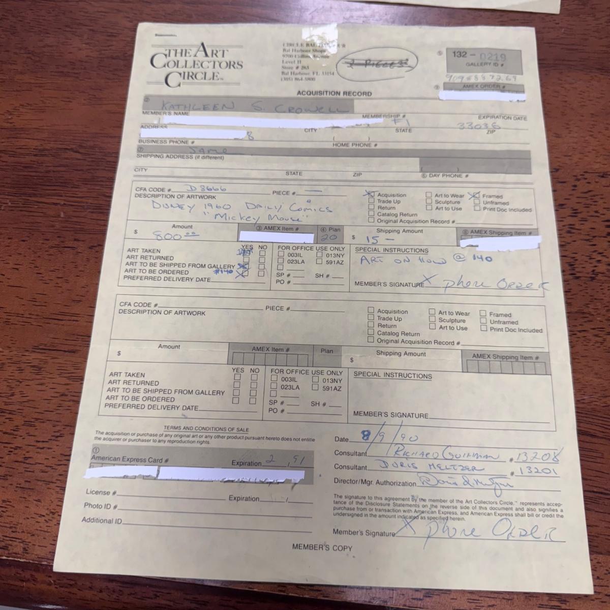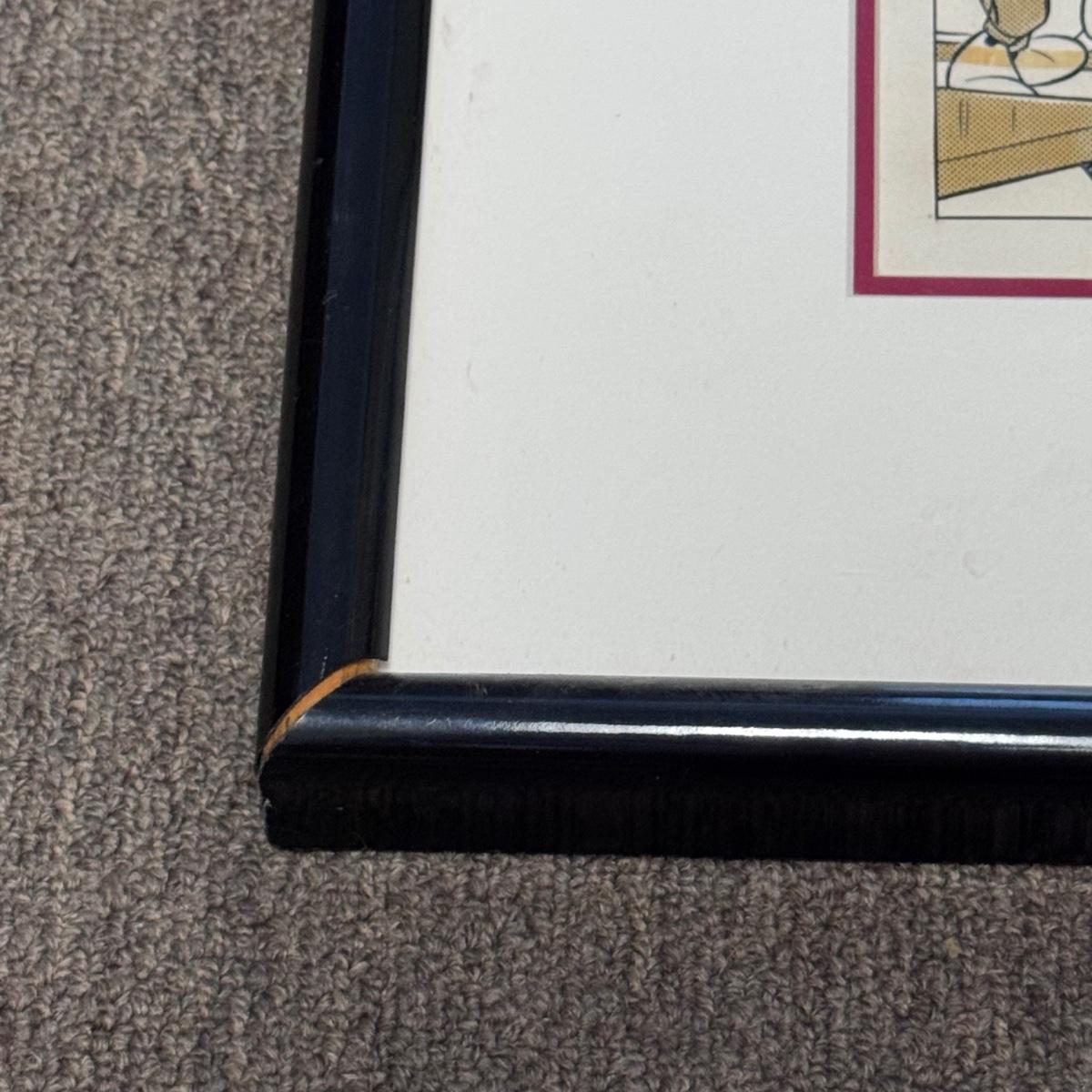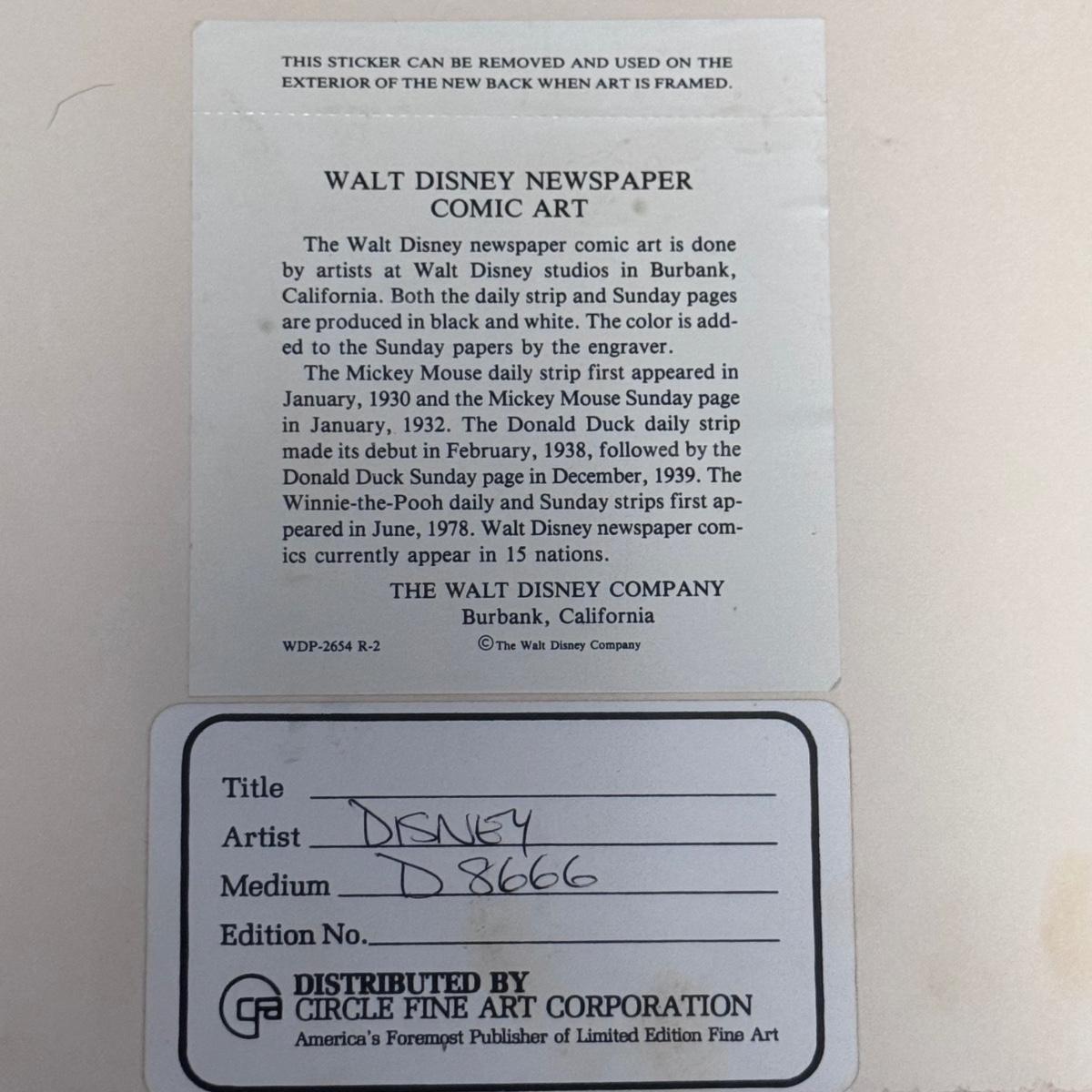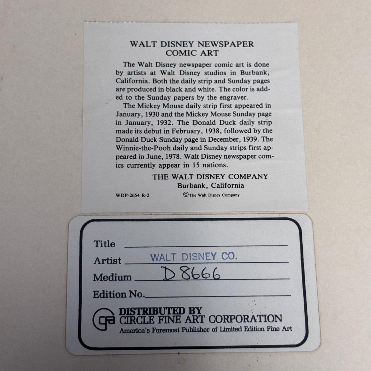 This lot includes two Walt Disney daily strips from the early 1960’s. You’ll find “The Mickey Mouse” daily strip and “The Minnie Mouse” daily strip. Both pieces of art are protected in a wooden frame with black plastic covering, a plastic layer, and double matting. “The Mickey Mouse” daily strip is a tad bigger than the other, measuring 27” x 14”H. “The Minnie Mouse” daily strip measures 26” x 13”H. The original invoices are included for both - see the last two pictures.