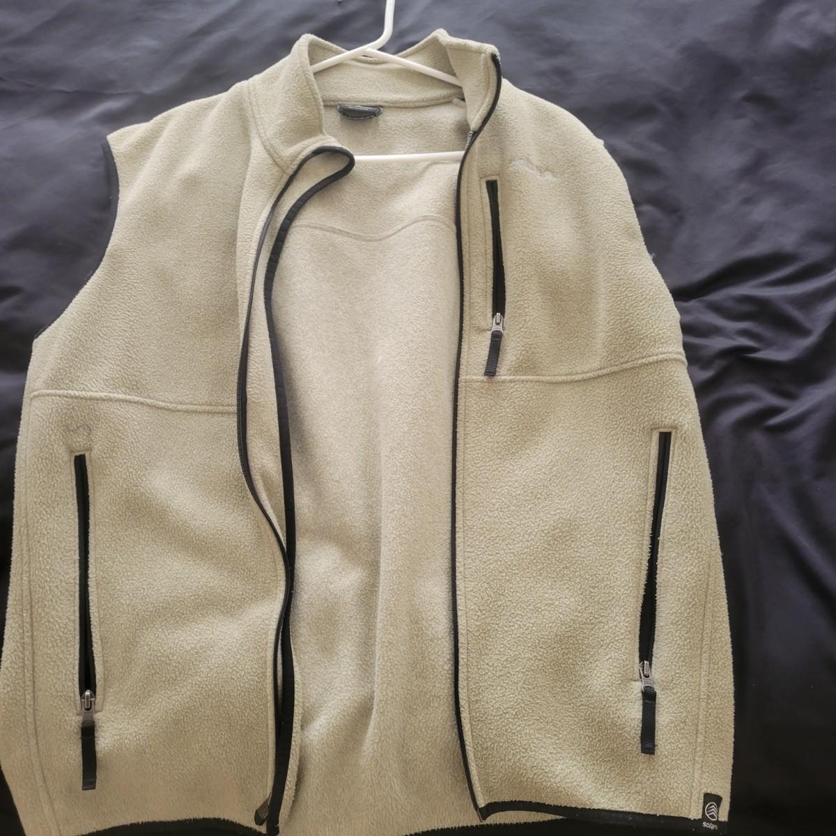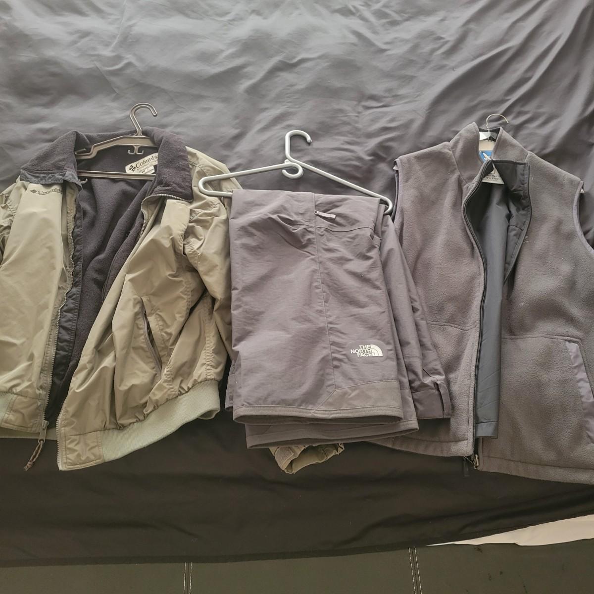 A assortment of men's sport clothing from The North Face, Eddie Bauer and other manufacturers. Items range from windbreaker and winter coats to ski bibs and fleece vests. Items range in size from medium to large, see photos for more details. Shipping available