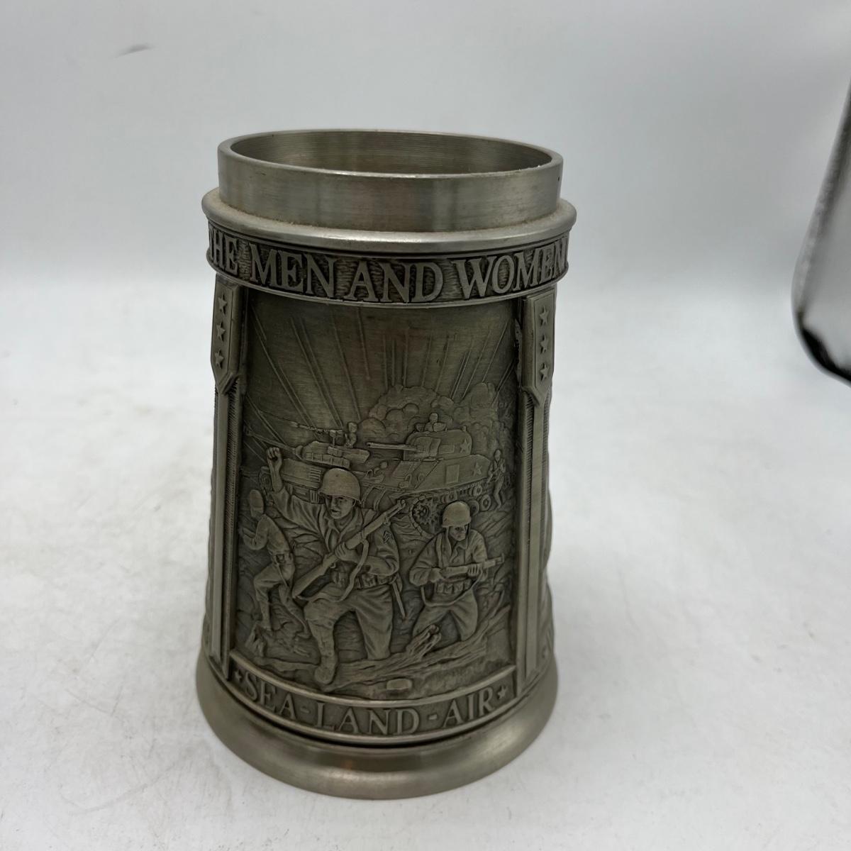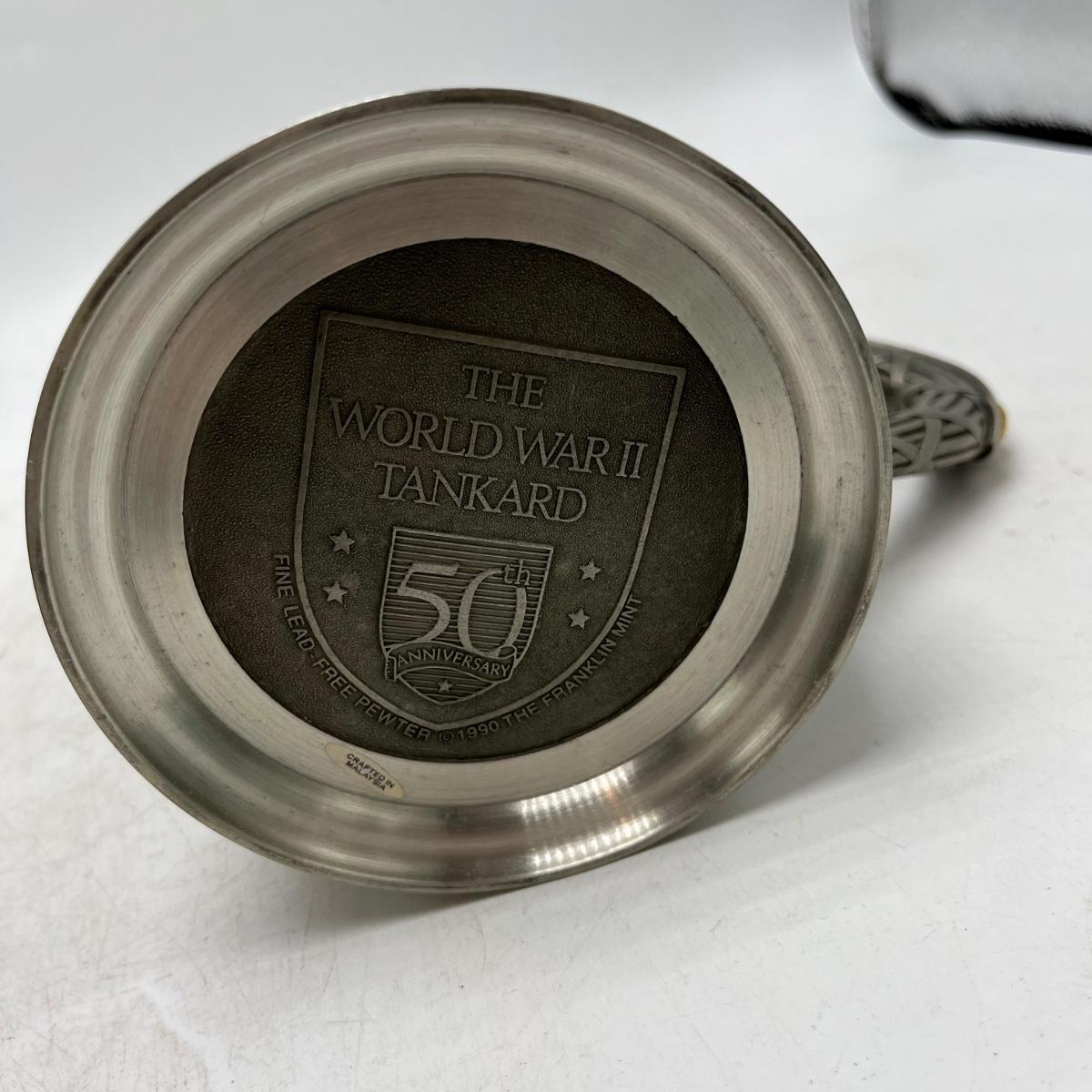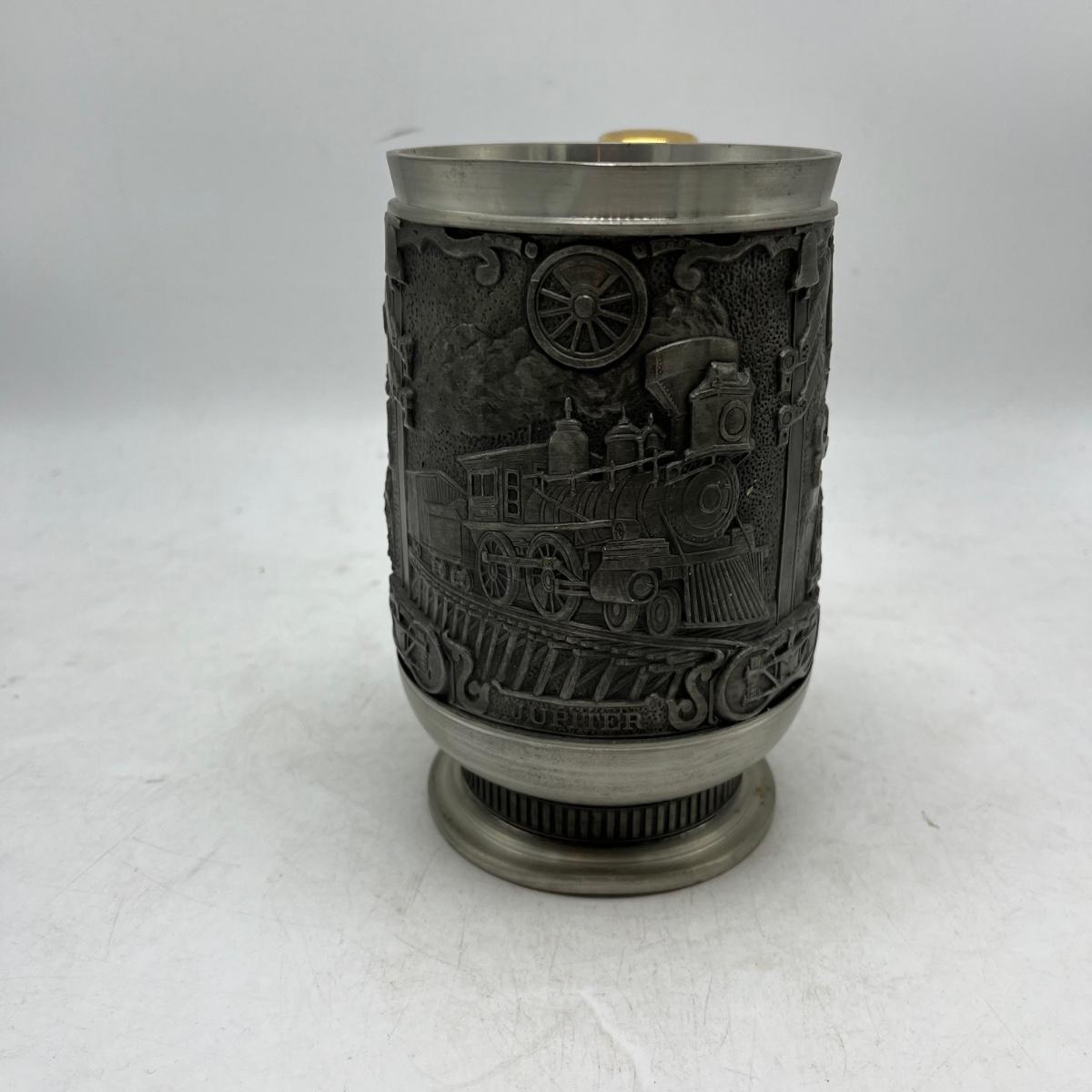 Lot includes aThe Official Railroad Museum Tankard and The World War 2 Tankard that are both by The Franklin Mint. Railroad tankard has dent on top , see pictures. Largest tankard measures 6.5” x 4” x 6.5”.