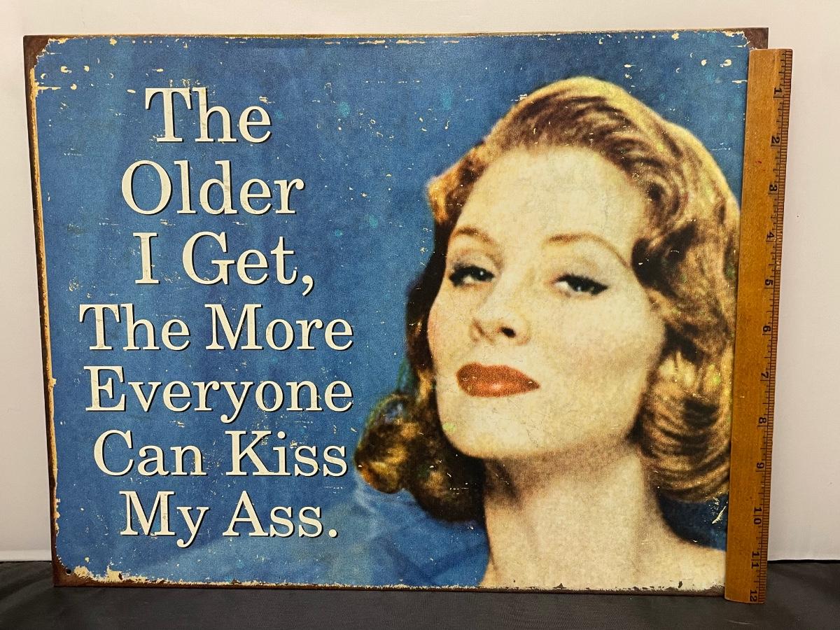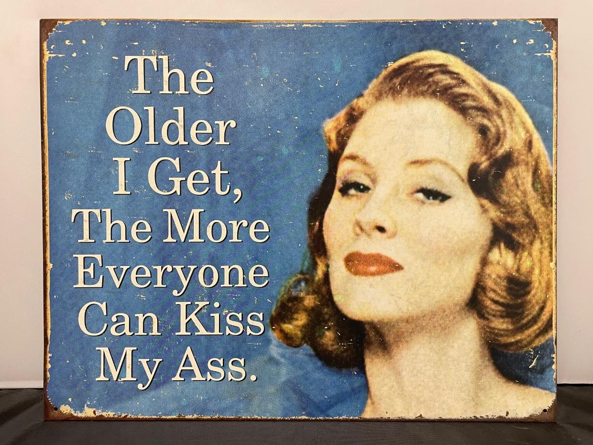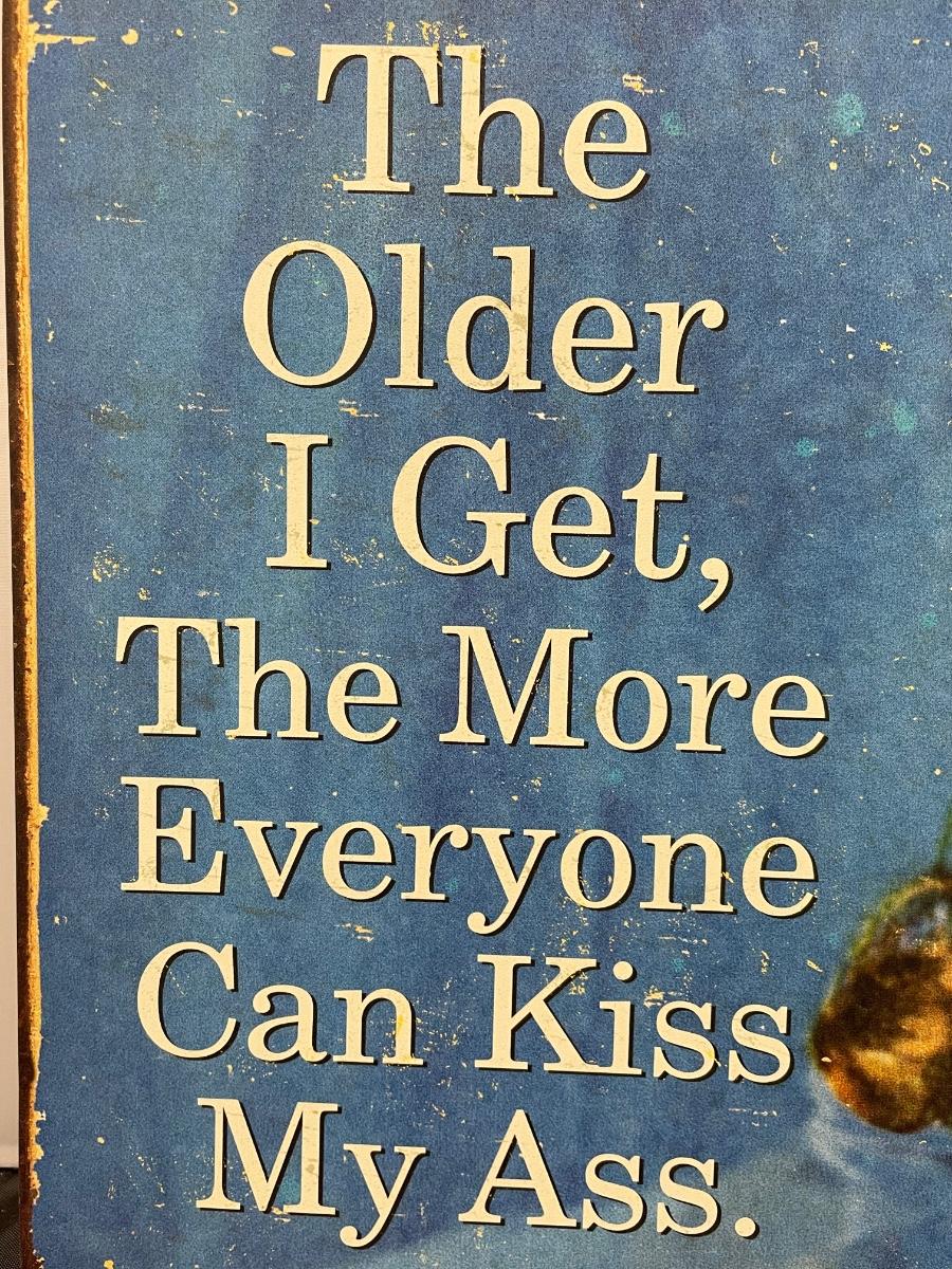 This item is in good condition. It is supposed to look roughed up in the front. The front reads: “The older I get, the more everyone can kiss my ass.” This sign is about 13” tall and about 17” long. It was made in the U.S.A.