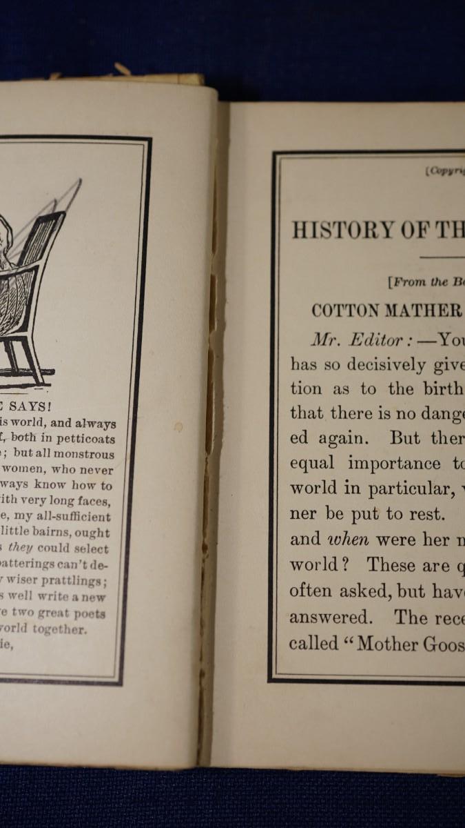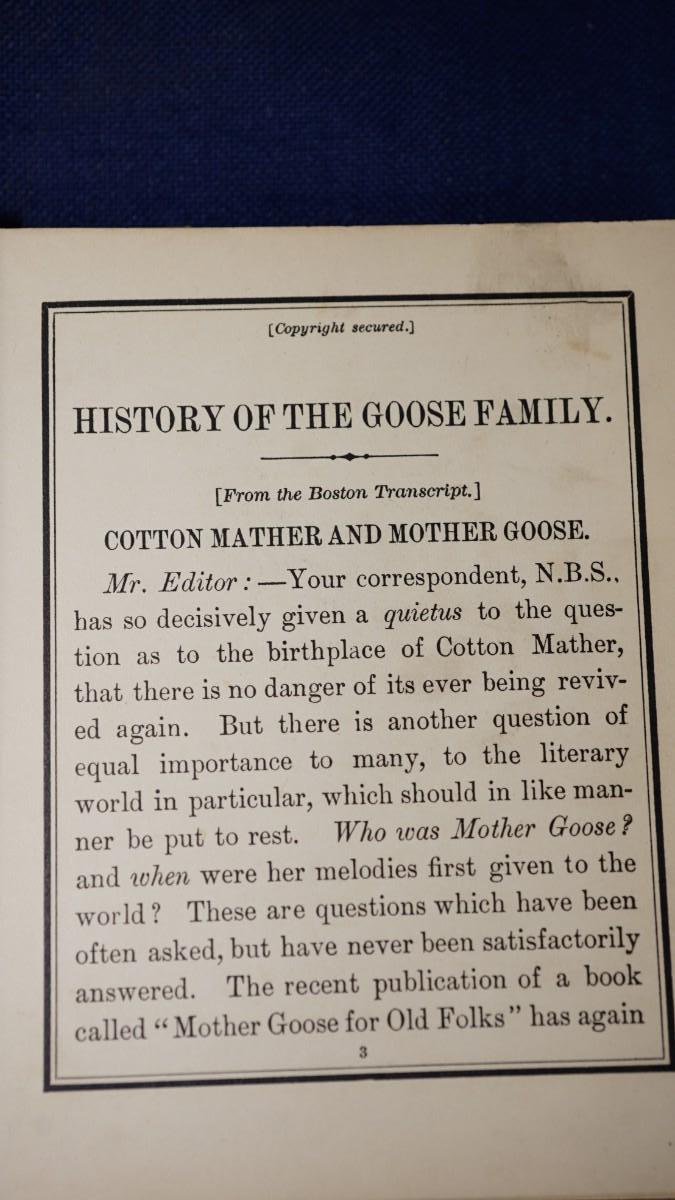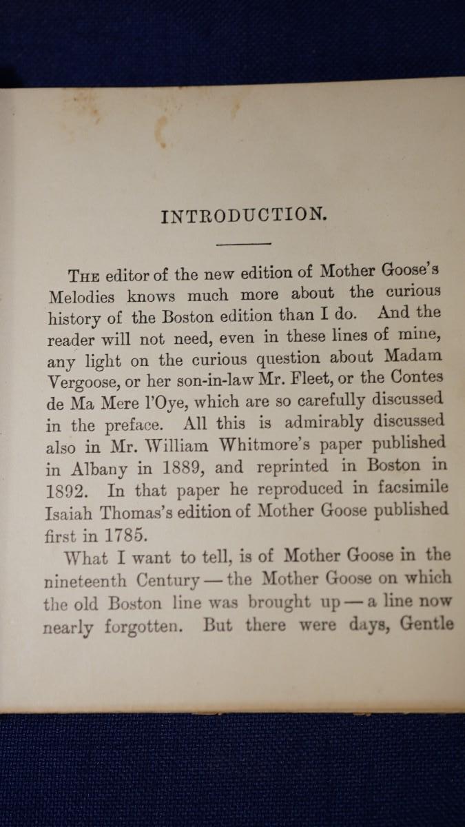 this book has an introduction that reads the story of the Mother Goose stories the origin, authors and reprints.