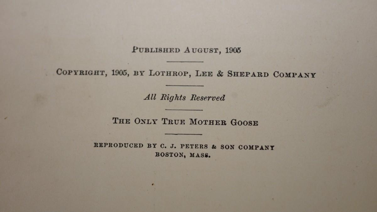 This book of the history of Mother Goose rhymes along with the illustrations and rhymes after the introduction was published in 1905 Peter and Sons Publishing of Boston, Mass,