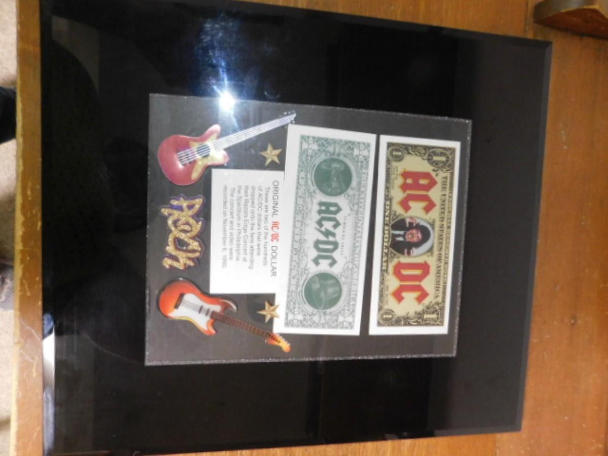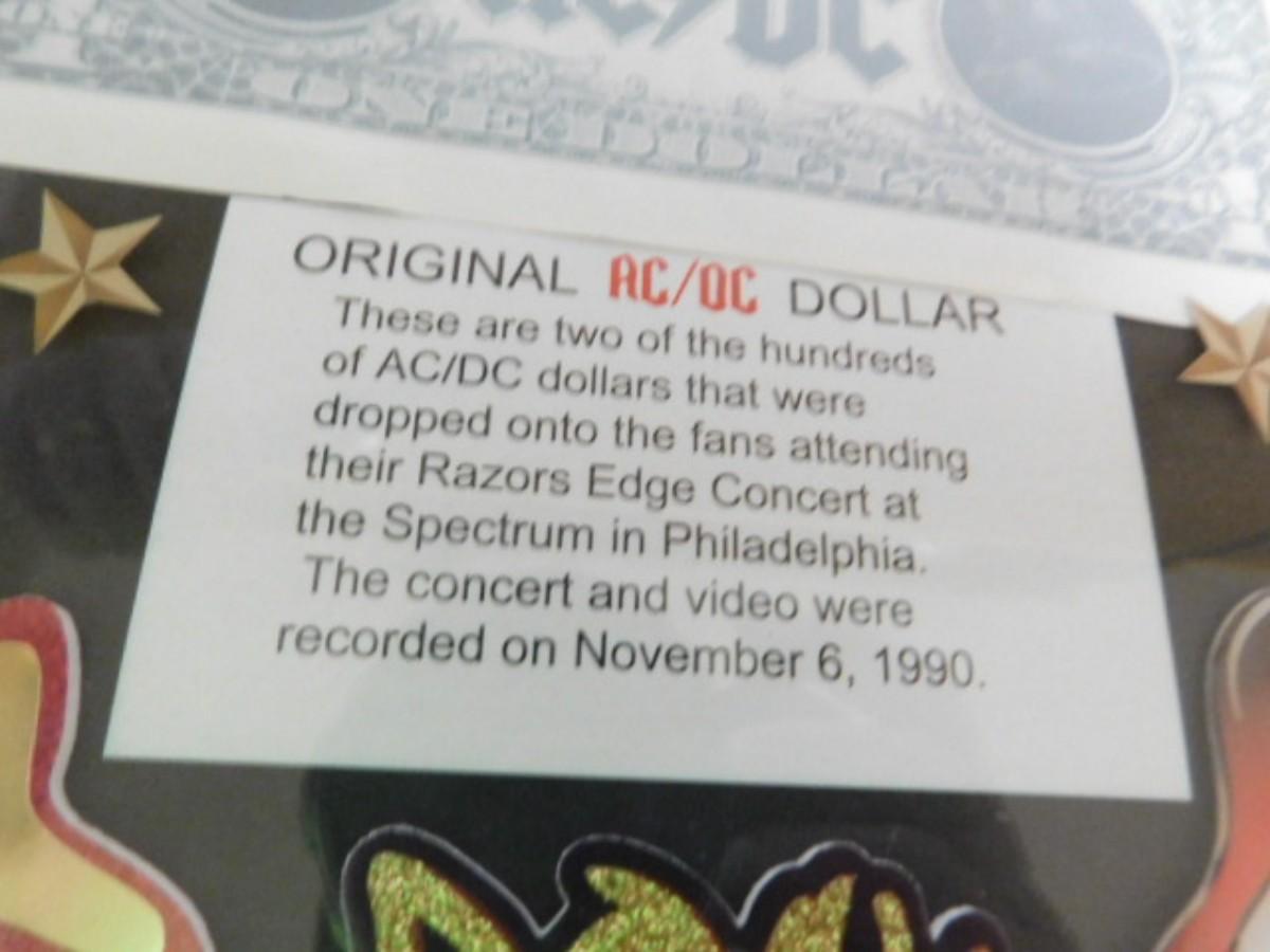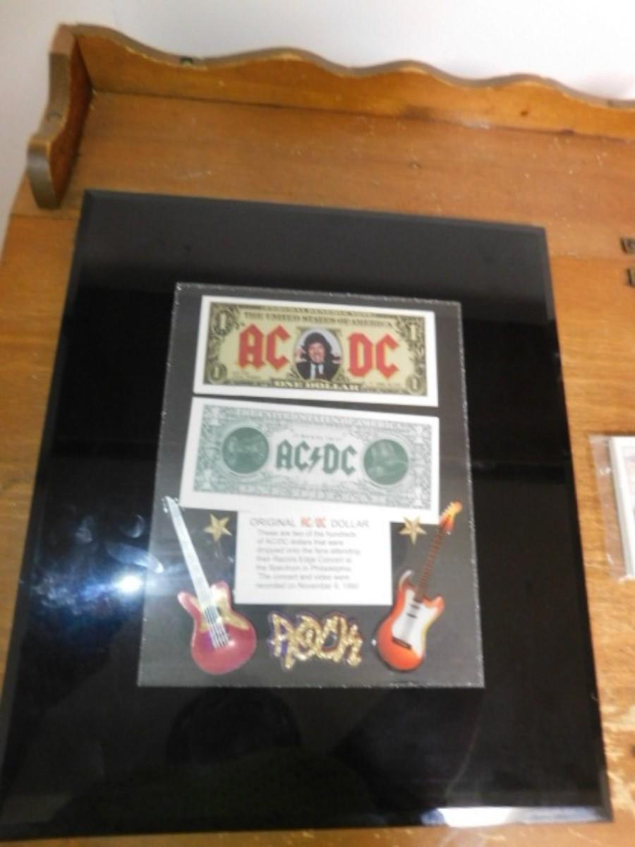 The Original AC/DC Dollar Bill on Display with Trading Cards