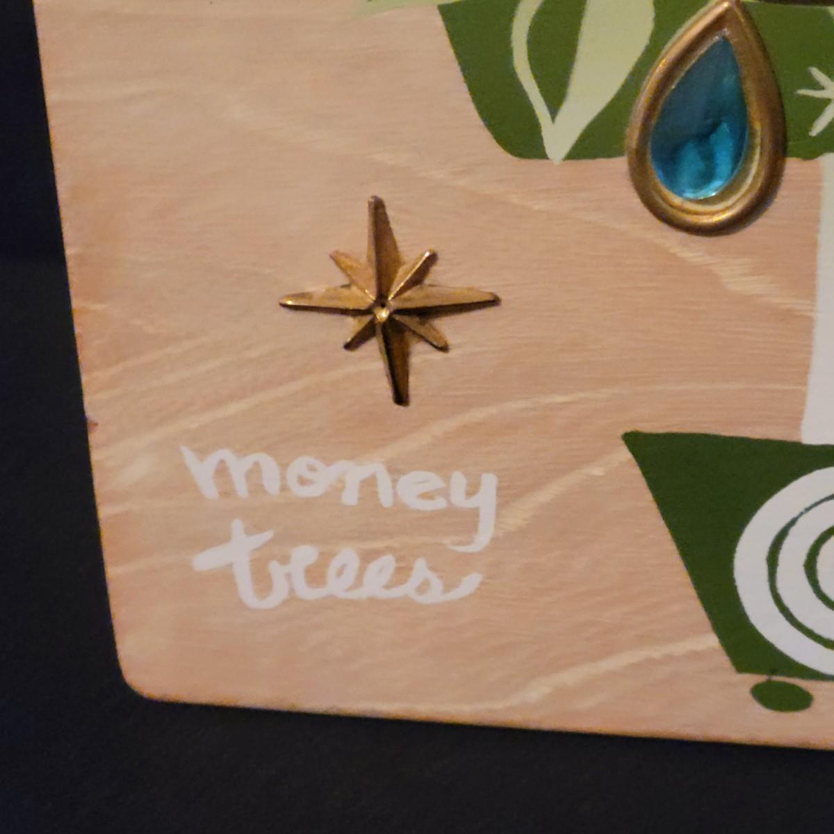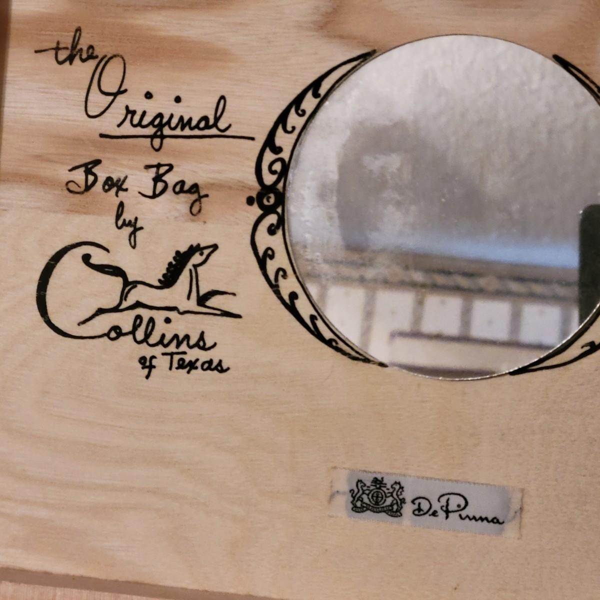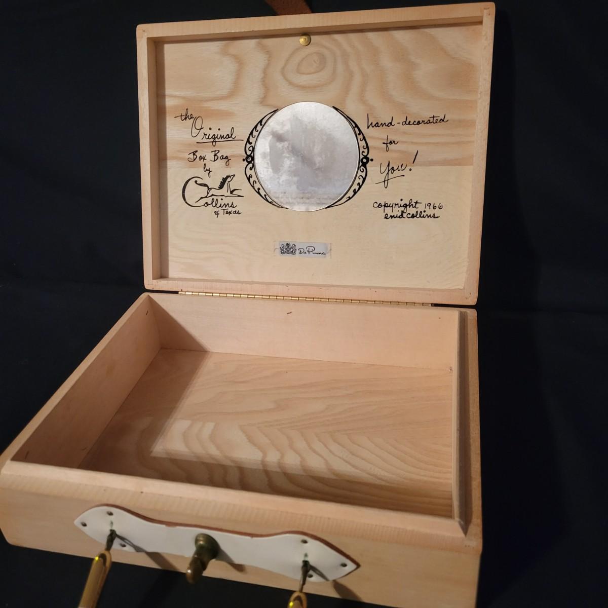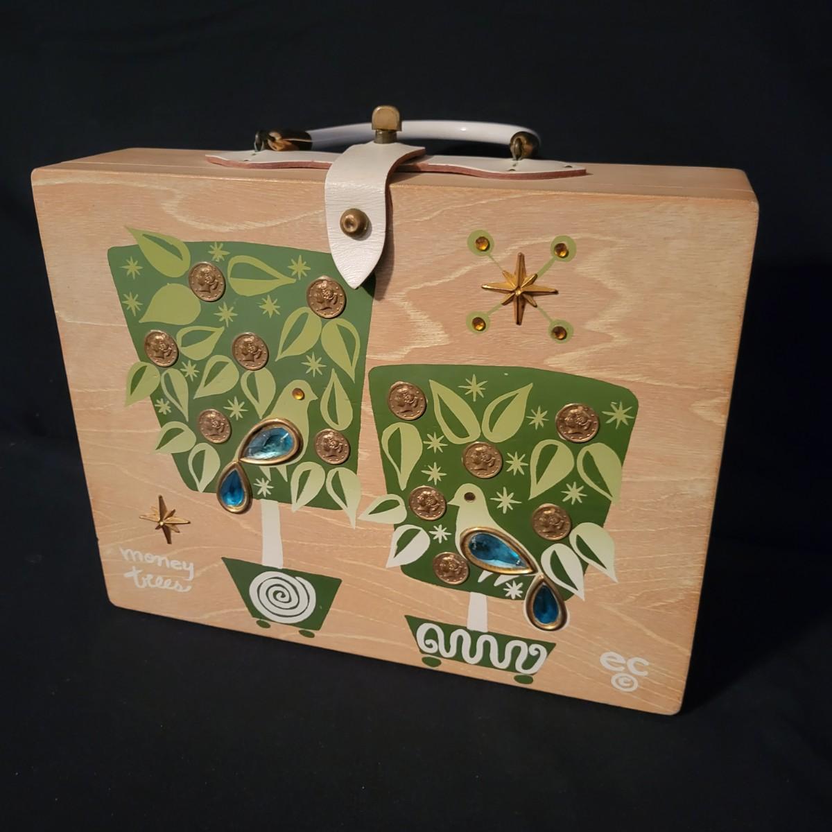 The Original Box Bag hand decorated by Enid Collins of Collins of Texas. Titled "Money Trees" it has a hand painted tree motif with coins, stars and more attached for decorative accents. It measures approximately 11.5" x 9" x 3". Shipping available