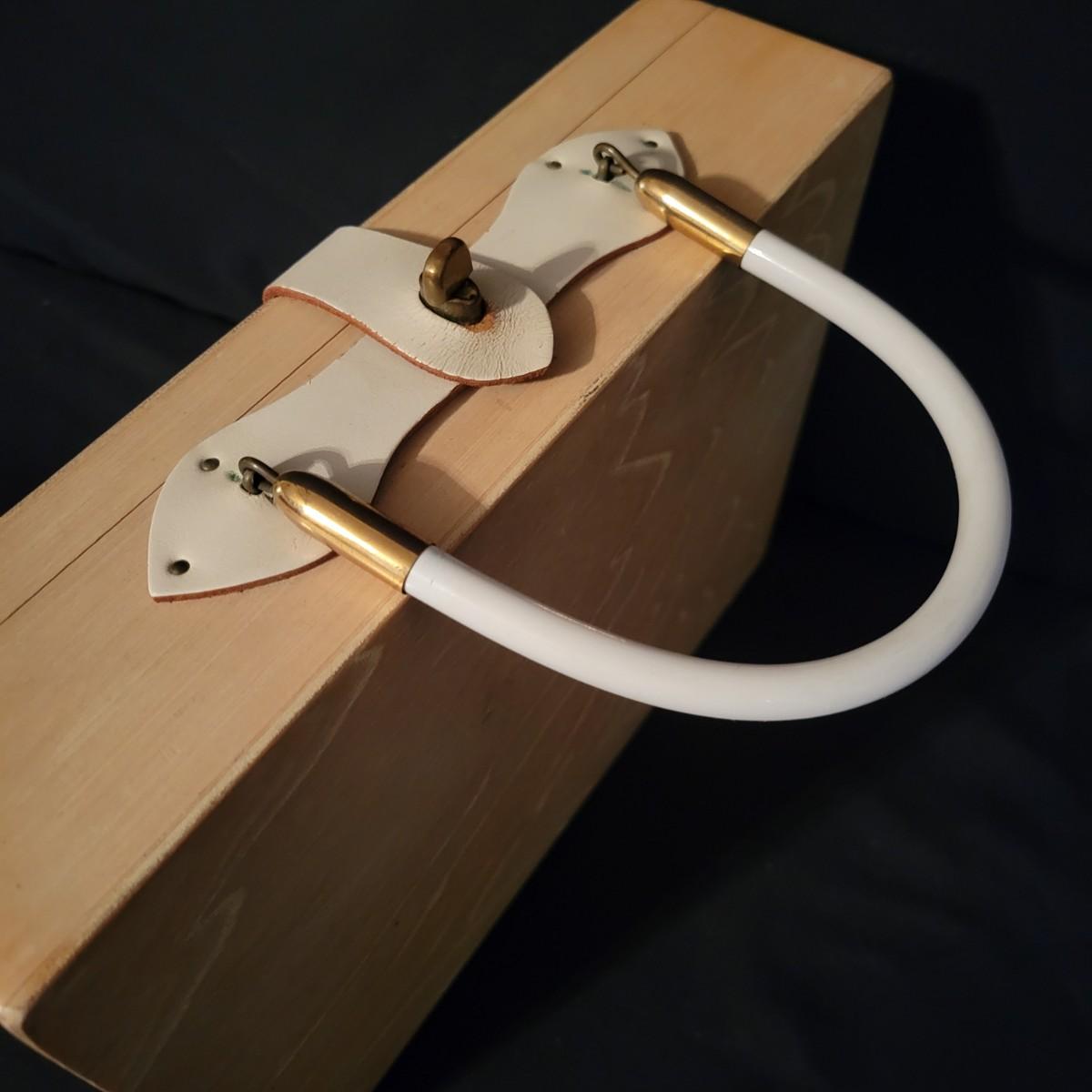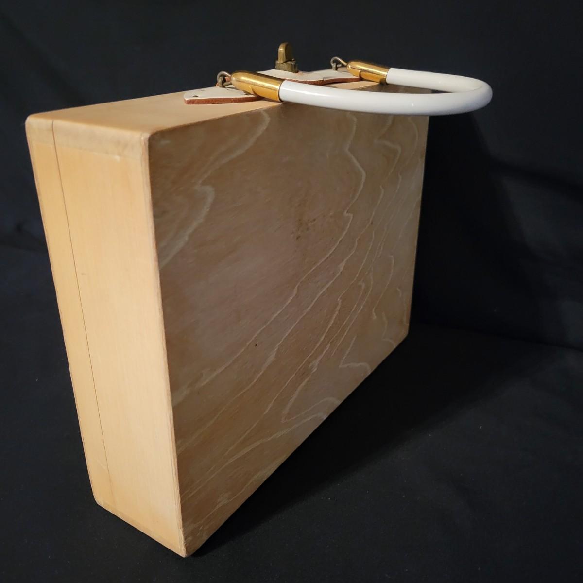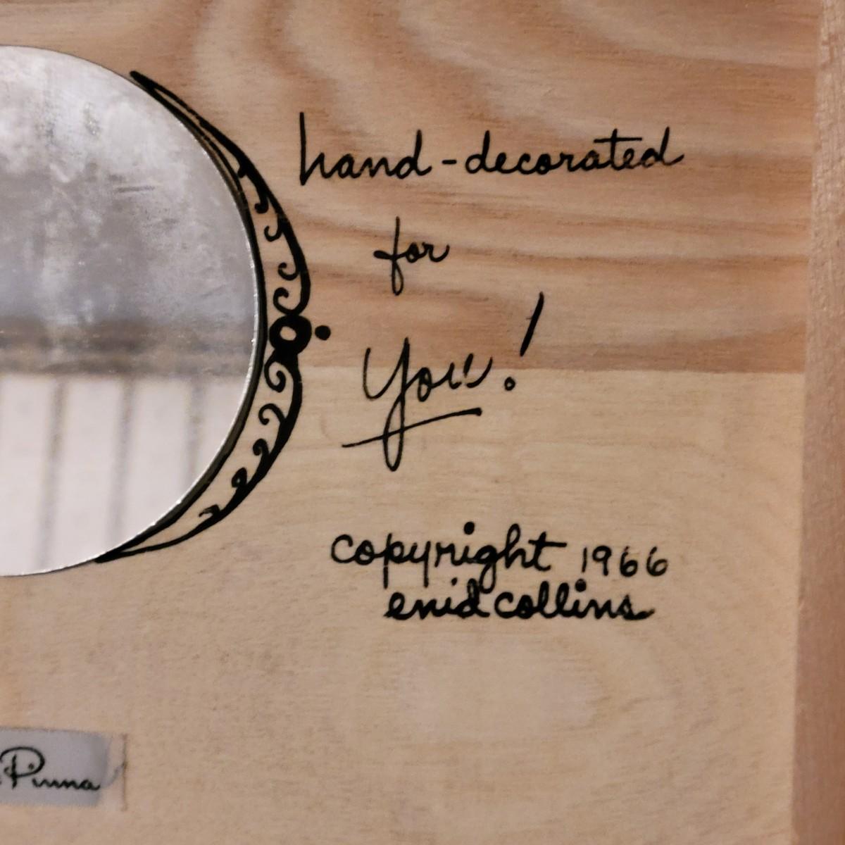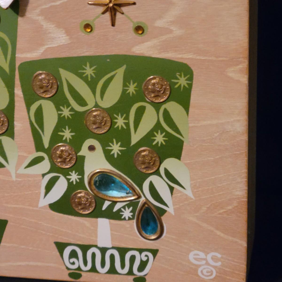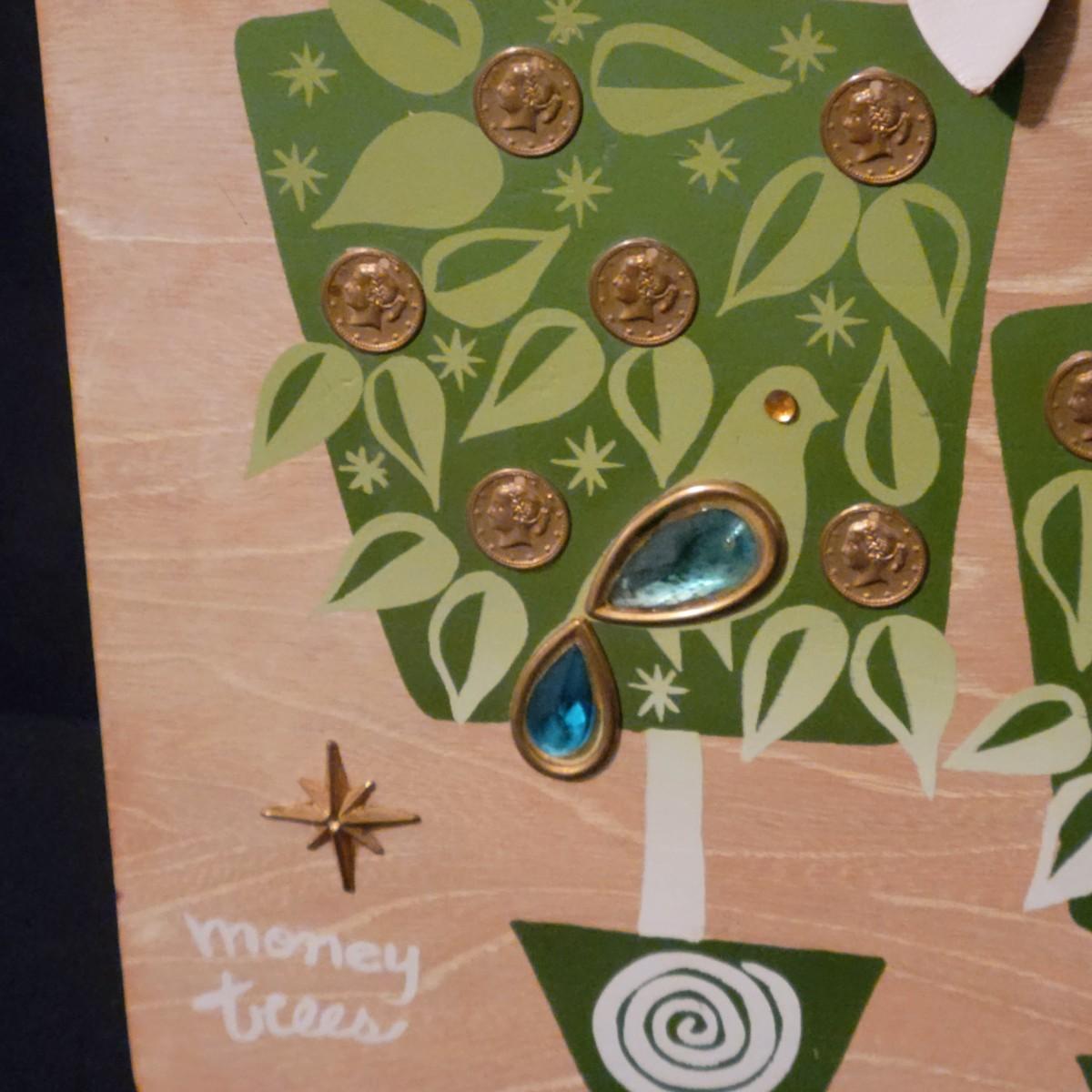 The Original Box Bag hand decorated by Enid Collins of Collins of Texas. Titled "Money Trees" it has a hand painted tree motif with coins, stars and more attached for decorative accents. It measures approximately 11.5" x 9" x 3". Shipping available