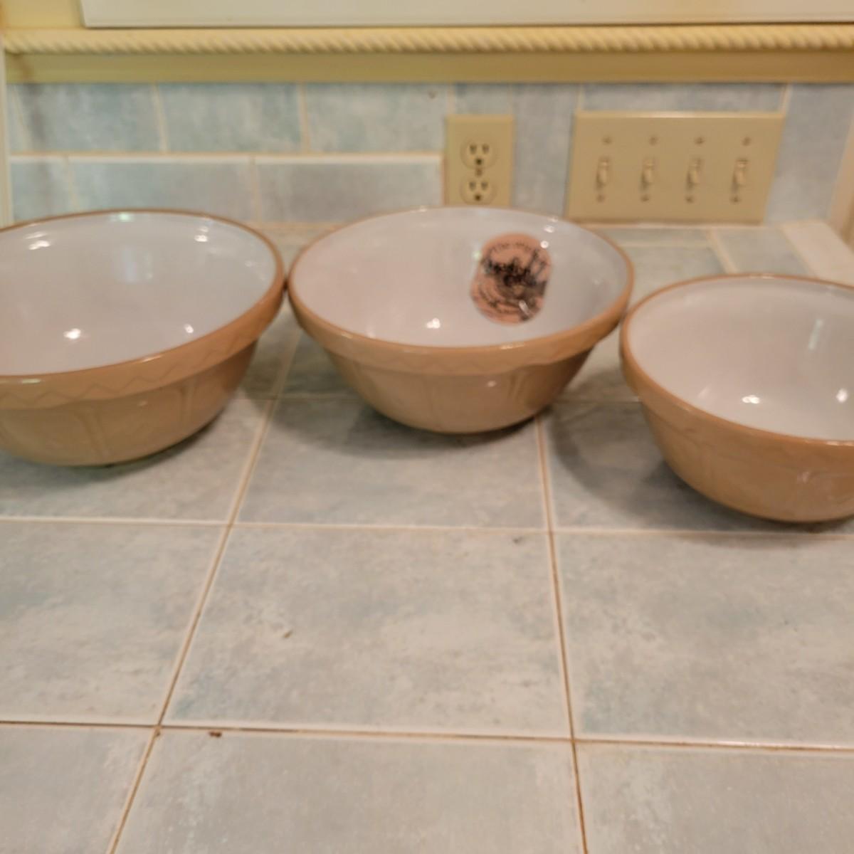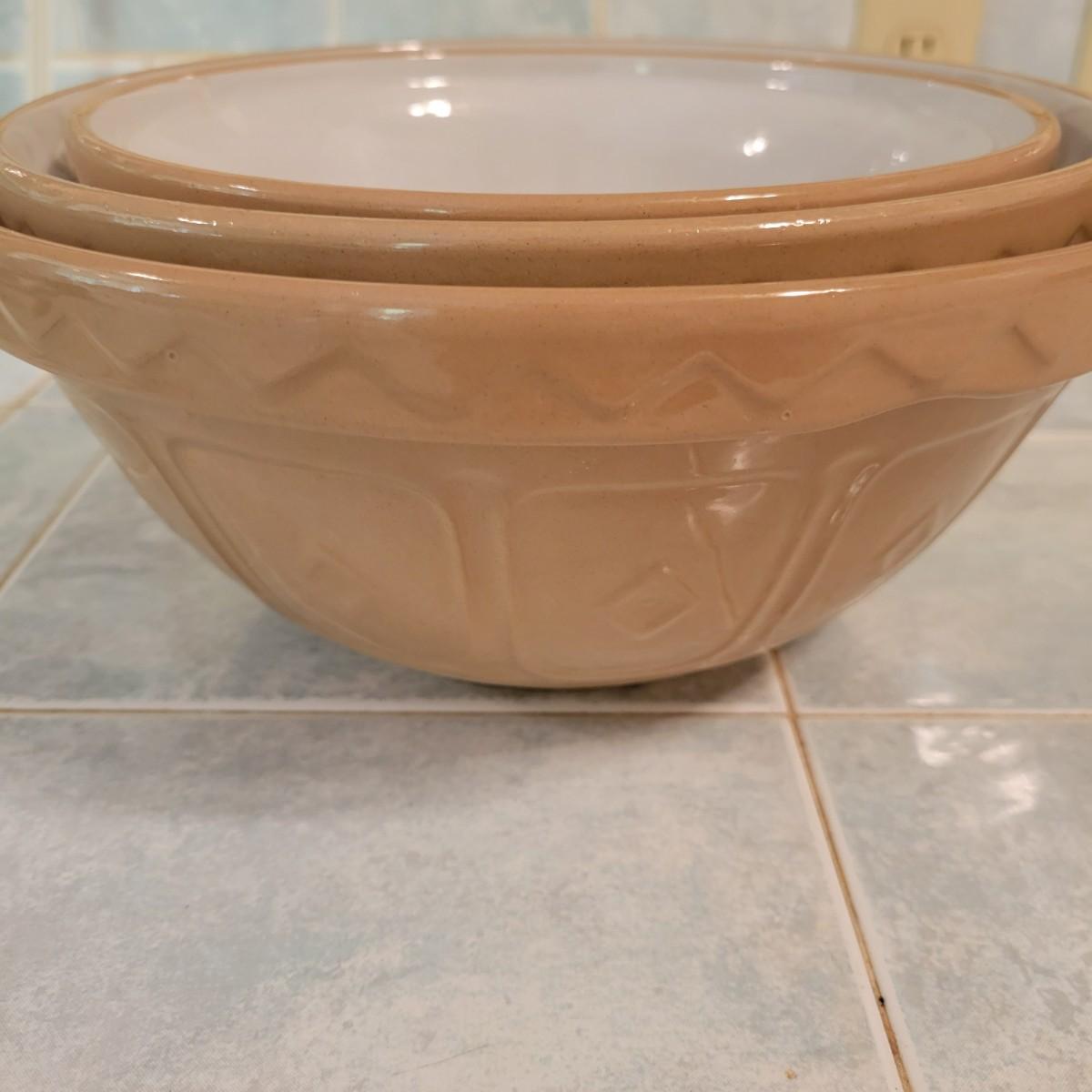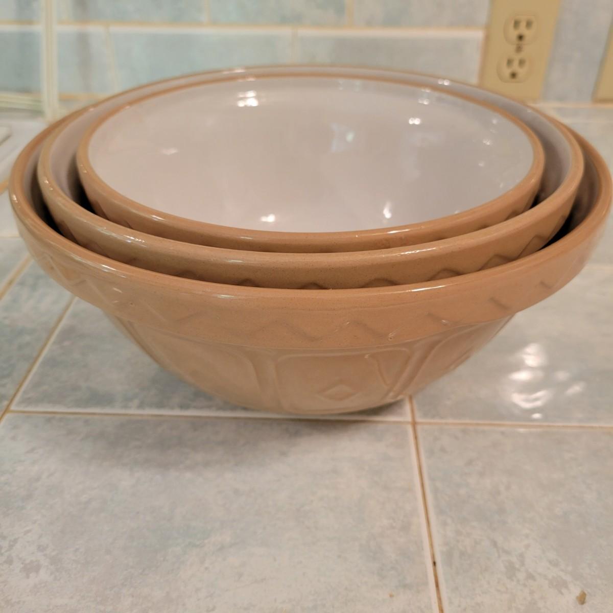 A set of three ceramic nesting mixing bowls in excellent condition. These bowls are the original Mason Cash and Co bowls manufactured by the English Kitchen Bowl Company. These nesting bowls are a tan color with a simple design and are microwave, oven, freezer and dishwasher safe. Largest bowl measures approximately 10.5" x 4.5" Shipping available