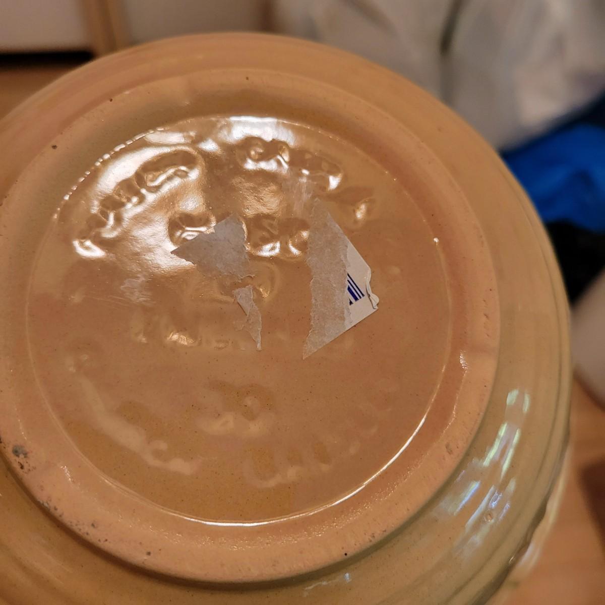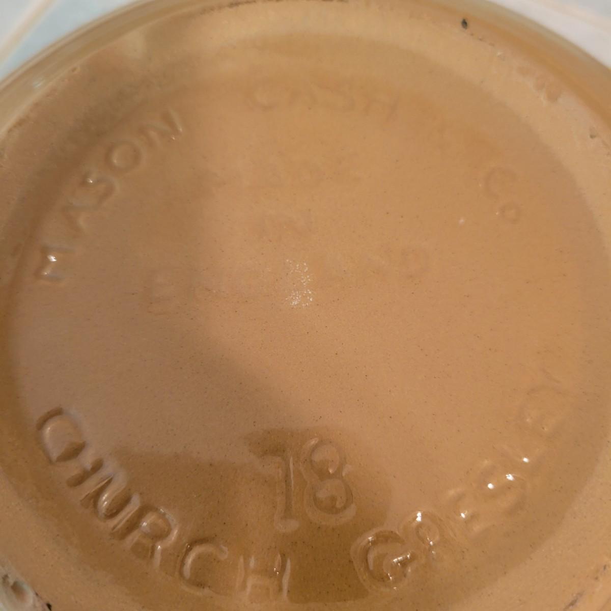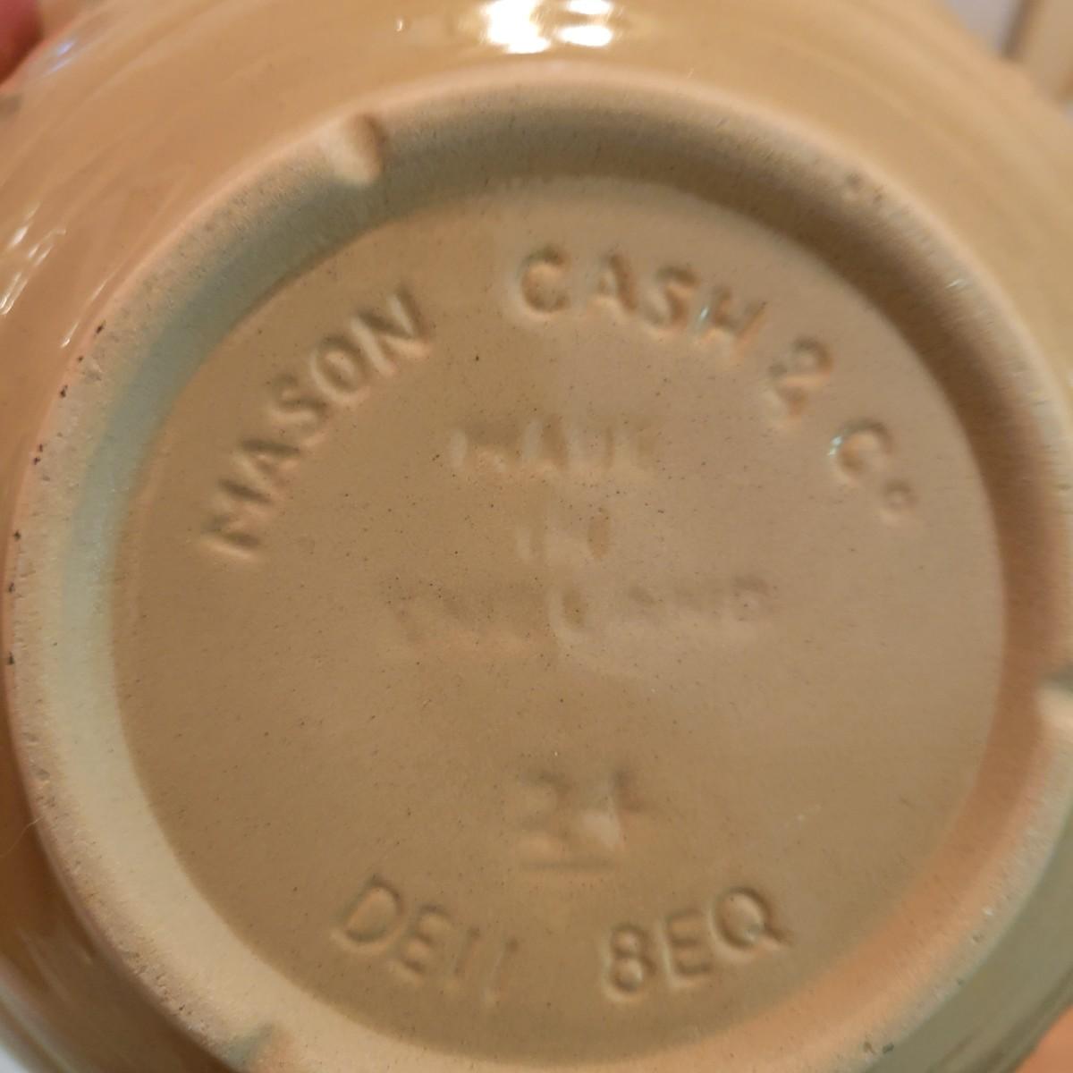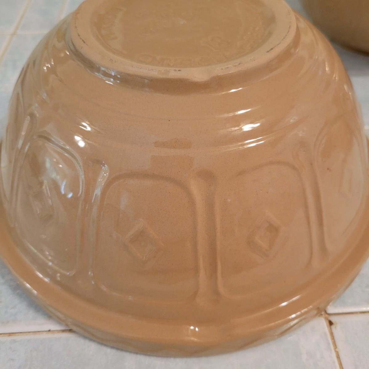 A set of three ceramic nesting mixing bowls in excellent condition. These bowls are the original Mason Cash and Co bowls manufactured by the English Kitchen Bowl Company. These nesting bowls are a tan color with a simple design and are microwave, oven, freezer and dishwasher safe. Largest bowl measures approximately 10.5" x 4.5" Shipping available