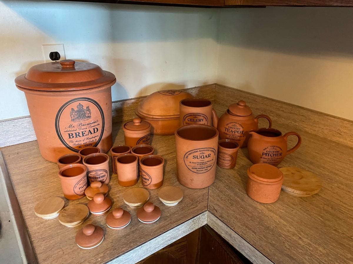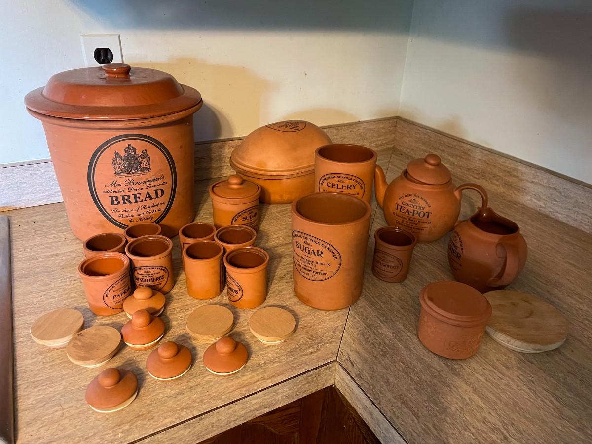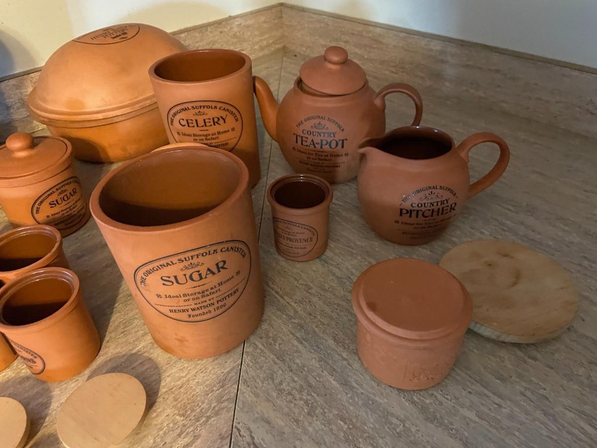 Set includes Henry Watson terracotta spice jars, pitcher, sugar jar, lids etc..