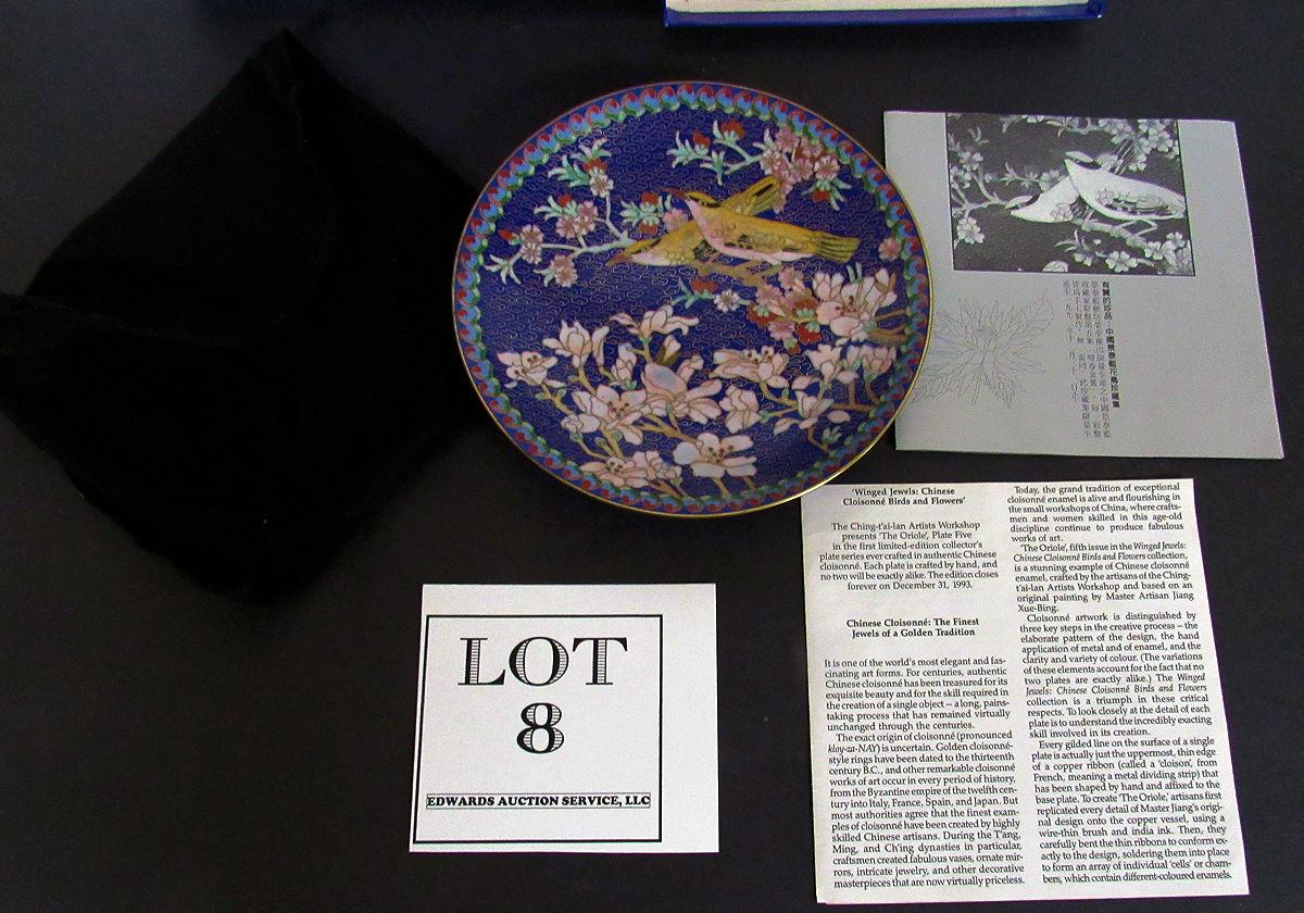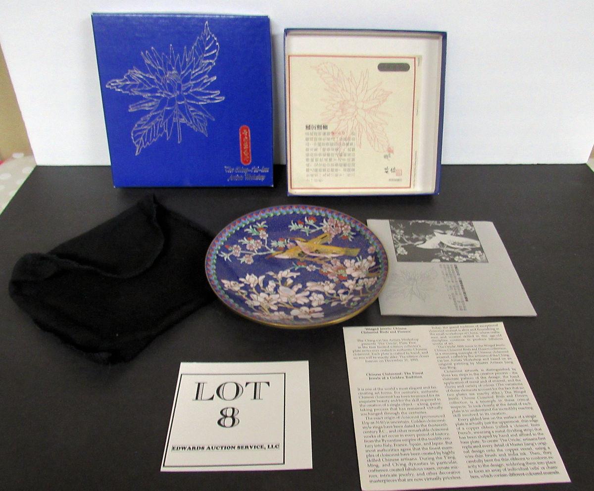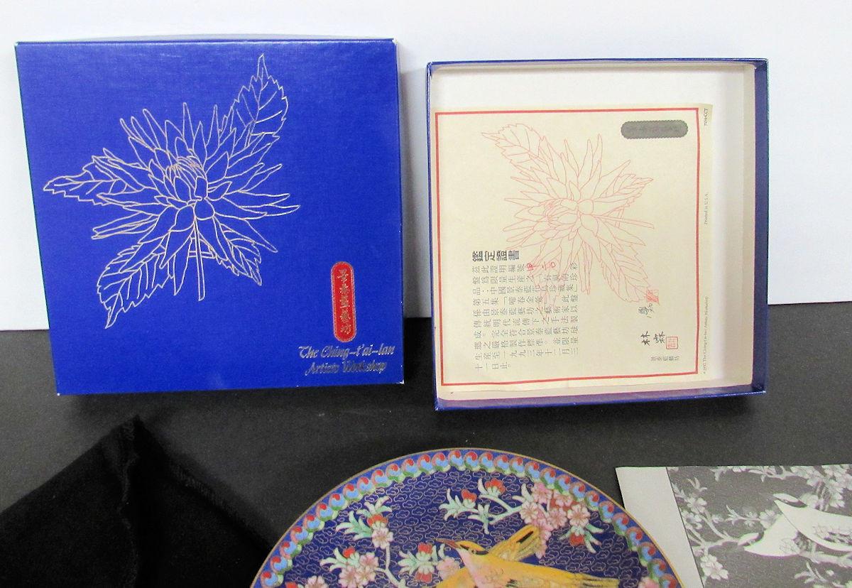 Beautiful plate, beautiful condition. 5th in series of the Winged Jewels Chinese Cloisonne Plates Series. These plates were in limited production. This one ended on 12/31/93. Comes complete in original box with package inserts. Shipping is available at shipping cost plus $5.00 handling fee on up to 8 items, $10.00 handling fee on 9 or more items.