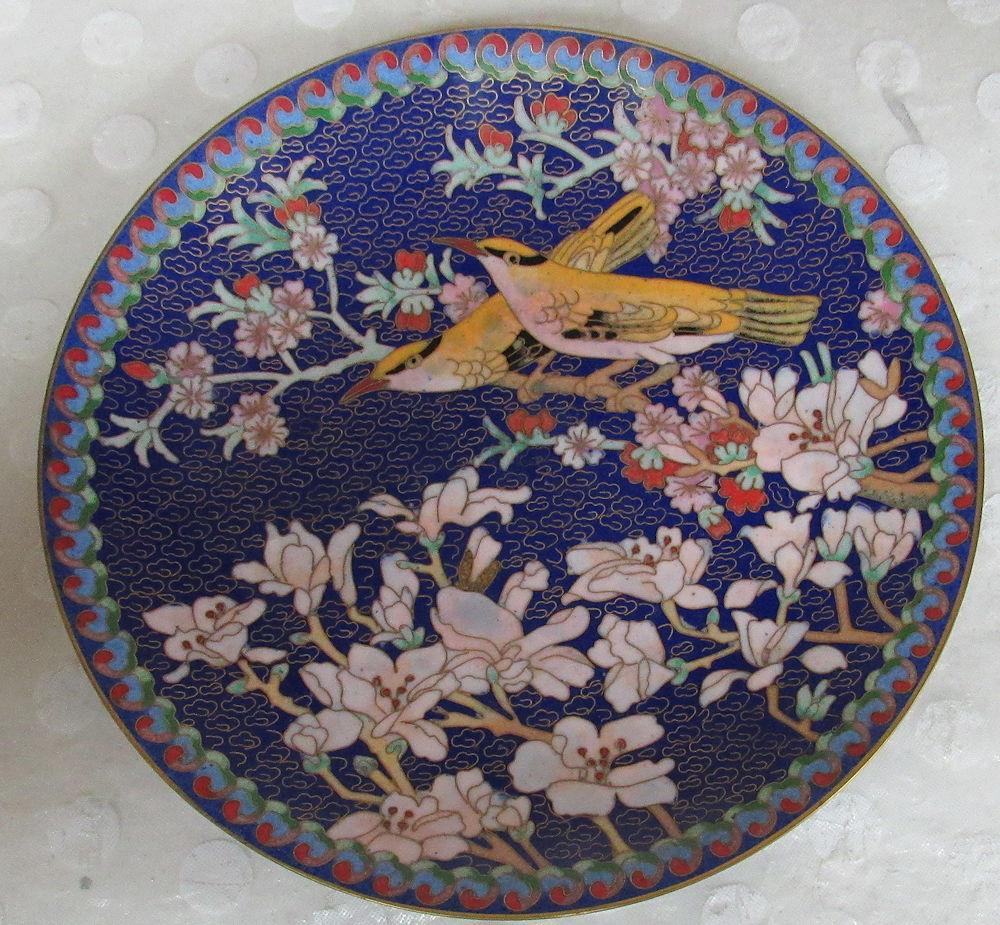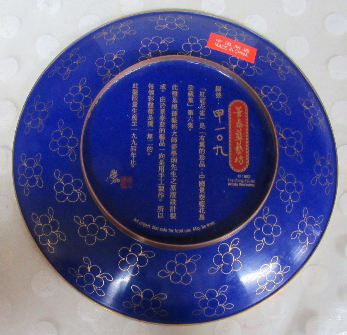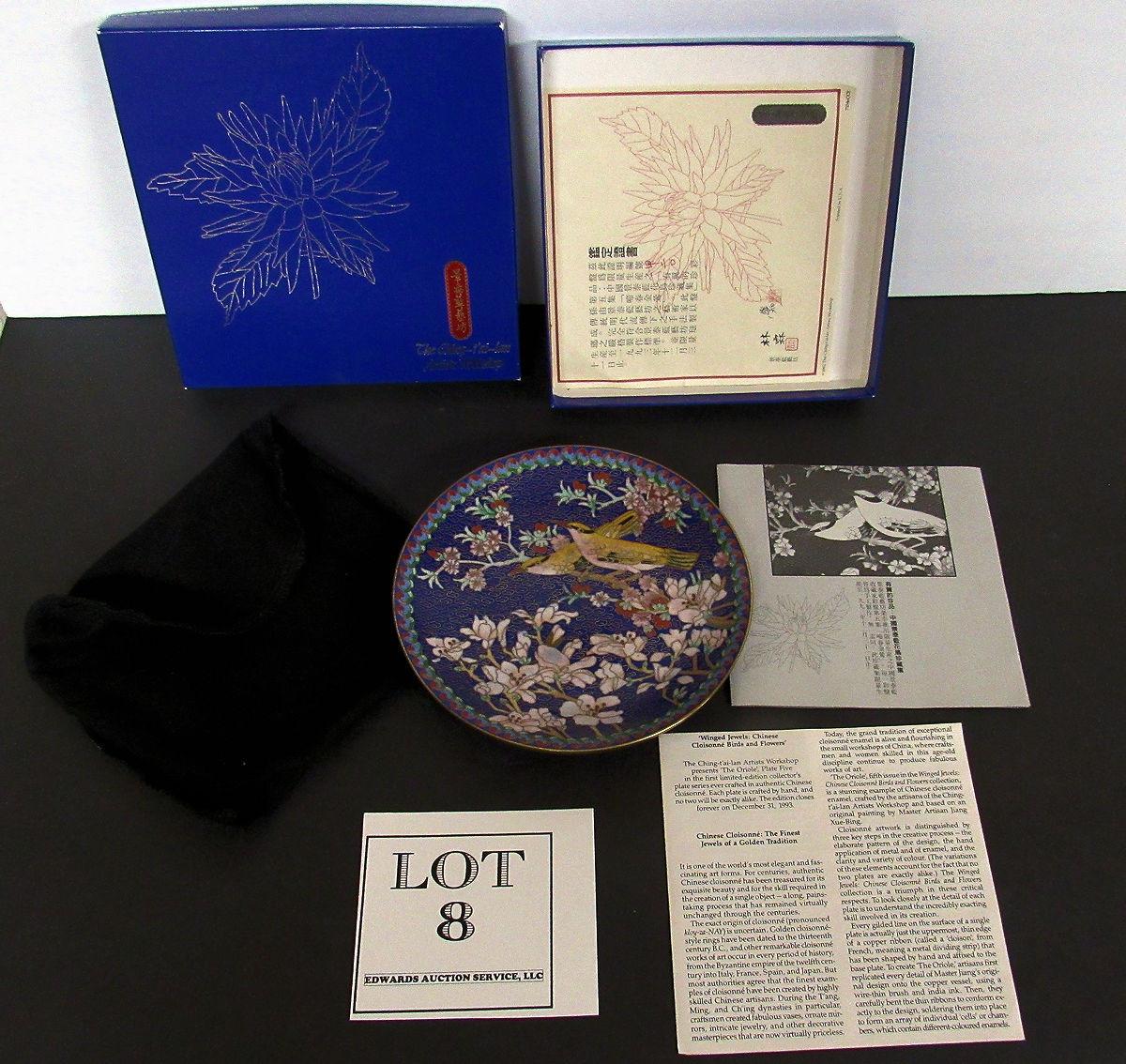 Beautiful plate, beautiful condition. 5th in series of the Winged Jewels Chinese Cloisonne Plates Series. These plates were in limited production. This one ended on 12/31/93. Comes complete in original box with package inserts. Shipping is available at shipping cost plus $5.00 handling fee on up to 8 items, $10.00 handling fee on 9 or more items.
