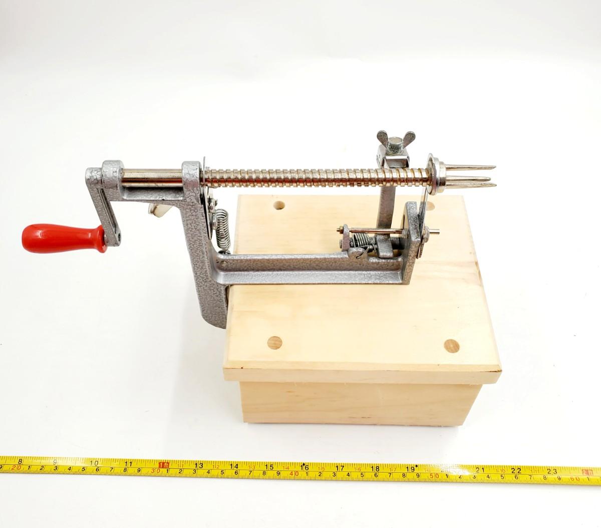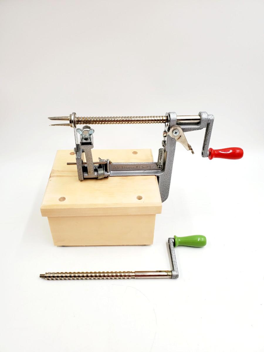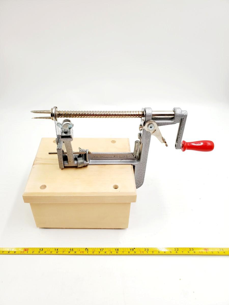 The Pampered Chef apple peeler/corer with thick slice green handle attachment and wooden stand.