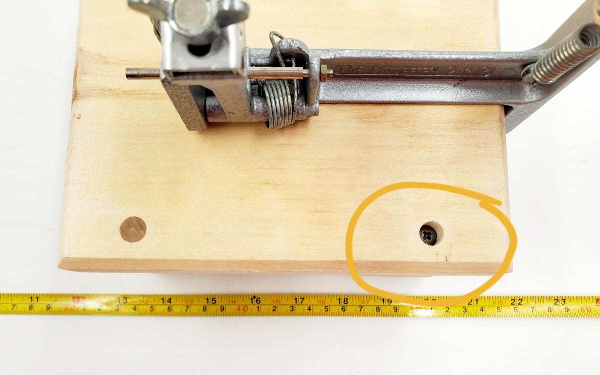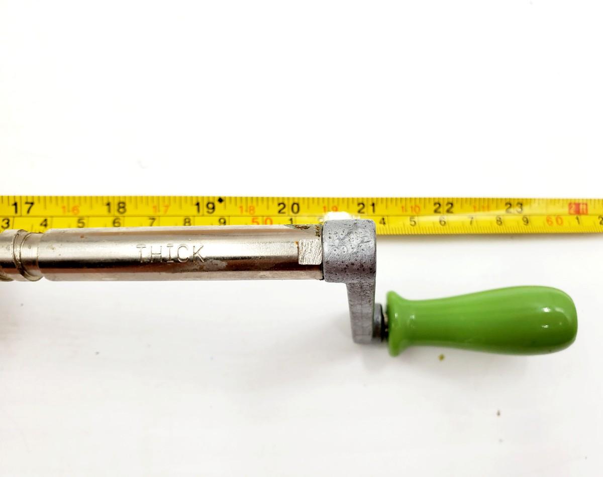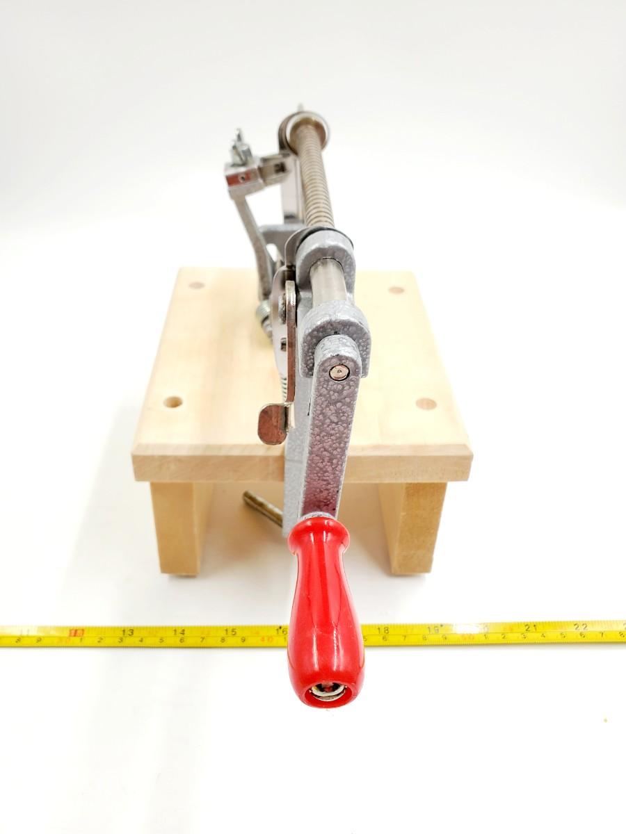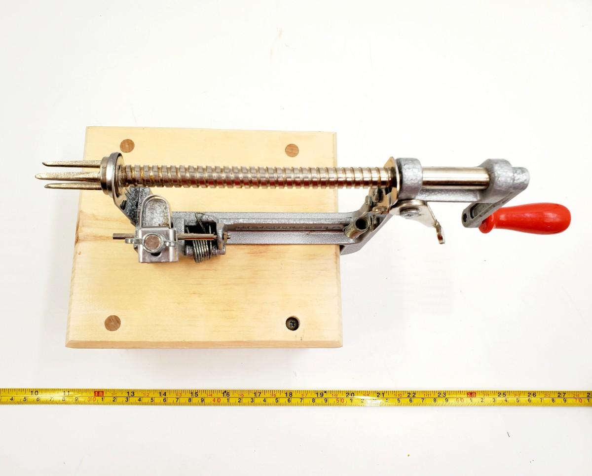 The Pampered Chef apple peeler/corer with thick slice green handle attachment and wooden stand.