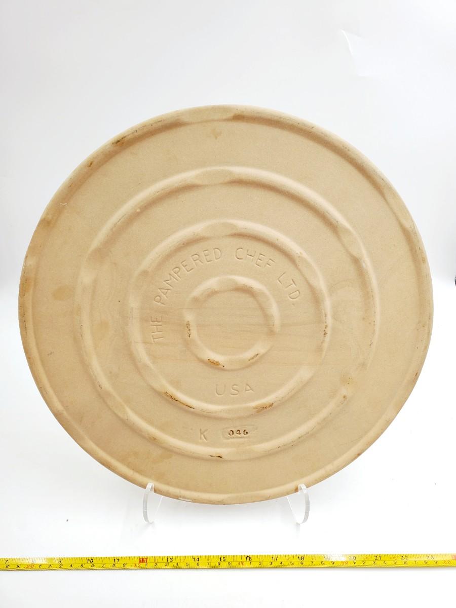 The Pampered Chef~USA K 046 15in round stoneware. Does have some black marks see photos, good overall condition.