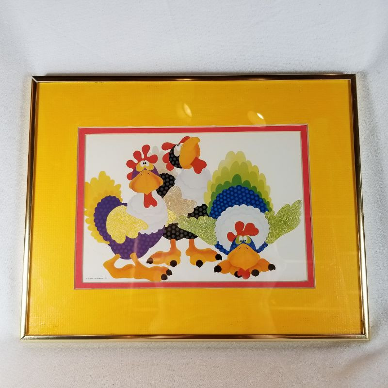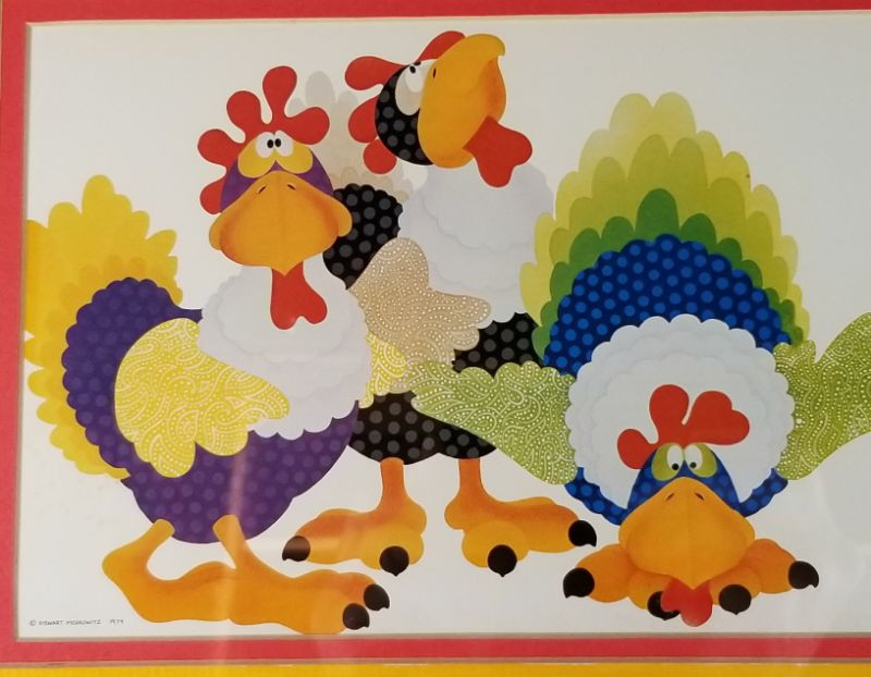 "The Peaking Chickens" is a wonderfully whimsical print by listed artist Stewart Moskowitz. A very colorful and fun print to adorn your home. It is very well framed with an overall size of 14-inches wide X 11-inches tall. Copyright 1974.