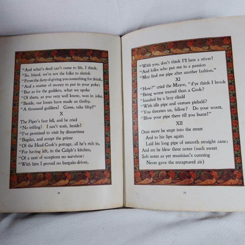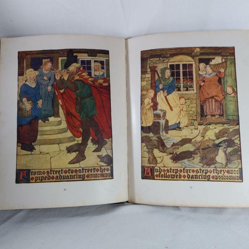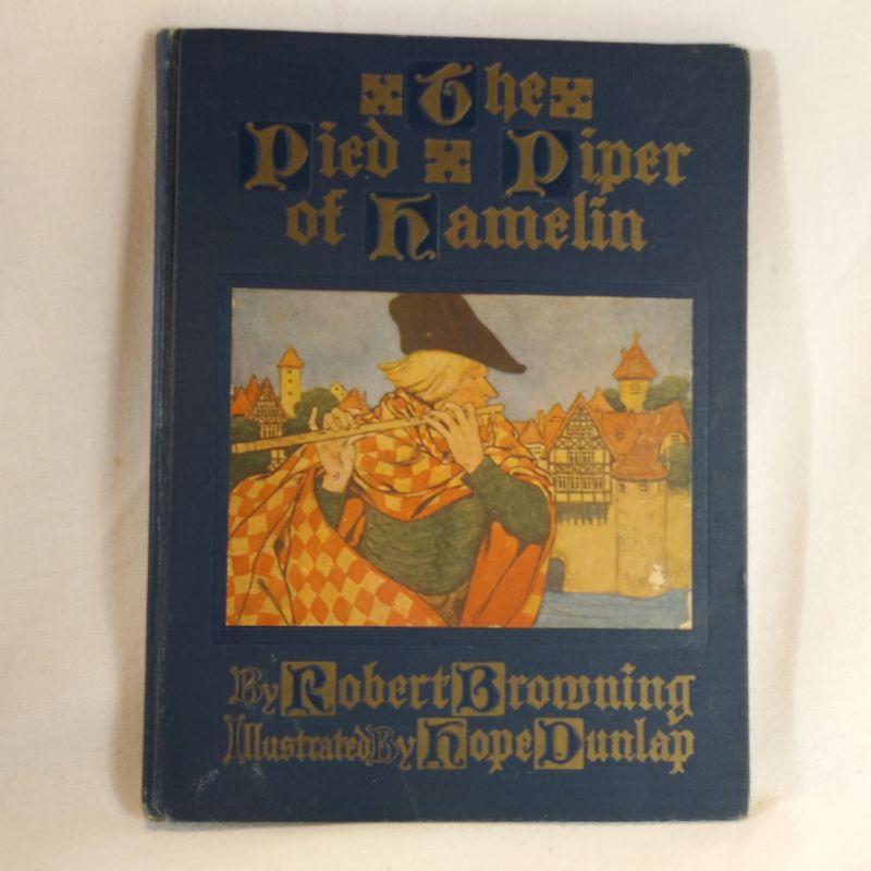 "The Pied Piper of Hamelin" by Robert Browning/Illustrated by Hope Dunlap 1910. Rand McNally, 55 pages. Beautiful art on most pages with some full page color plates interspersed. Front internal board on bottom edge is damaged as well as same on facing flyleaf. Internally is VERY GOOD. Externally shows worn corners but consistent for a 107 year old book. VERY GOOD.