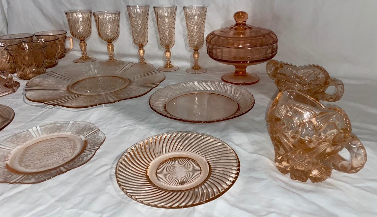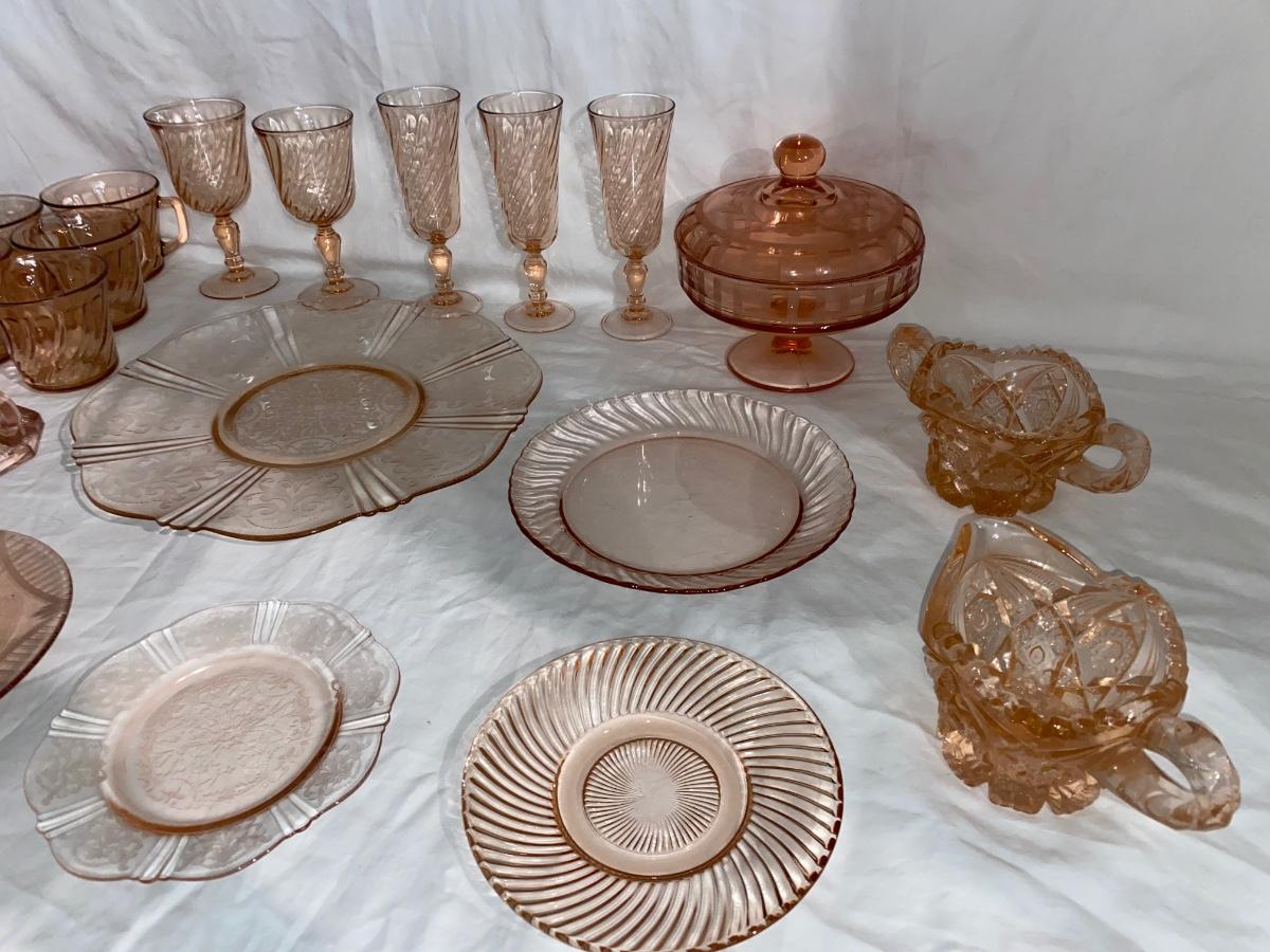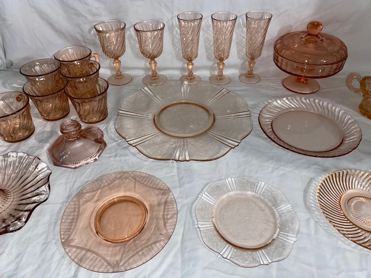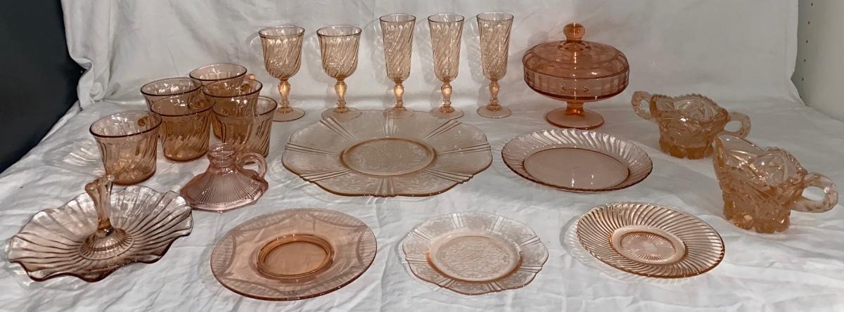 Assorted collection of pink glass. Several of the swirl cups/glasses are marked Forte Crisa Mexico. A few of the swirl glasses are marked “France.” All preowned and sold as is