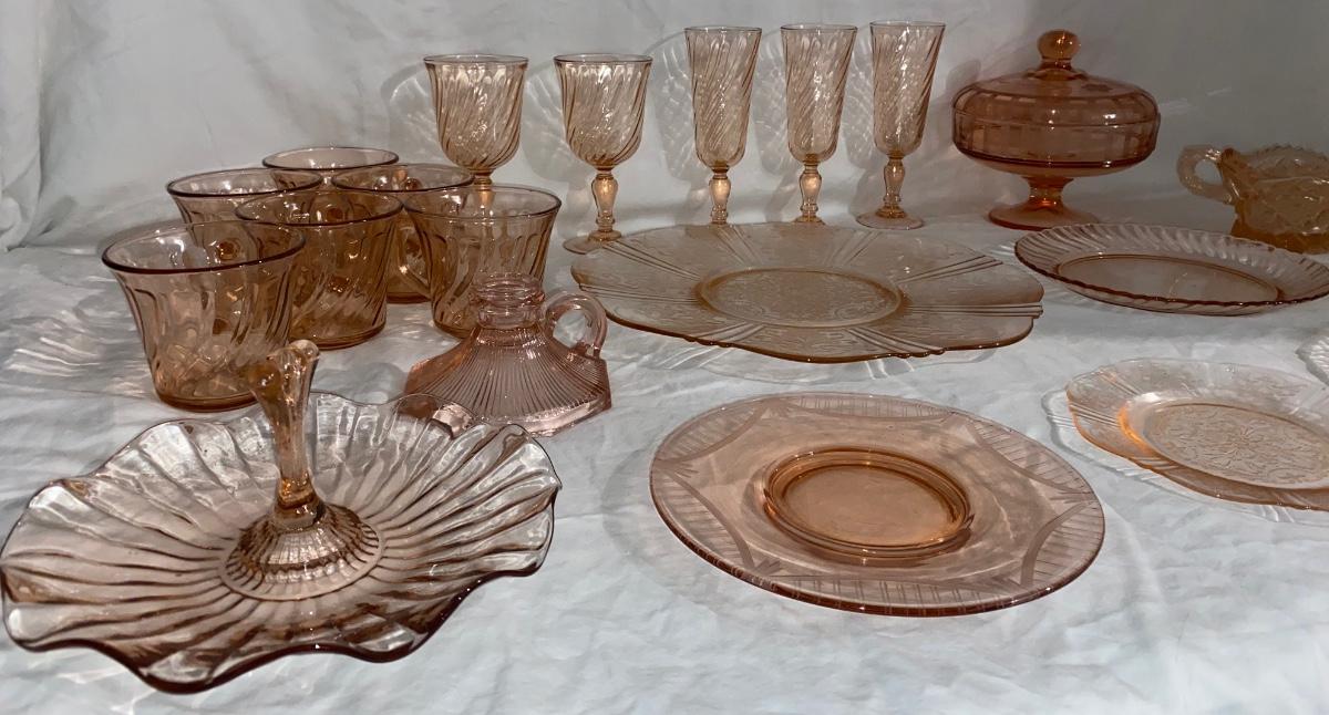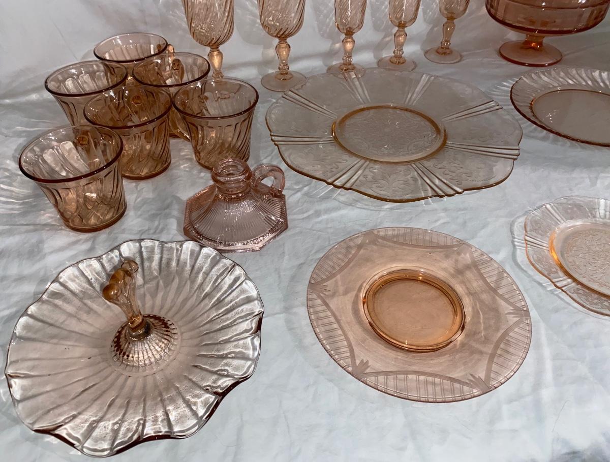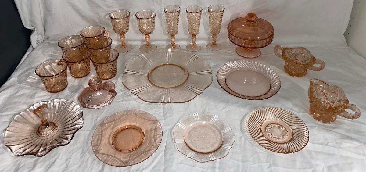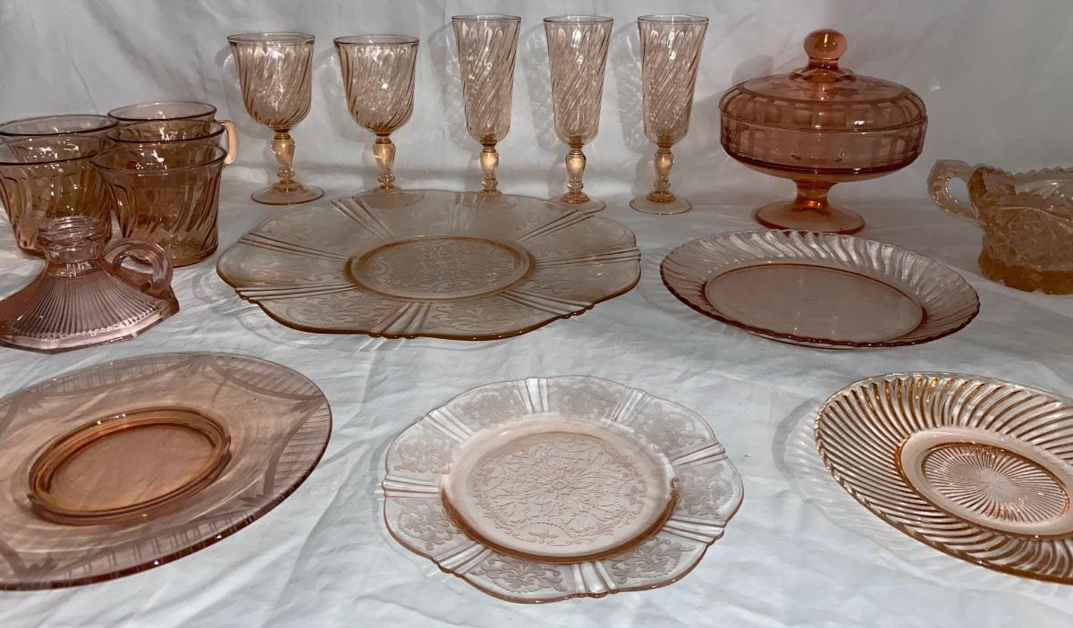 Assorted collection of pink glass. Several of the swirl cups/glasses are marked Forte Crisa Mexico. A few of the swirl glasses are marked “France.” All preowned and sold as is