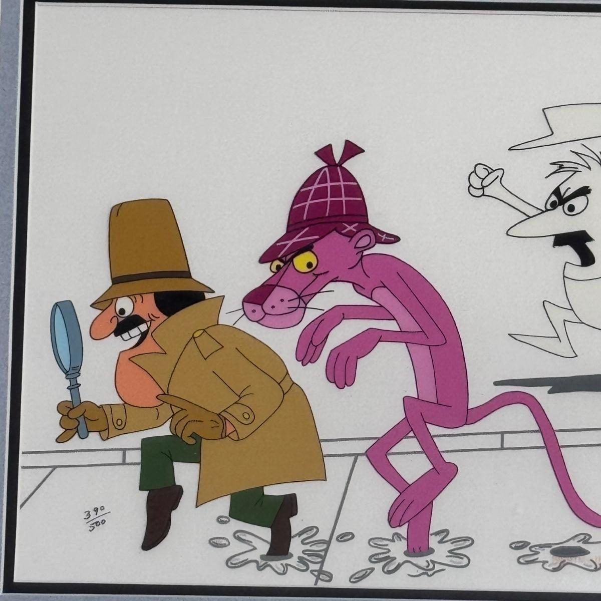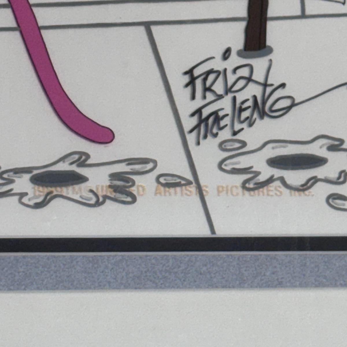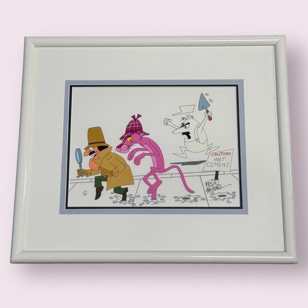 This lot includes one cel from the “wet cement” scene from the animation “The Pink Panther.” It is signed in the bottom right corner by Friz Freleng. The art is protected with a layer of glass, triple matting, and a wooden frame that’s has a white, plastic protective coating. The frame measures 20” x 17.5”H. The original invoice and certification of authenticity is included - see the last few pictures.