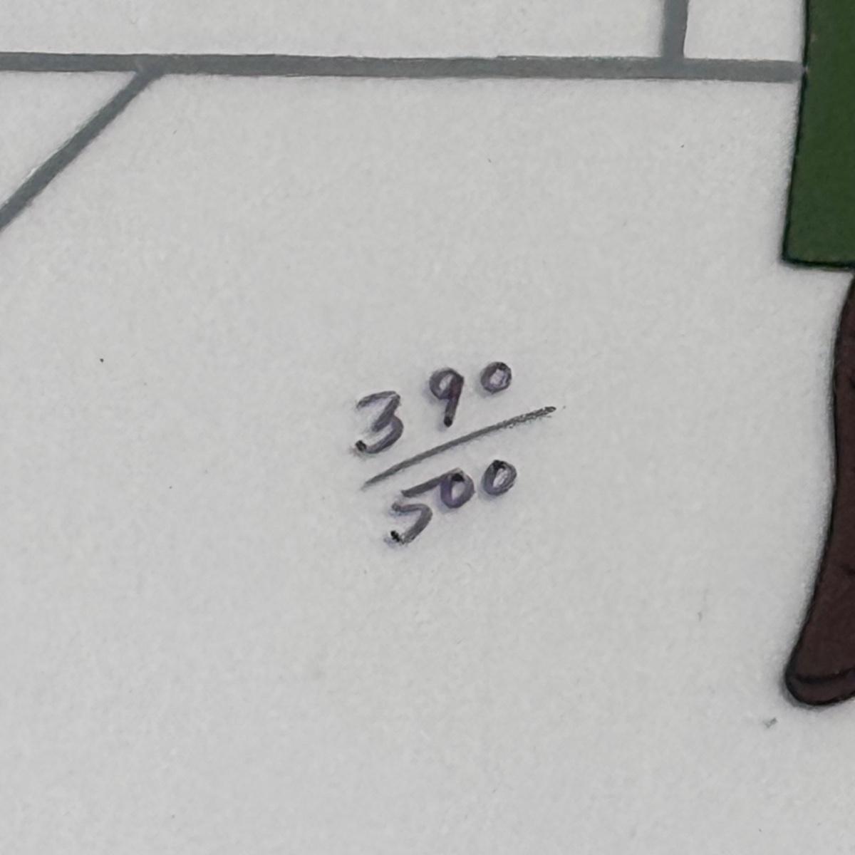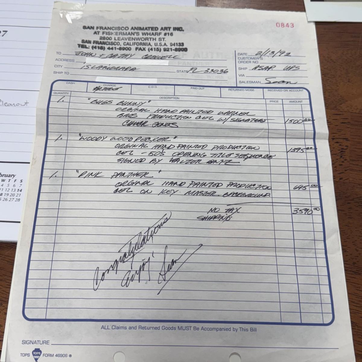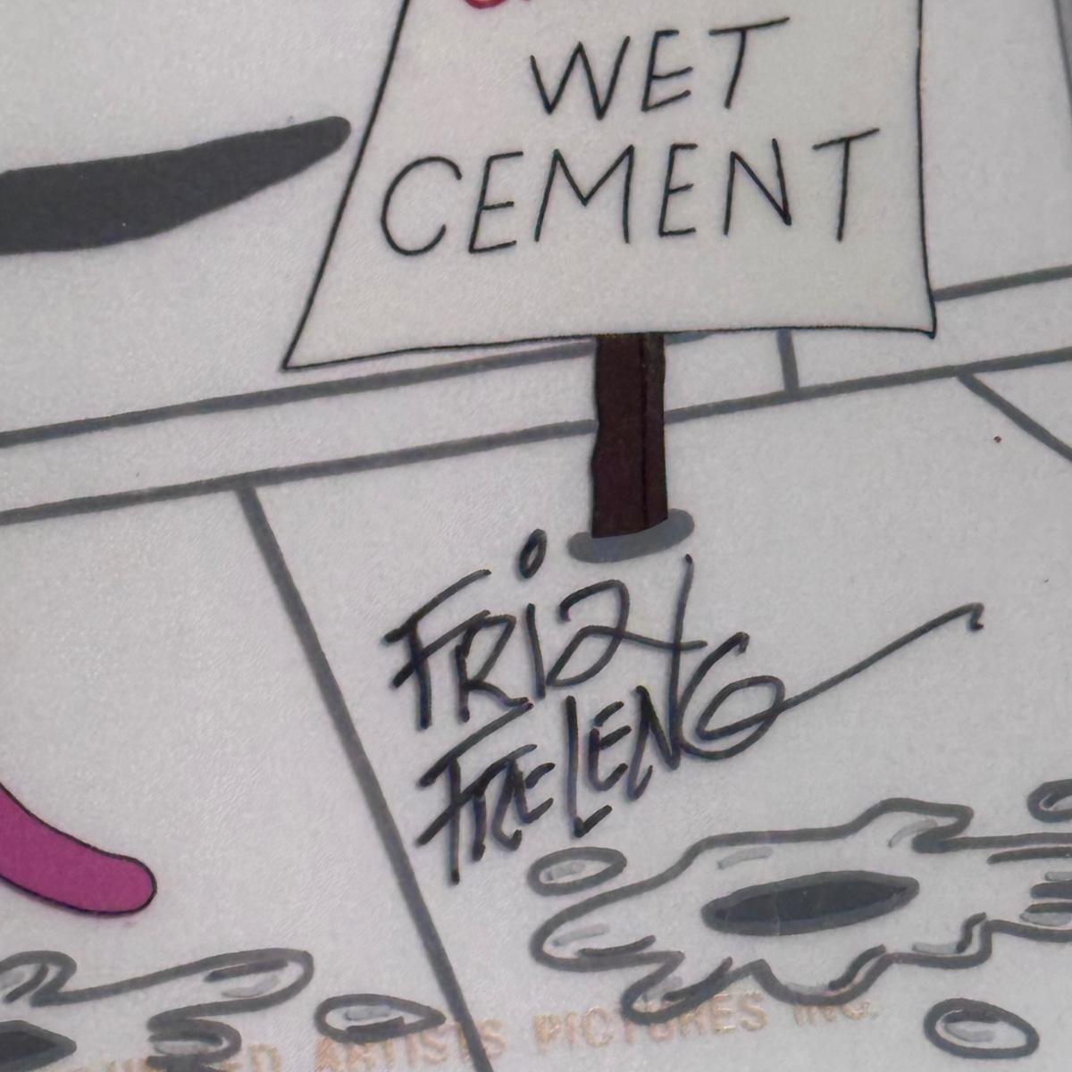 This lot includes one cel from the “wet cement” scene from the animation “The Pink Panther.” It is signed in the bottom right corner by Friz Freleng. The art is protected with a layer of glass, triple matting, and a wooden frame that’s has a white, plastic protective coating. The frame measures 20” x 17.5”H. The original invoice and certification of authenticity is included - see the last few pictures.
