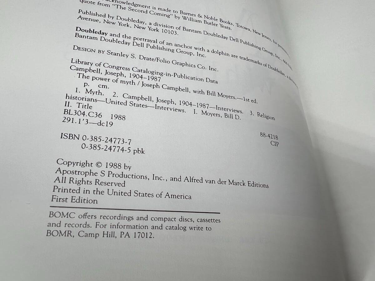 The Power of Myth History Book by Mythologist Joseph Campbell, there is no signifncant damage to the book and is in good readable condition. Check pictures for more details and for sizing.