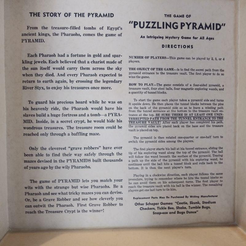 Game Collectors Alert! "The Puzzling Pyramid" - Vintage Game. This game looks to be complete. Produced by Schaper Creations. The box shows age. It measures 10 3/4-inches square X 3 3/4-inches tall. A truly different game for family game night.