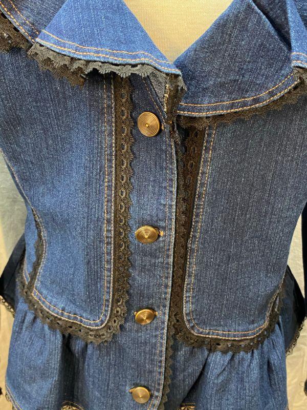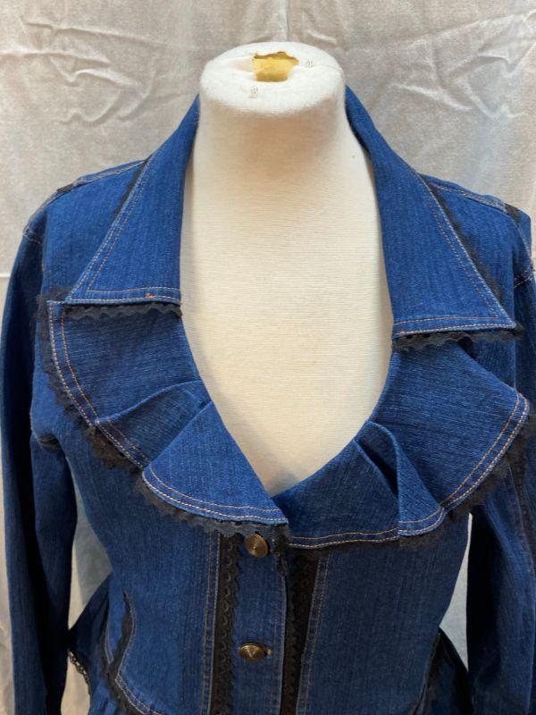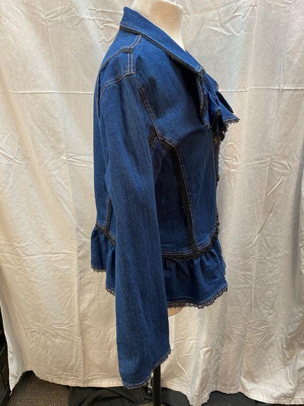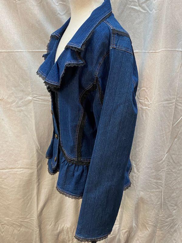 The Pyramid Collection denim jacket. Medium blue wash with black lace trim. Ruffled neckline and waist. Has a fitted look to it. Size 1X. Good condition.