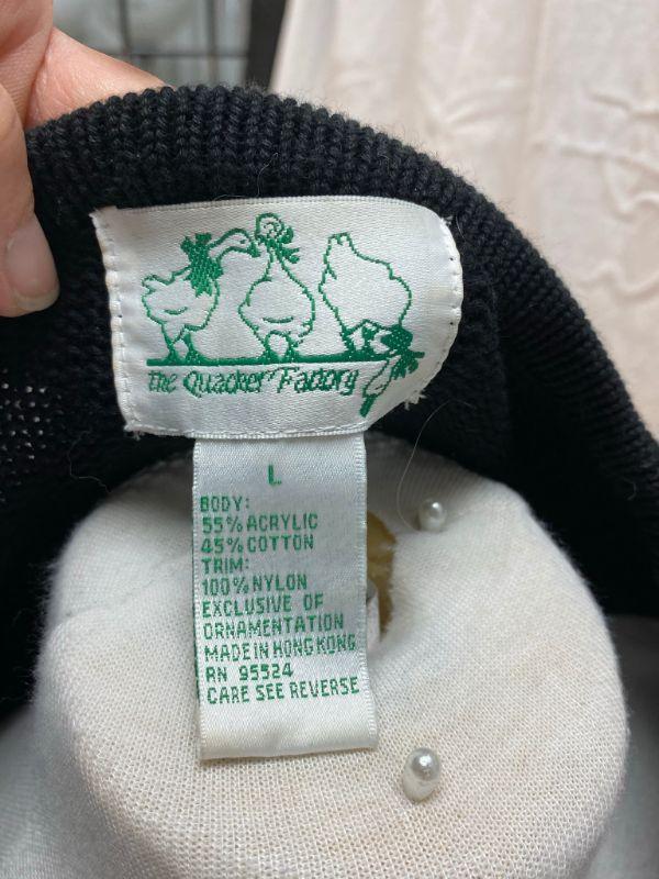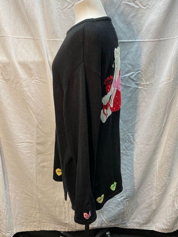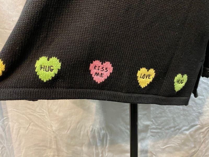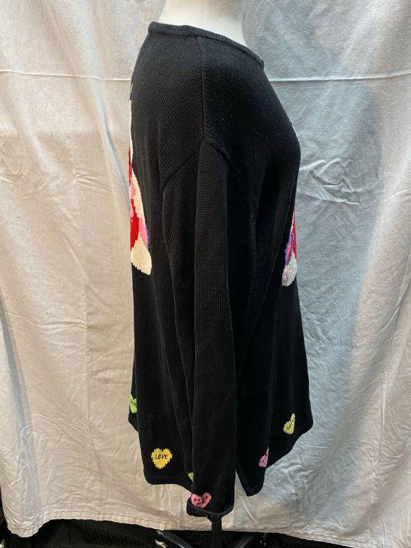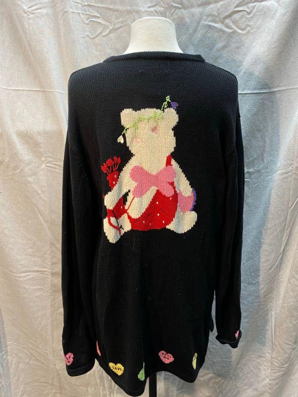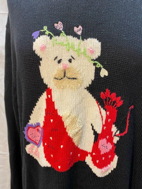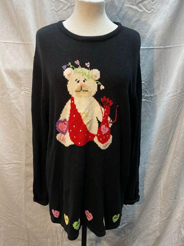 The Quacker Factory Valentine's cupid bear sweater. Black tunic style sweater. Candy hearts around the hem. Light makeup marks on the inside of neckline, may come out when washed, only noticeable if you turn out neck. Size large.