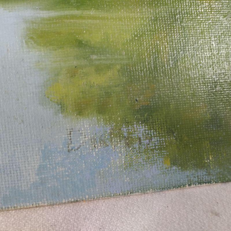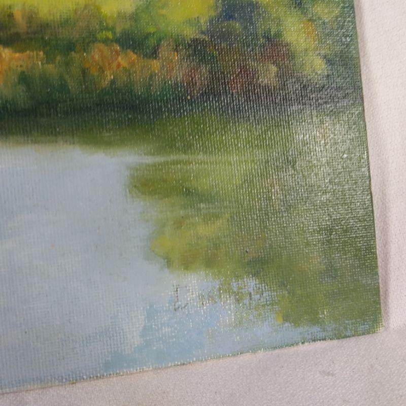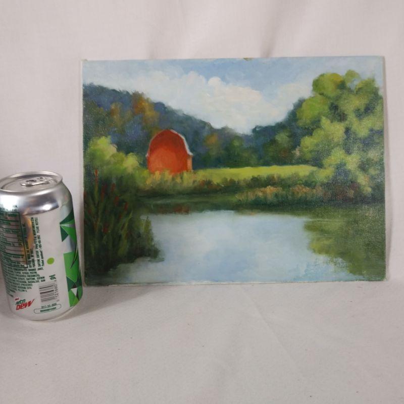 This is a very nice small oil painting on canvas board of a Red Barn by a stream or pond. We think it is a southern Indiana scene but are not sure of that. Unframed, it is 12-inches tall X 15-inches wide. Shows a little wear from being moved around a lot. Signed by the artist very faintly and not ledgible.