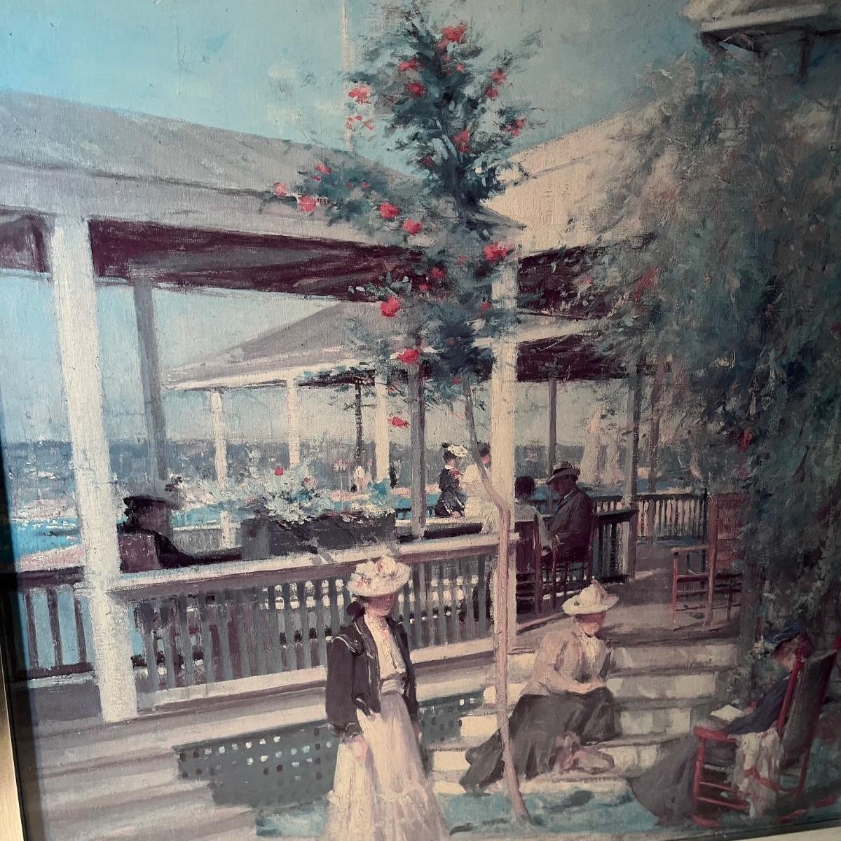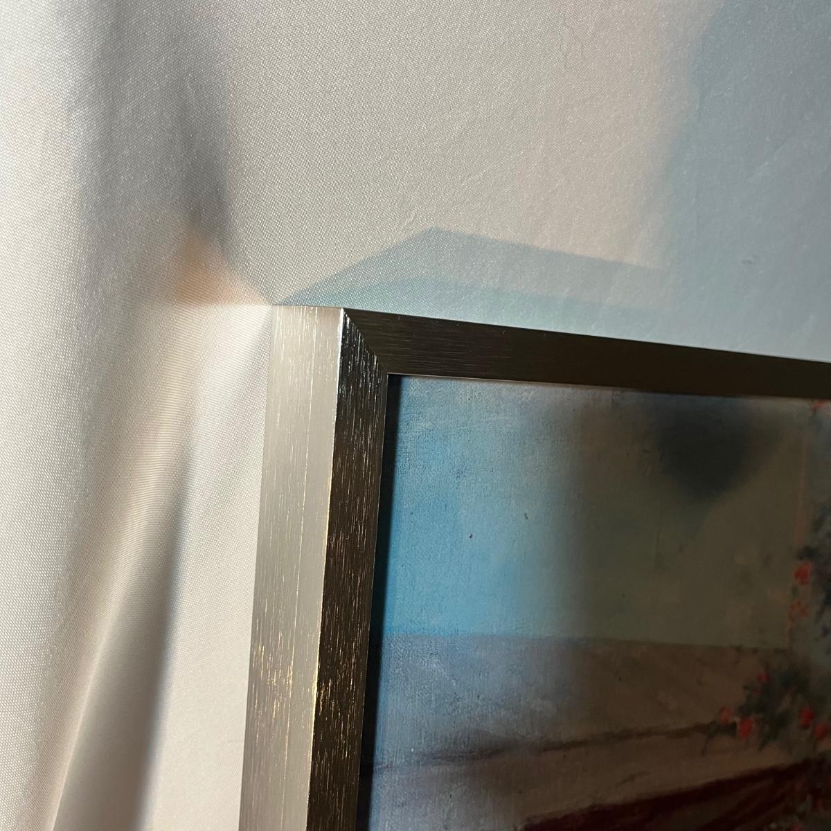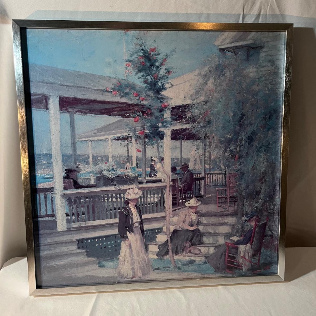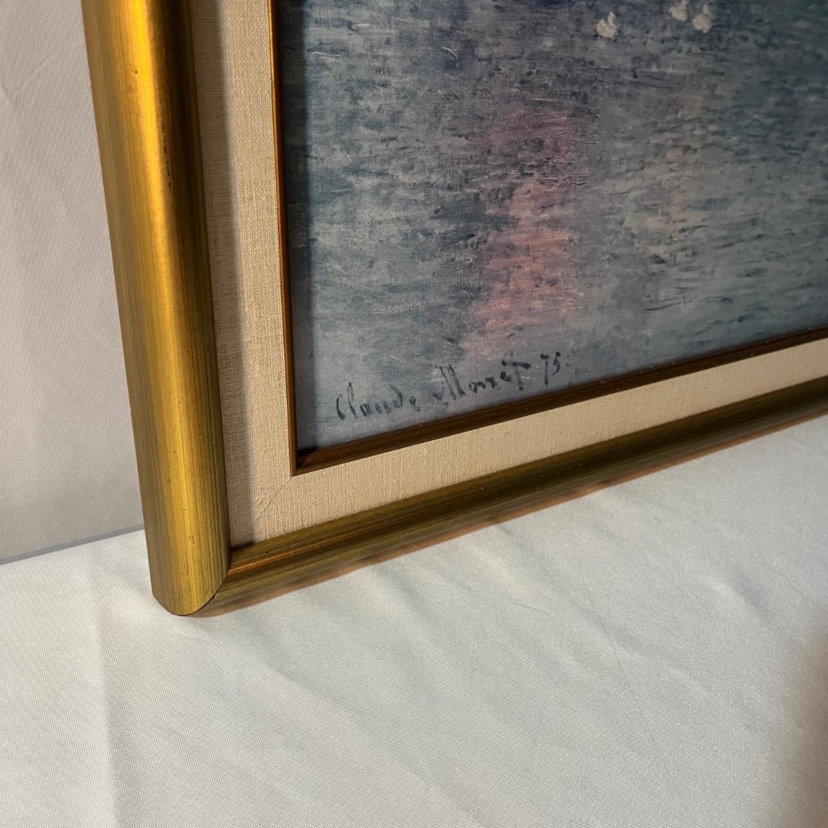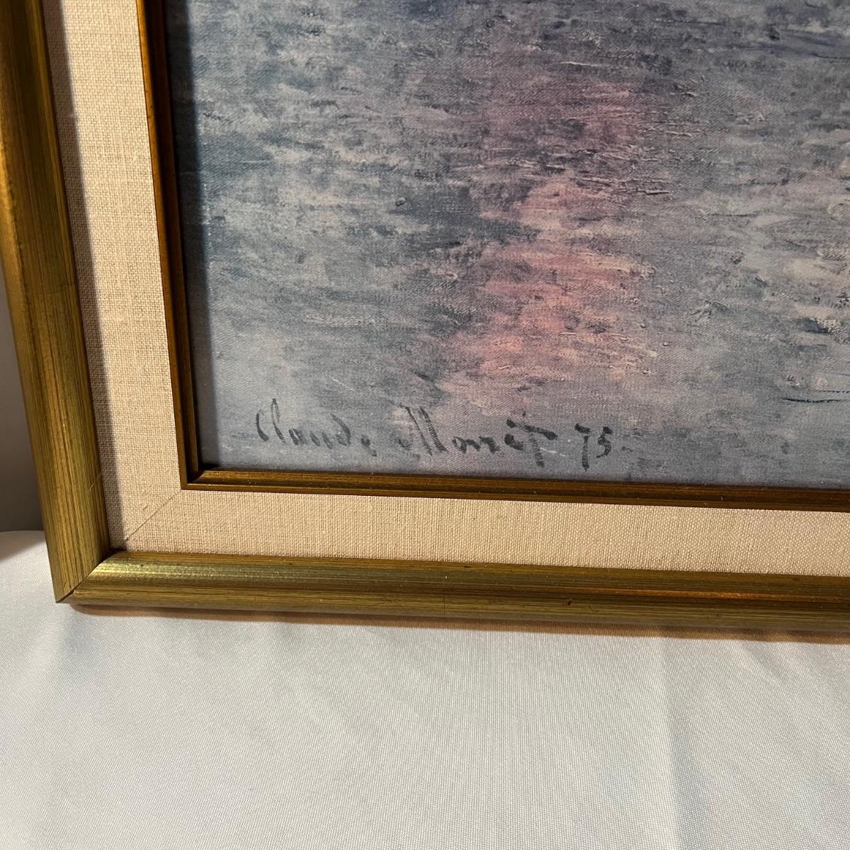 Lot includes a Claude Monet wooden framed print titled “The Red Boats” that is under glass and a metal framed seaside print that is also under glass. Largest frame measures 26” x 33”.