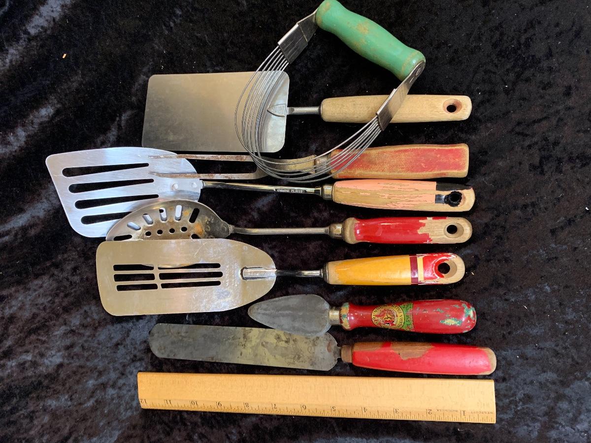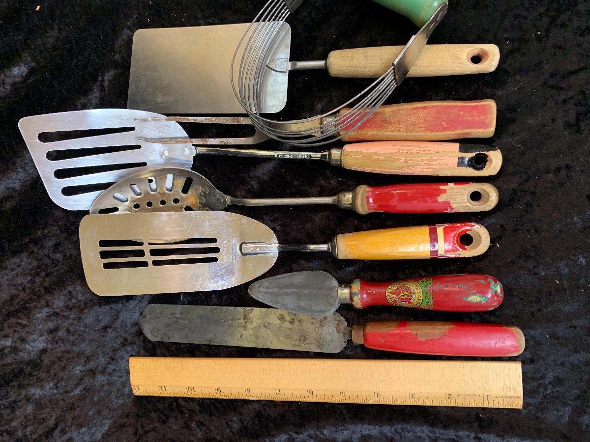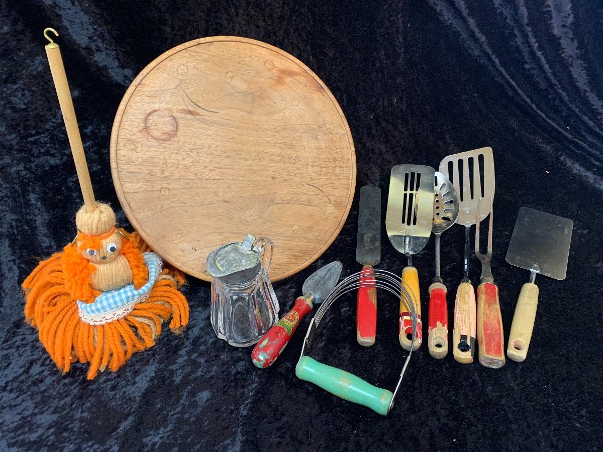 A lazy suzy (works great, very smooth), quaint syrup pitcher, dough tool, knife sharpener, (6) utensils and funky dust mop.