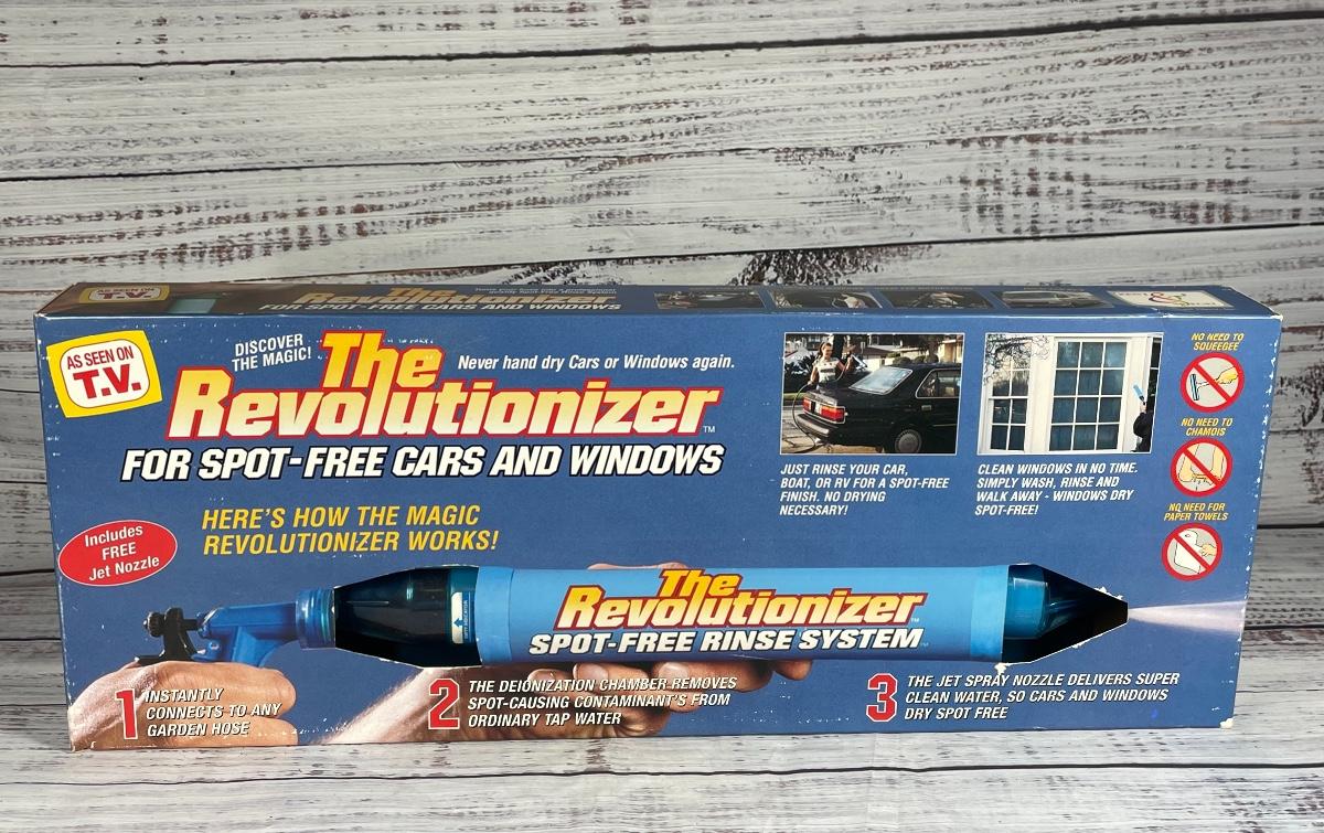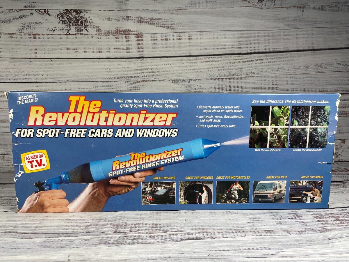 As seen on TV product. Item is in good condition and comes in it’s original package. With this Revolutionizer, there is no need to hand dry cars or windows. It hooks up to any garden hose.