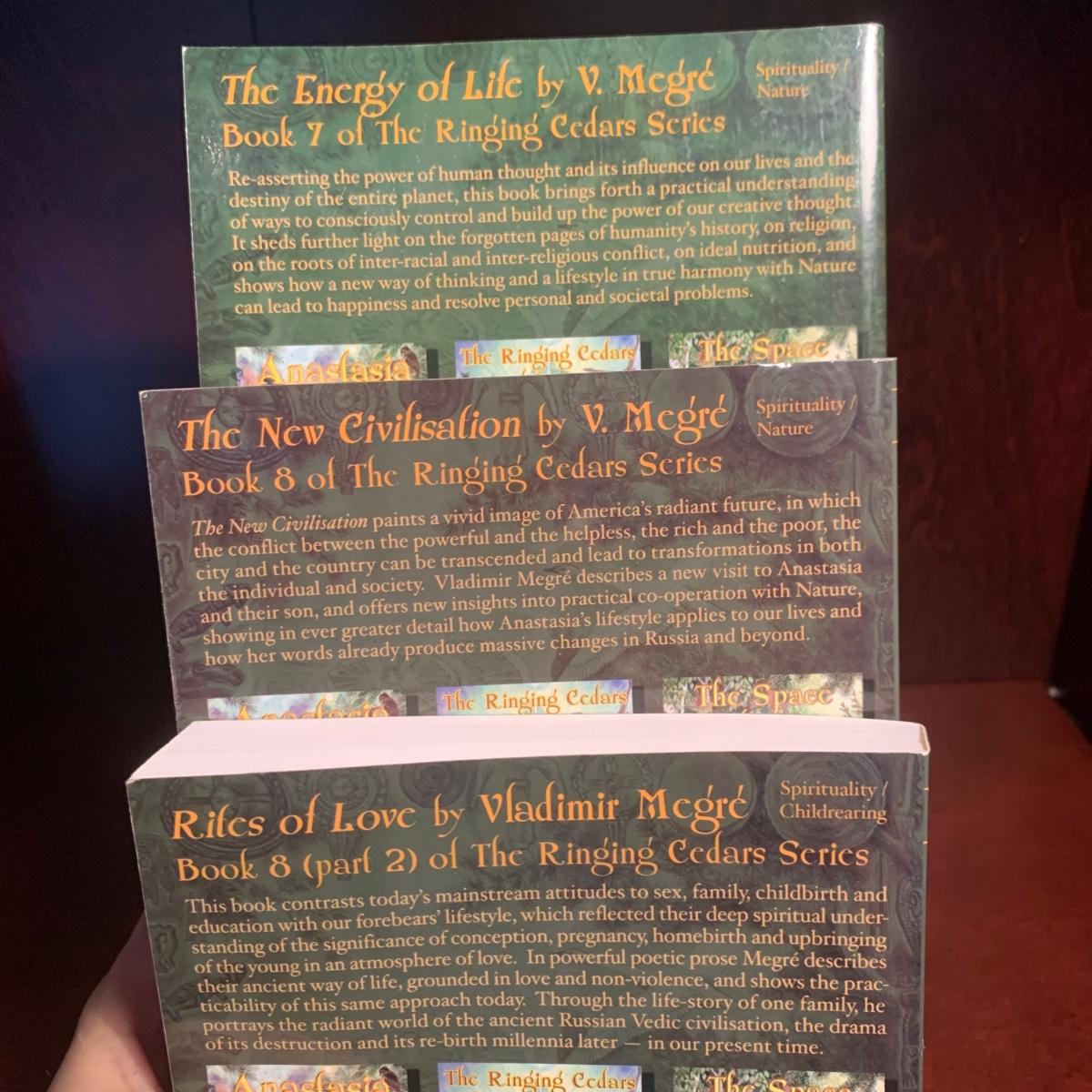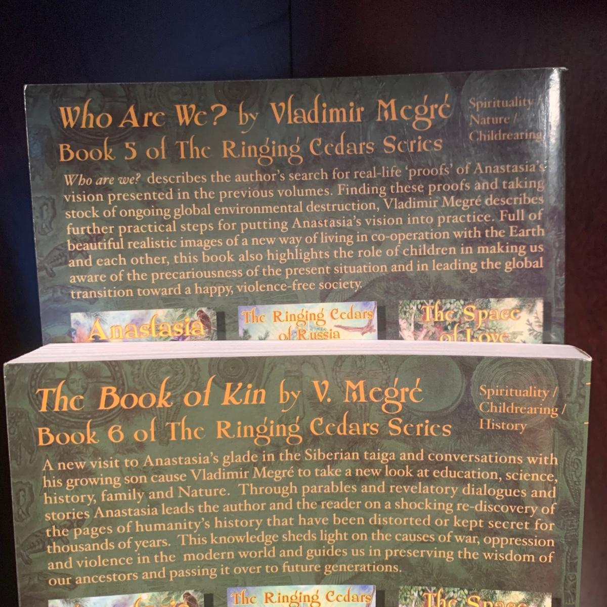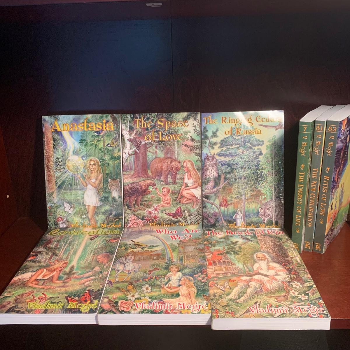 Nine volume paperback set of “˜The Ringing Cedars Series’ by Vladimir Megré. The books are well intact but have been well-loved; many pages are dog-eared and there is wear to some of the covers, more so on the earlier volumes.