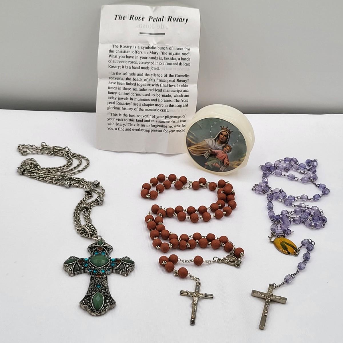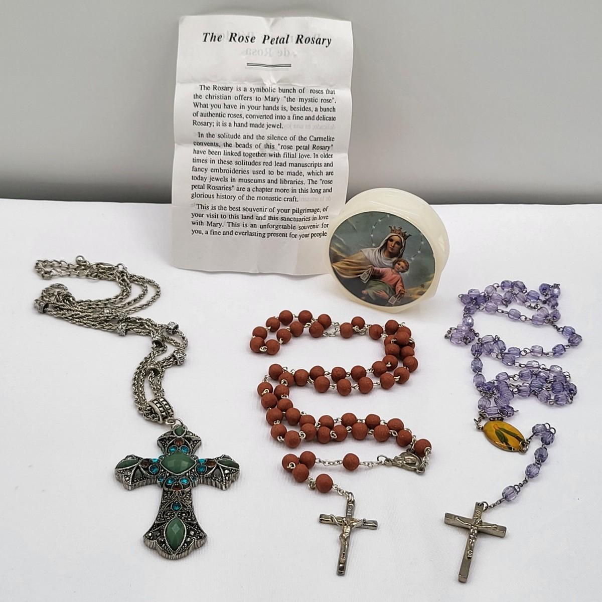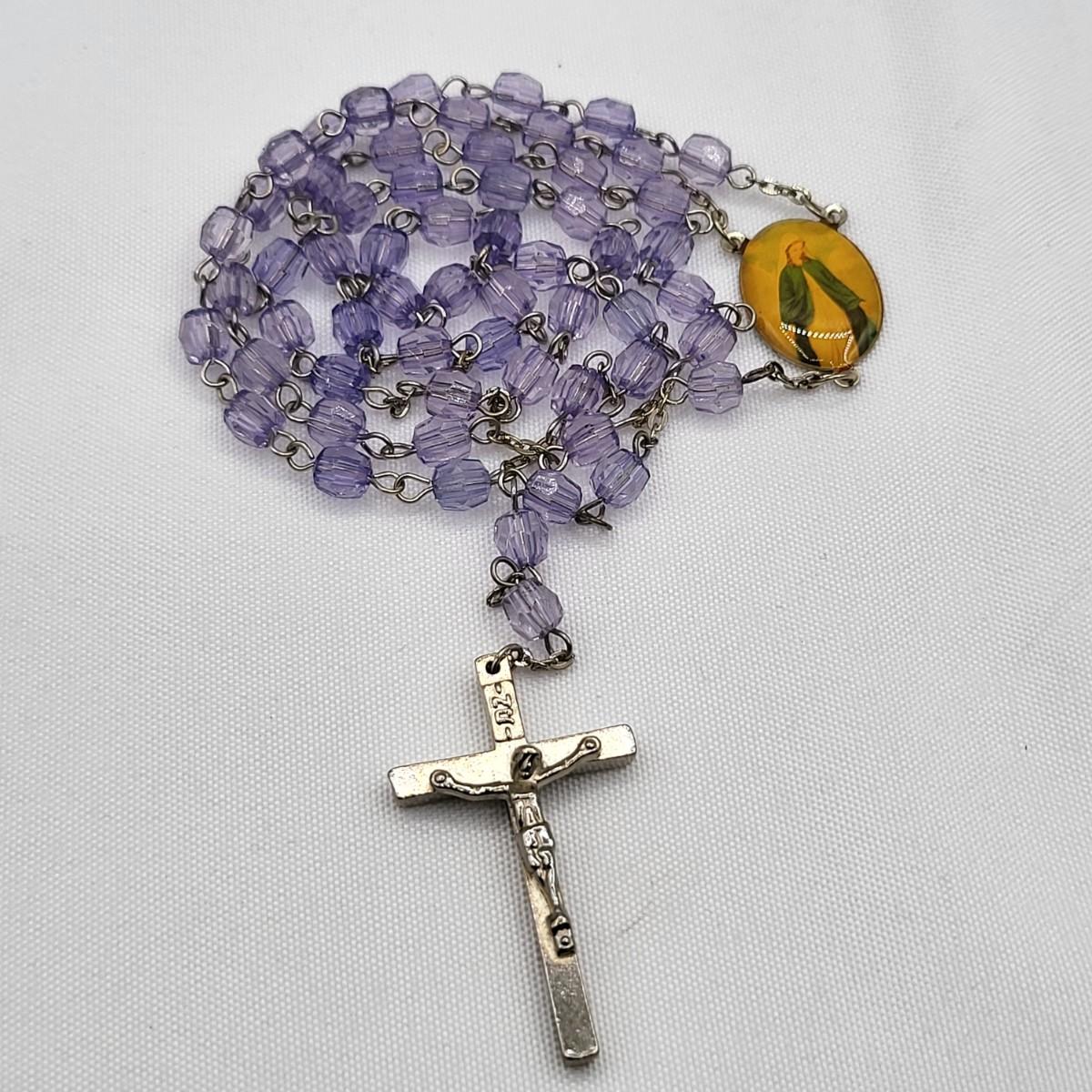 Rose scented rose beaded rosary made in Italy, lavender acrylic bead rosary and silvertone chain with large cross pendant.