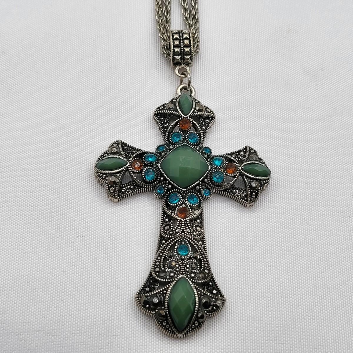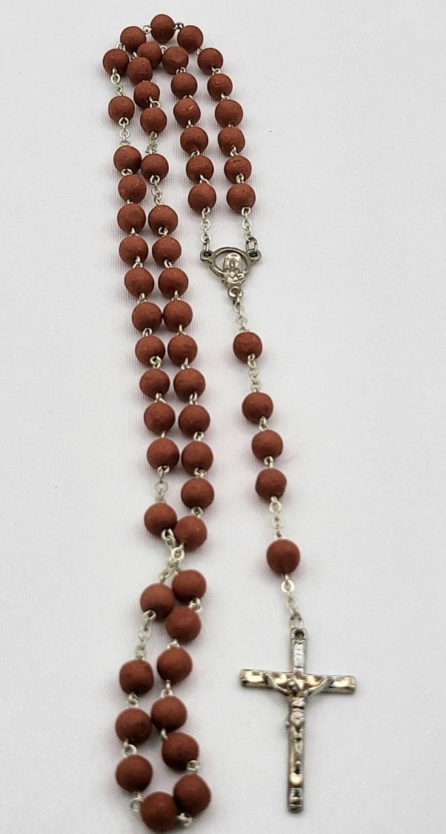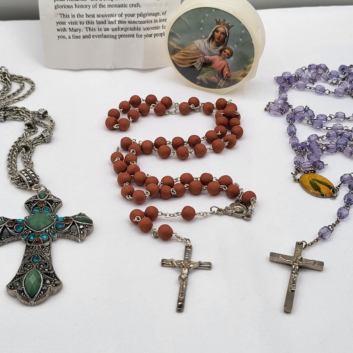 Rose scented rose beaded rosary made in Italy, lavender acrylic bead rosary and silvertone chain with large cross pendant.