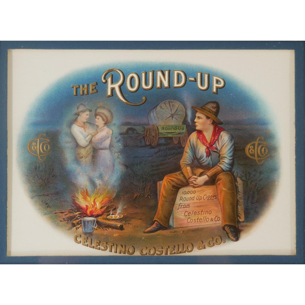 "The Round-Up" is an original antique stone lithograph dating from 1870-1925. These are original advertisments which cannot be reproduced. Art reads "The Round Up - 10,000 Round-Up Cigars from Celestino Costello & Co." In excellent condition! Includes Certificate of Authenticity. Art is L 7" x H 5". Frame measures L 13.5" x H 11.5" x D 1". (A19)