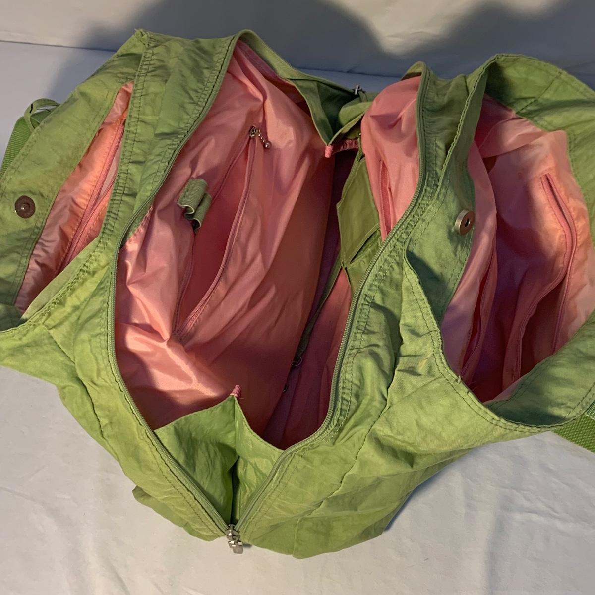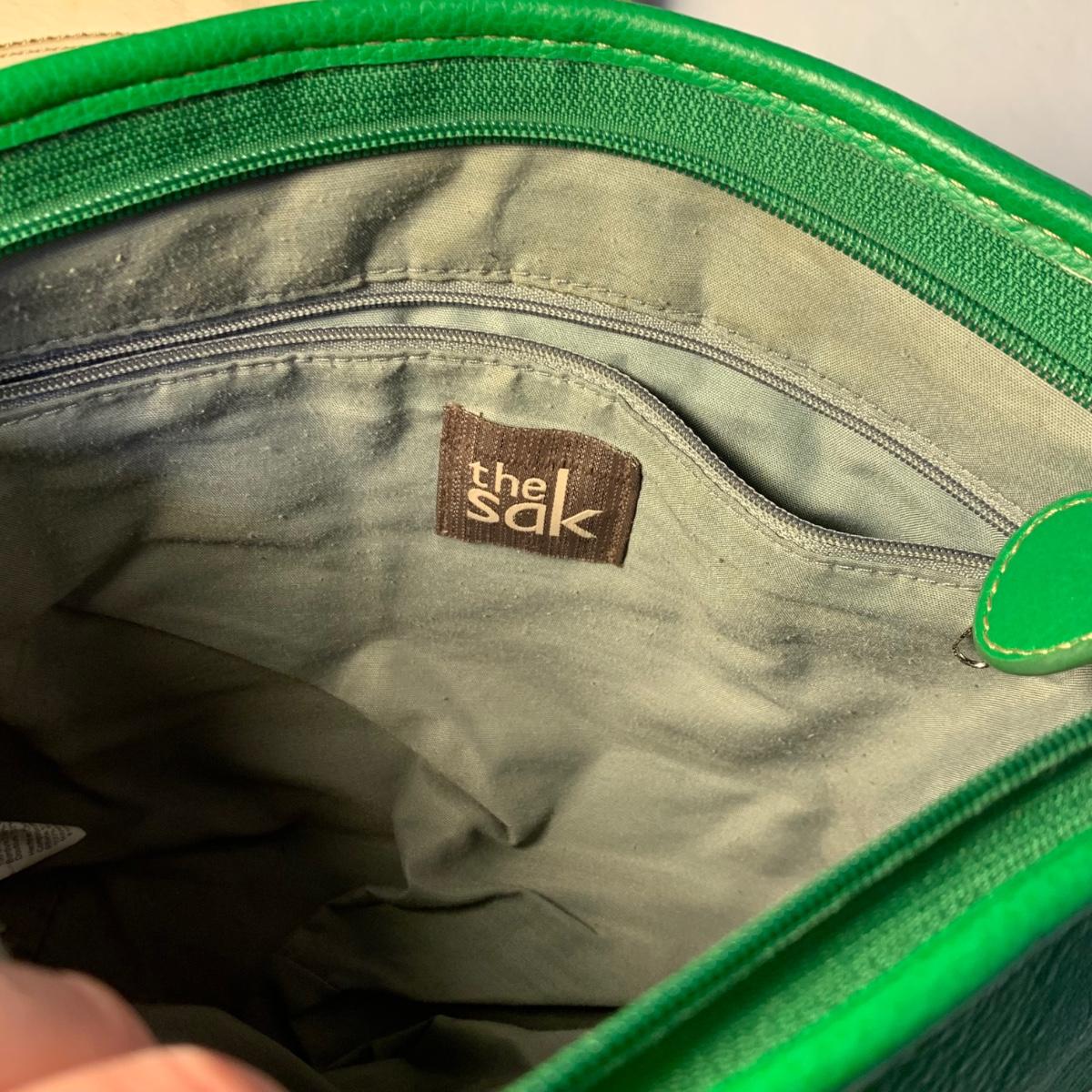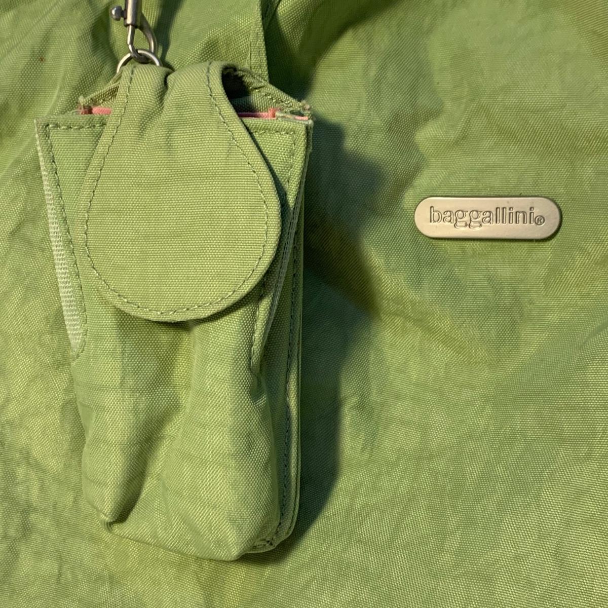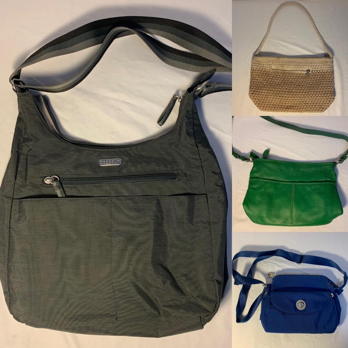 A collection of 14 total handbags and shoulder bags. Eight are Baggallini brand and six are The Sak. The Baggallini bags have nylon exteriors. Three of The Sak bags are leather. The other two are woven polyester or nylon. The largest bag in this collection is the lime green Baggallini with the pink interior; it measures approximately 17” x 8” x 11”H, not including the handle. Please see photos for inventory and condition.