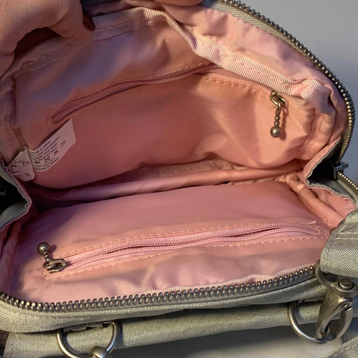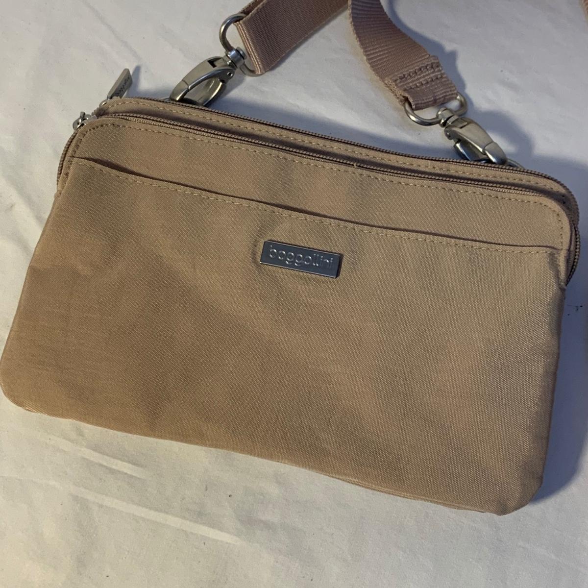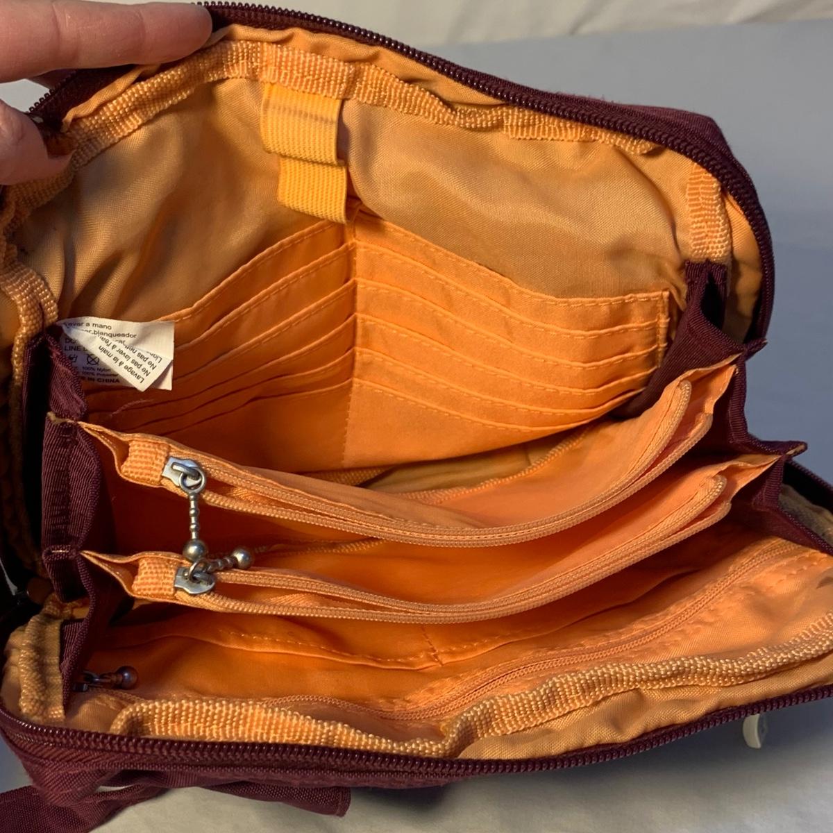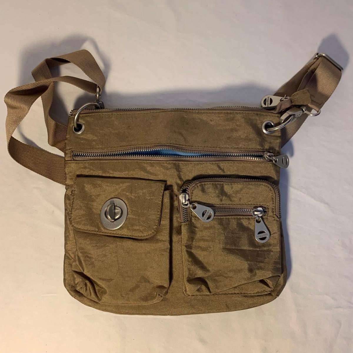A collection of 14 total handbags and shoulder bags. Eight are Baggallini brand and six are The Sak. The Baggallini bags have nylon exteriors. Three of The Sak bags are leather. The other two are woven polyester or nylon. The largest bag in this collection is the lime green Baggallini with the pink interior; it measures approximately 17” x 8” x 11”H, not including the handle. Please see photos for inventory and condition.