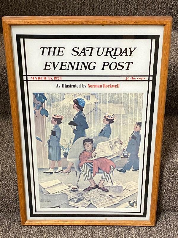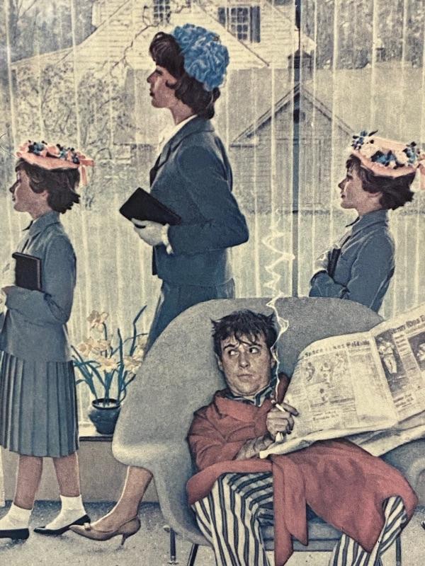 The Saturday Evening Post Illustration by Norman Rockwell. Features a guy reading the paper trying to hide as the family passes on their way to church. Measures roughly 15x23.