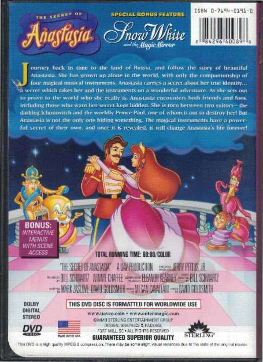 “The Secret of Anastasia”, DVD feature animated movie, Dolby Stereo, 90 min. PLUS bonus feature “Snow White and the Magic Mirror”. Shiny bright disc. Excellent++ condition.