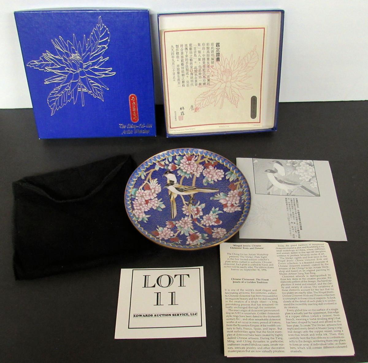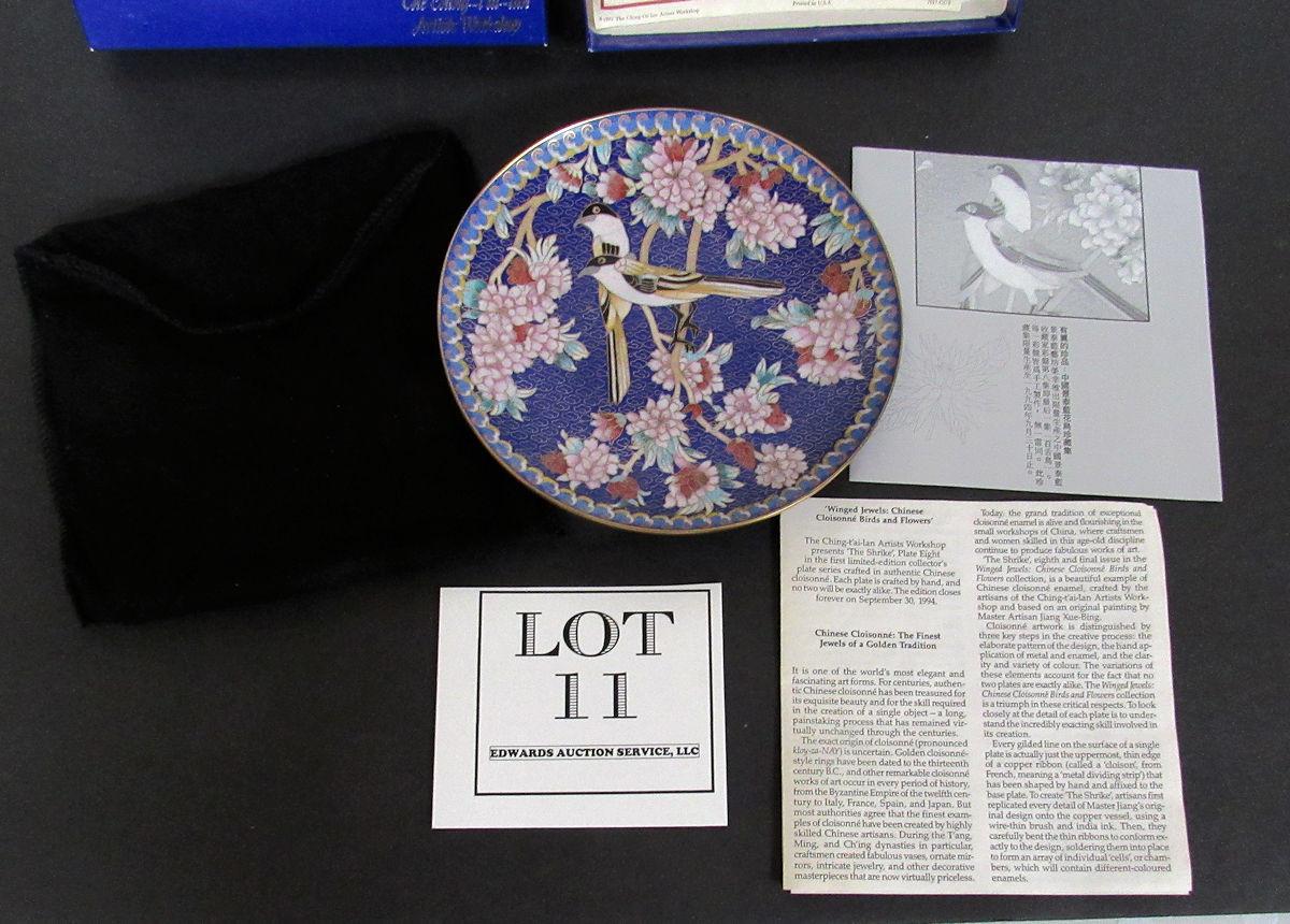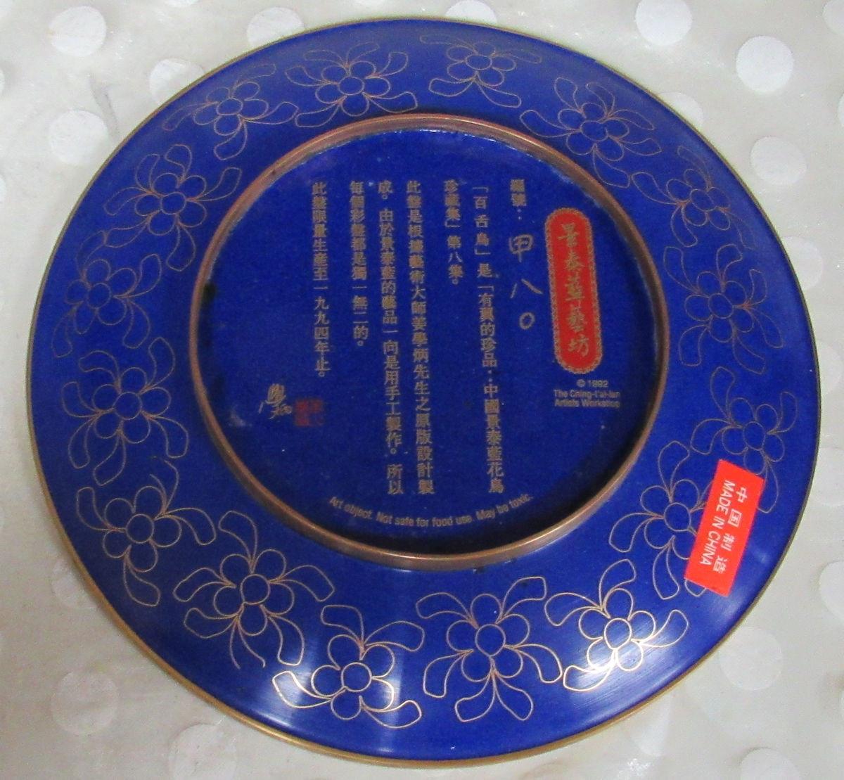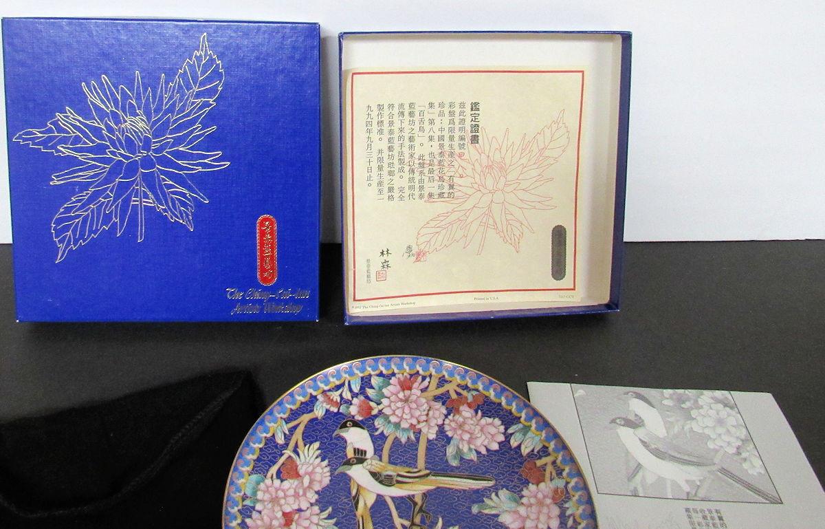 Beautiful plate, beautiful condition. 8th and last in series of the Winged Jewels Chinese Cloisonne Plates Series. These plates were in limited production. This one ended on 9/30/94. Comes complete in original box with package inserts. Shipping is available at shipping cost plus $5.00 handling fee on up to 8 items, $10.00 handling fee on 9 or more items.