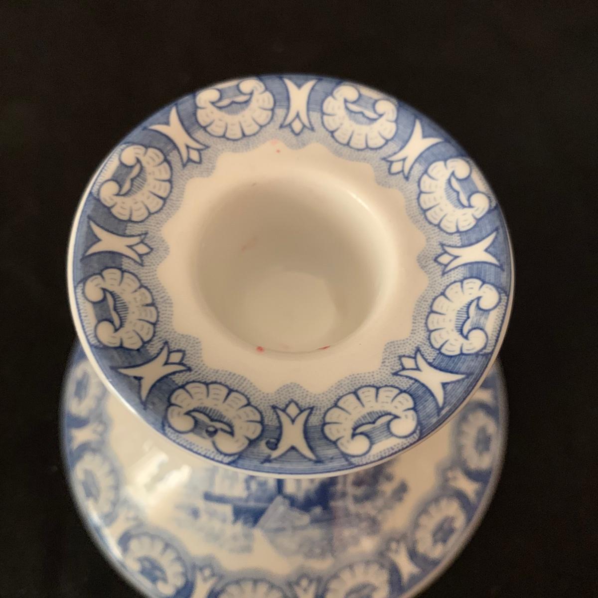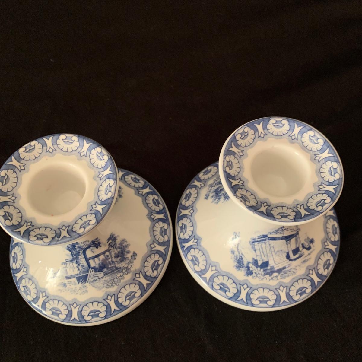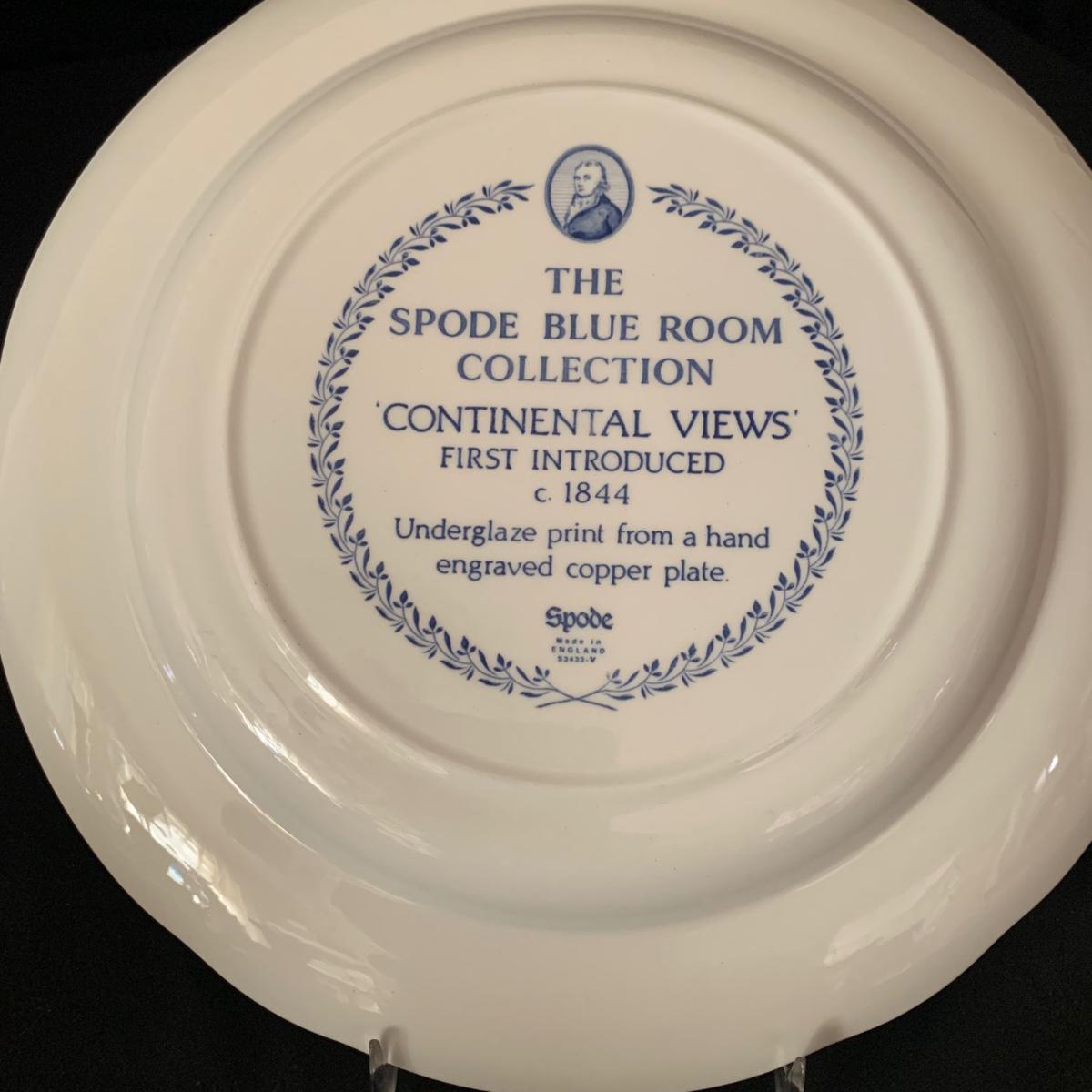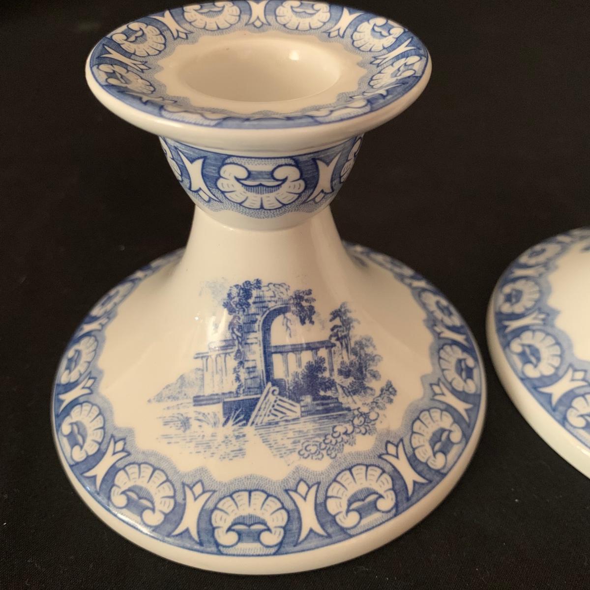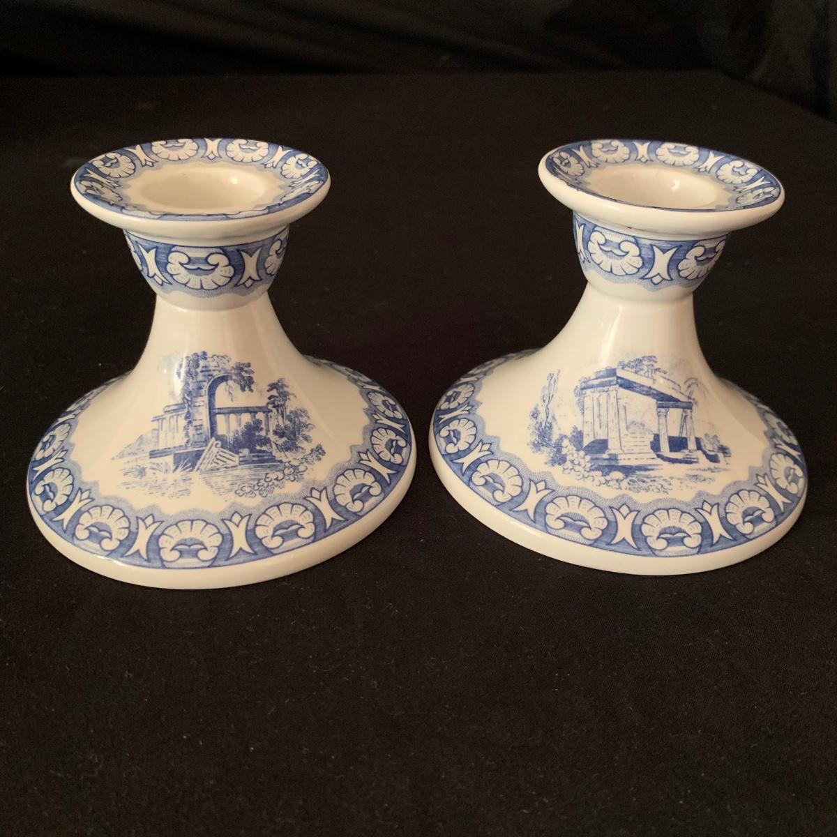Ceramic items from the Spode Blue Collection, including six plates and two candlestick holders. Each item says that it was reproduced from a hand engraved copper plate. Each plate features a different design. The plates each measure 10.5”D. All items are in very good condition, with the exception of one chip on the “˜Continental Views’ plate.