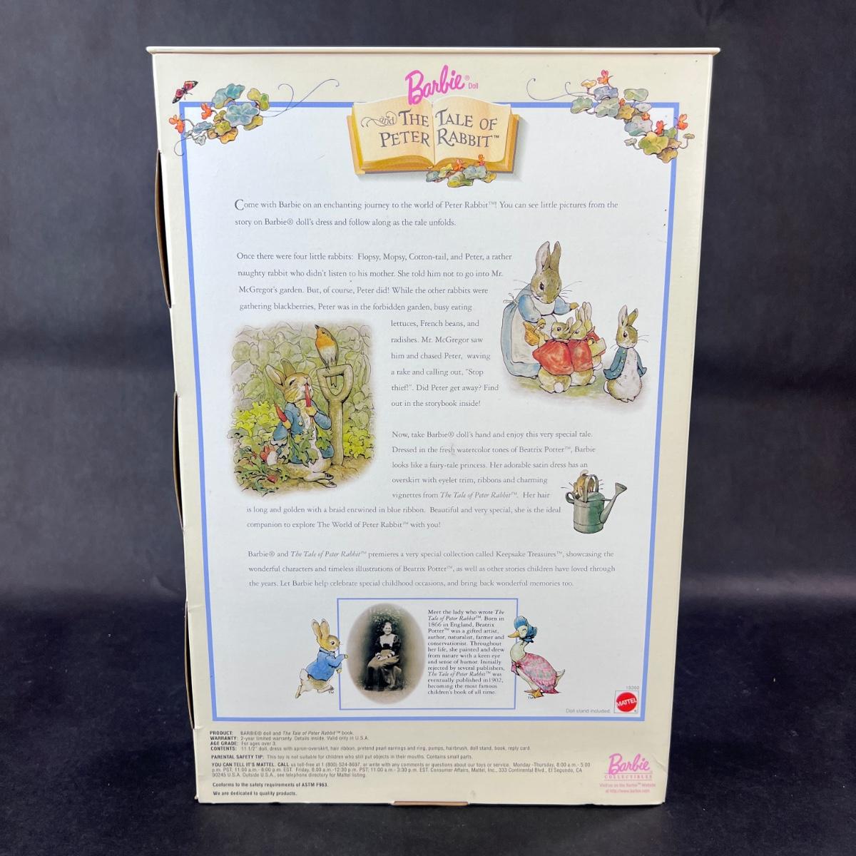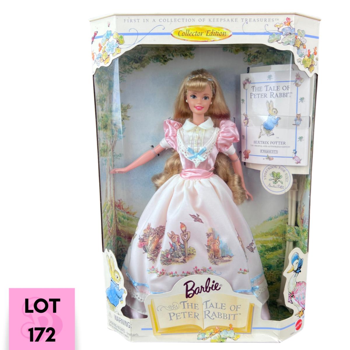 This Barbie doll is the First in a collection of Keepsake Treasures, A Collector Edition. This doll, in her adorable satin dress has an overskirt with eyelid trim, ribbons and charming vignettes from The Tale of Peter Rabbit surrounding her. This doll was produced in 1997 by Mattel. This doll has not been out of its box. **|** Please see photos for details and condition. ::: Shipping is available on this lot. If you require shipping you must let us know at the close of the auction. We will coordinate with you after the item has been won. Shipping fees will include insurance up to or exceeding the value of all items being mailed. If you have any questions regarding this lot please contact the auctioneer either via this website, by direct email or by phone. PICK UP TIMES and other important information can be found in the TERMS and DESCRIPTION of the auction. Please take a look for pertinent information. Thanks!