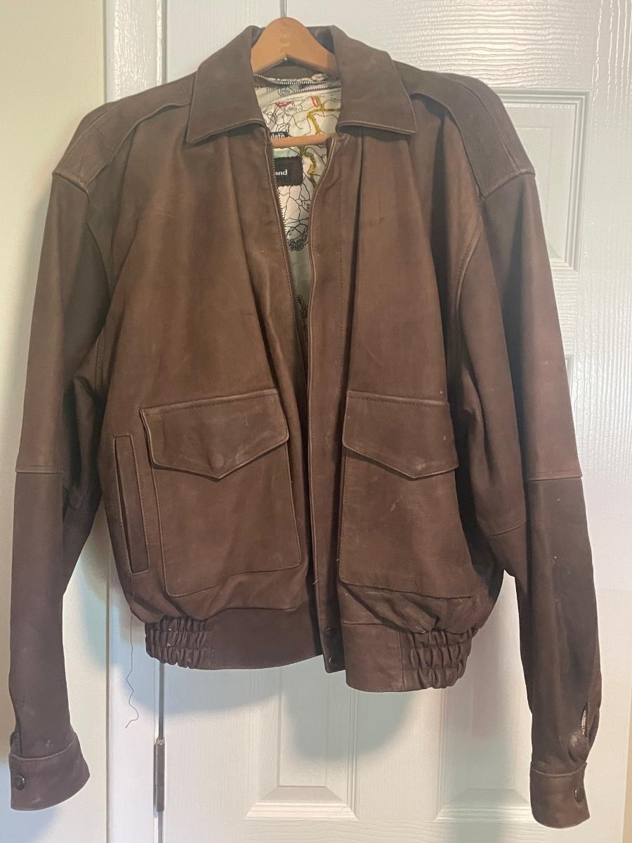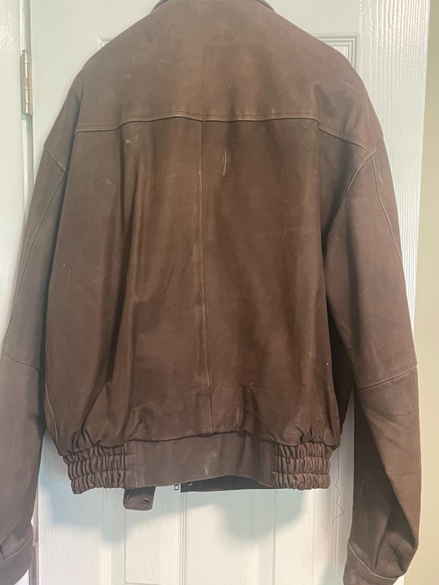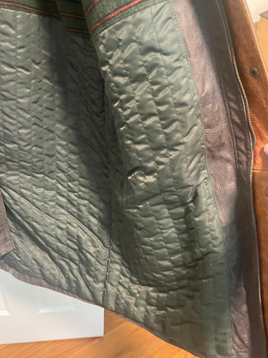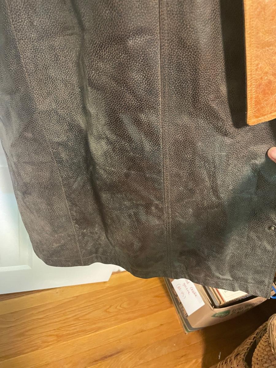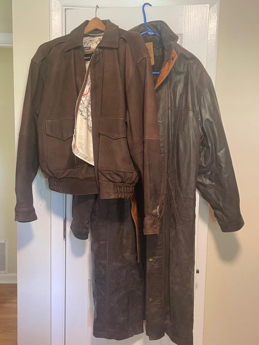 Both of these quality jackets are lined with an extra silk like lining for the bomber jacket; this jacket feels and looks like leather but no tag was found for verification. The long jacket is genuine leather with a felt and quilted inner lining. Both jackets are XL and in good condition with just some minor marks on the short jacket and the long jacket (49” long) has minor wear, see images.
