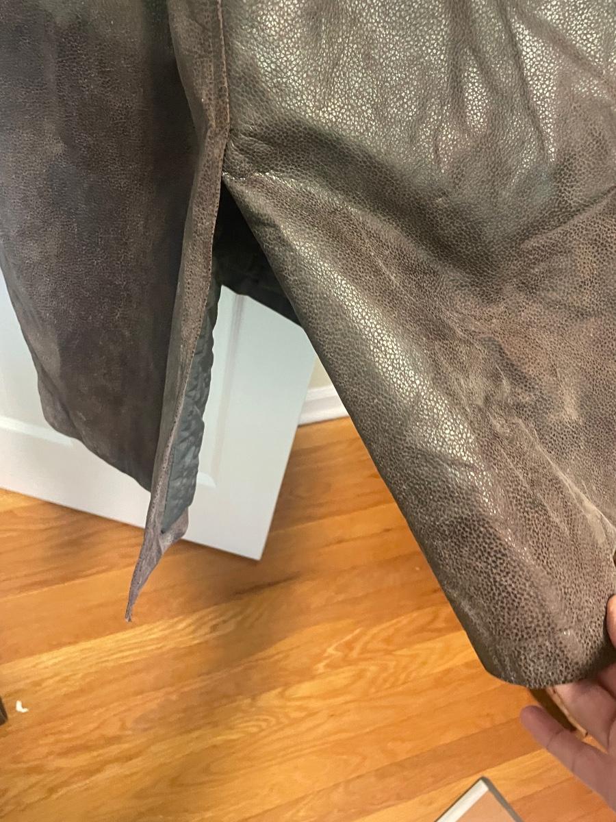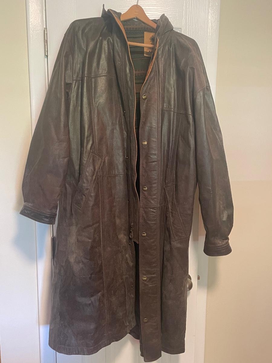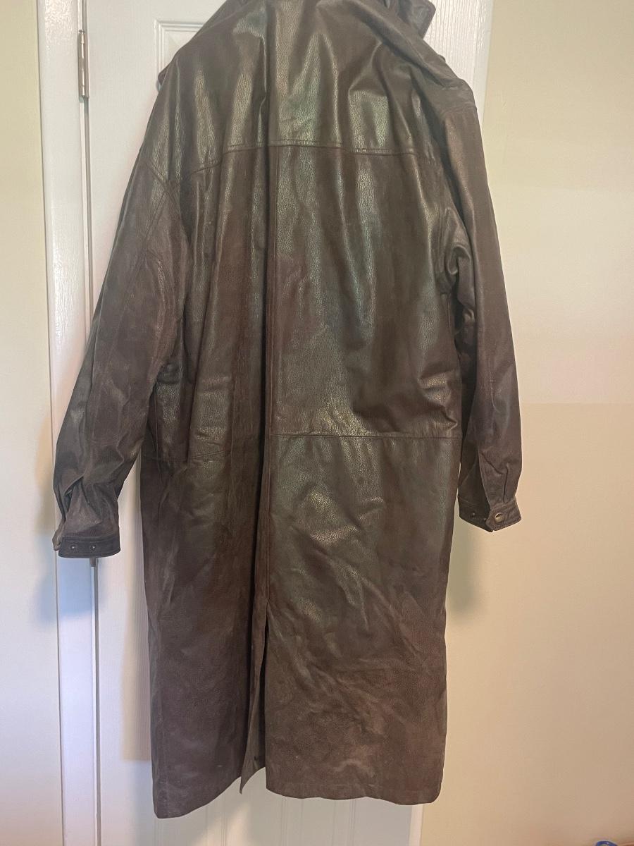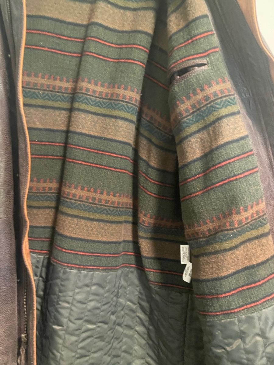 Both of these quality jackets are lined with an extra silk like lining for the bomber jacket; this jacket feels and looks like leather but no tag was found for verification. The long jacket is genuine leather with a felt and quilted inner lining. Both jackets are XL and in good condition with just some minor marks on the short jacket and the long jacket (49” long) has minor wear, see images.