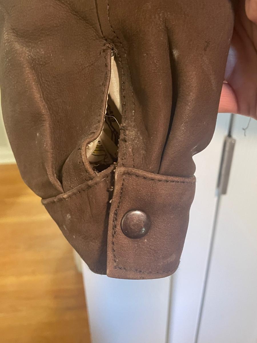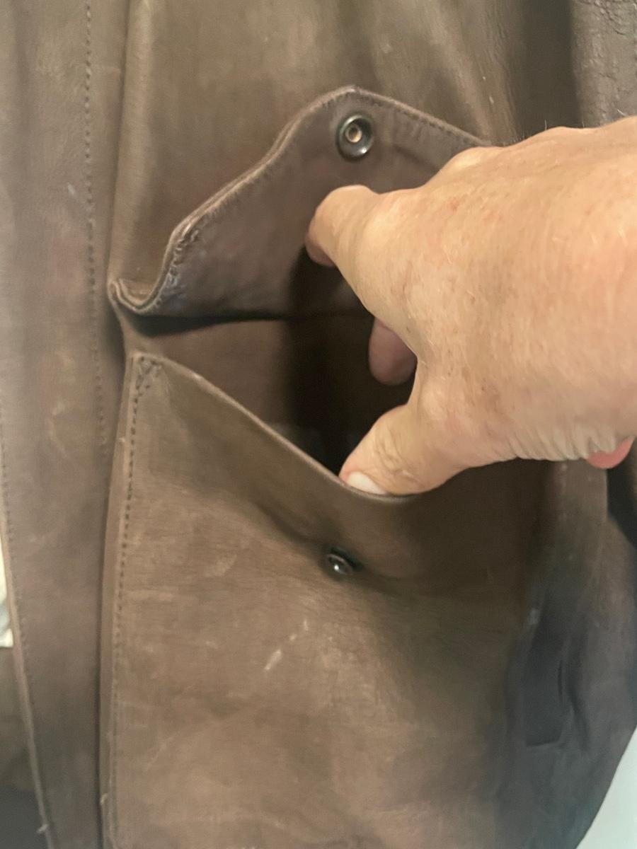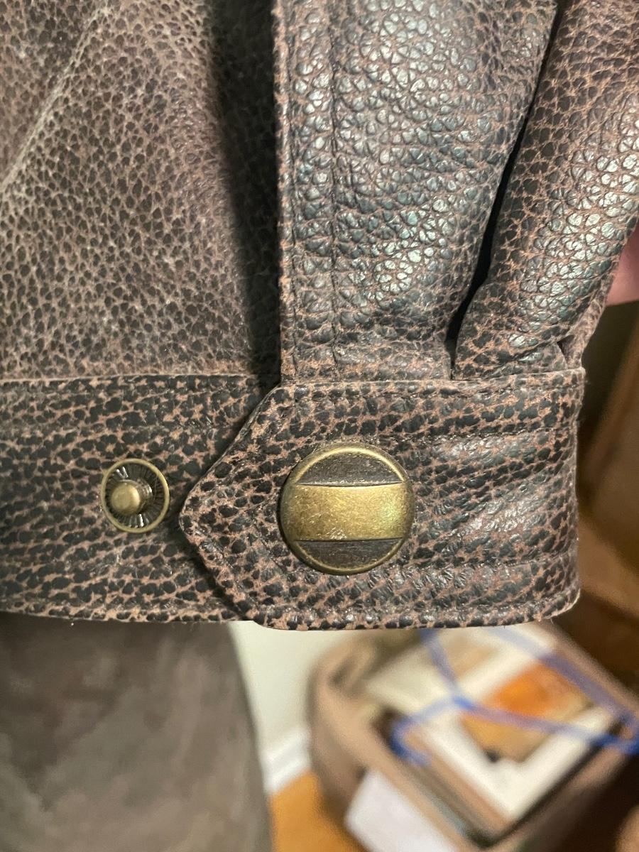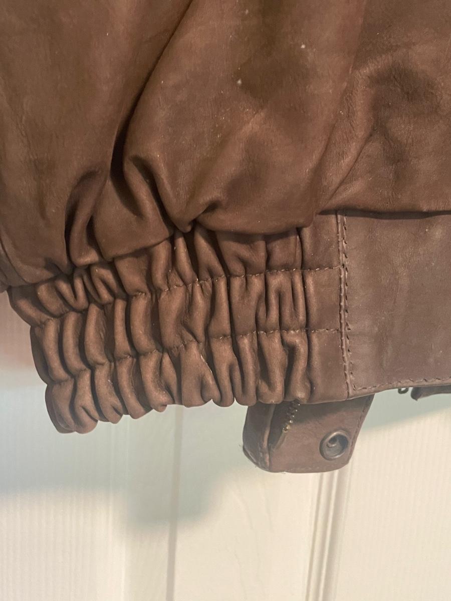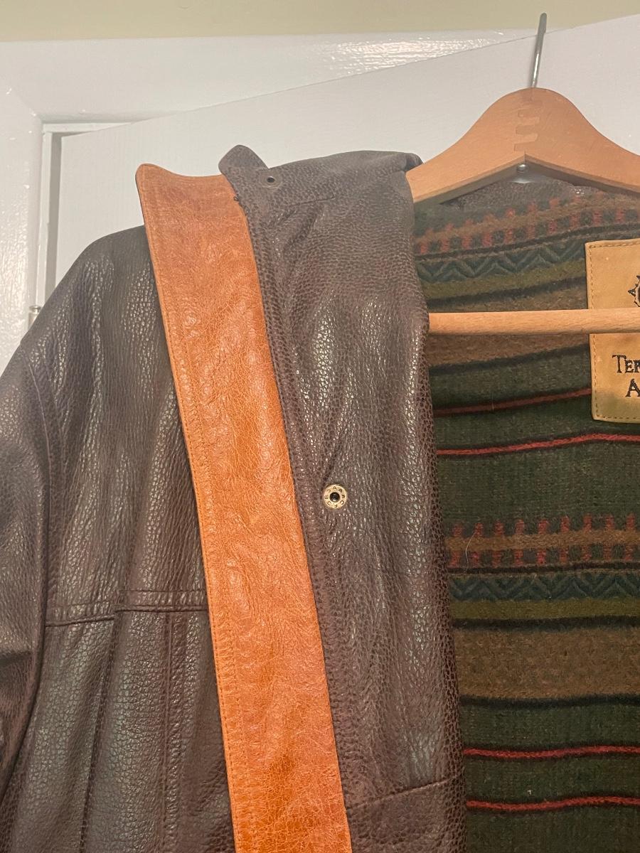 Both of these quality jackets are lined with an extra silk like lining for the bomber jacket; this jacket feels and looks like leather but no tag was found for verification. The long jacket is genuine leather with a felt and quilted inner lining. Both jackets are XL and in good condition with just some minor marks on the short jacket and the long jacket (49” long) has minor wear, see images.