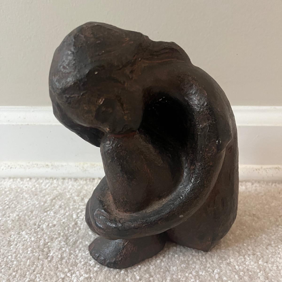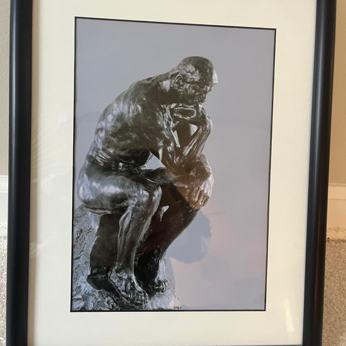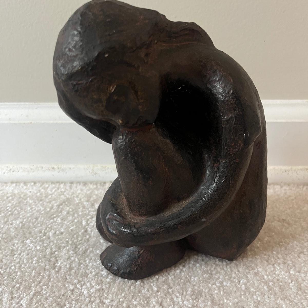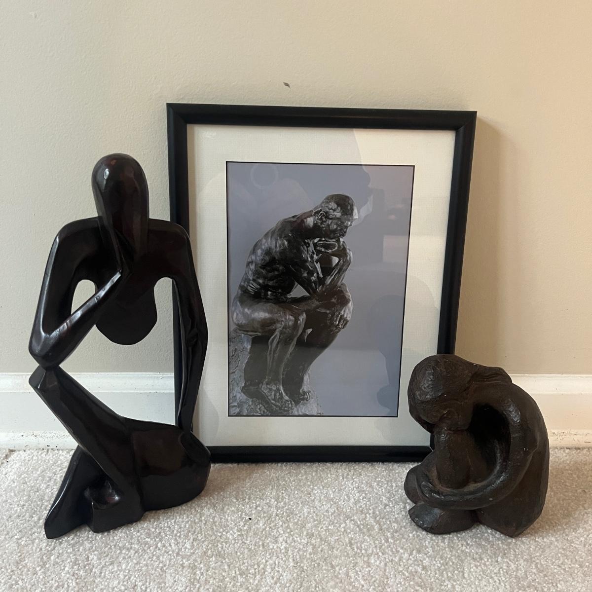 Lot includes a metal framed and matted picture of The Thinker under glass, ceramic sculpture of girl seated that is signed but illegible and a hand made wooden sculpture. Frame measures 11.5” x 14.5”H.