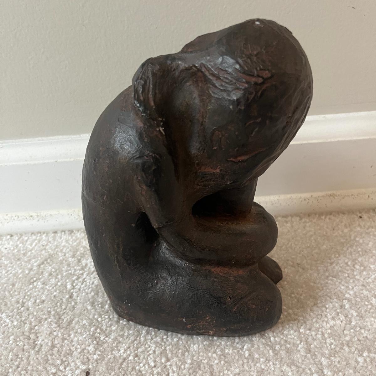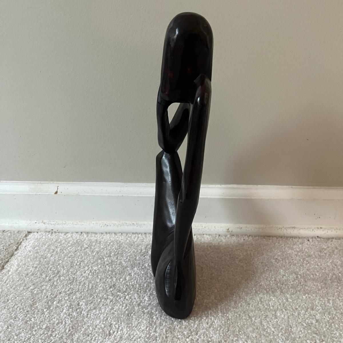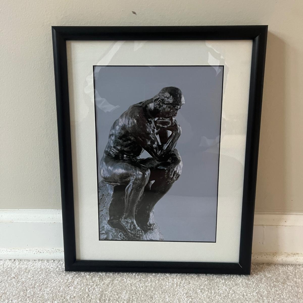 Lot includes a metal framed and matted picture of The Thinker under glass, ceramic sculpture of girl seated that is signed but illegible and a hand made wooden sculpture. Frame measures 11.5” x 14.5”H.