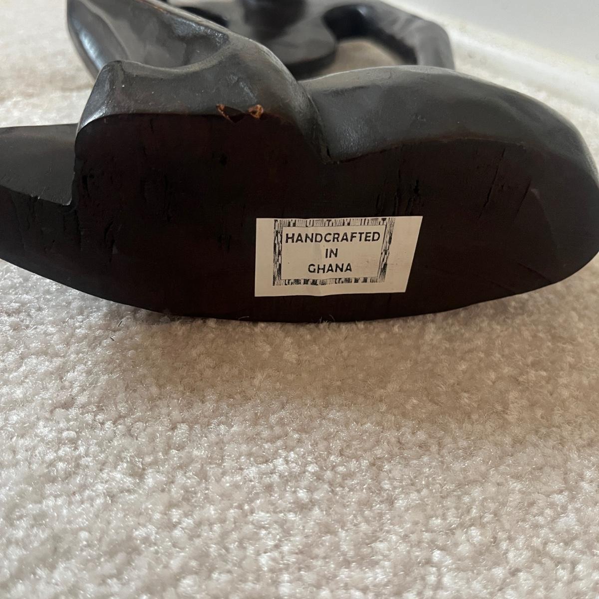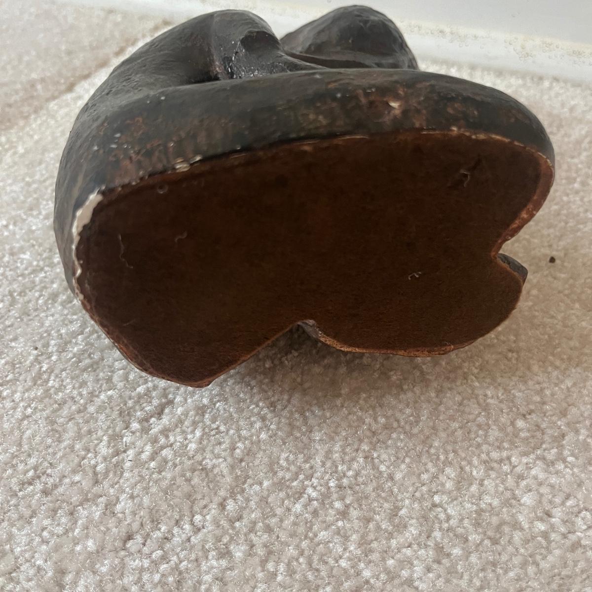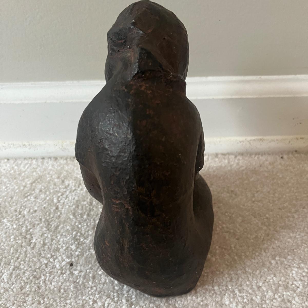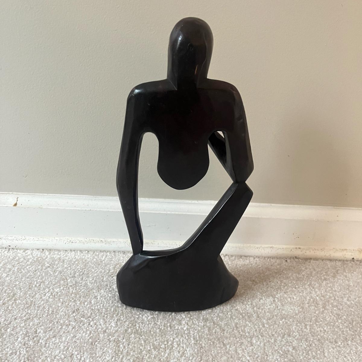 Lot includes a metal framed and matted picture of The Thinker under glass, ceramic sculpture of girl seated that is signed but illegible and a hand made wooden sculpture. Frame measures 11.5” x 14.5”H.