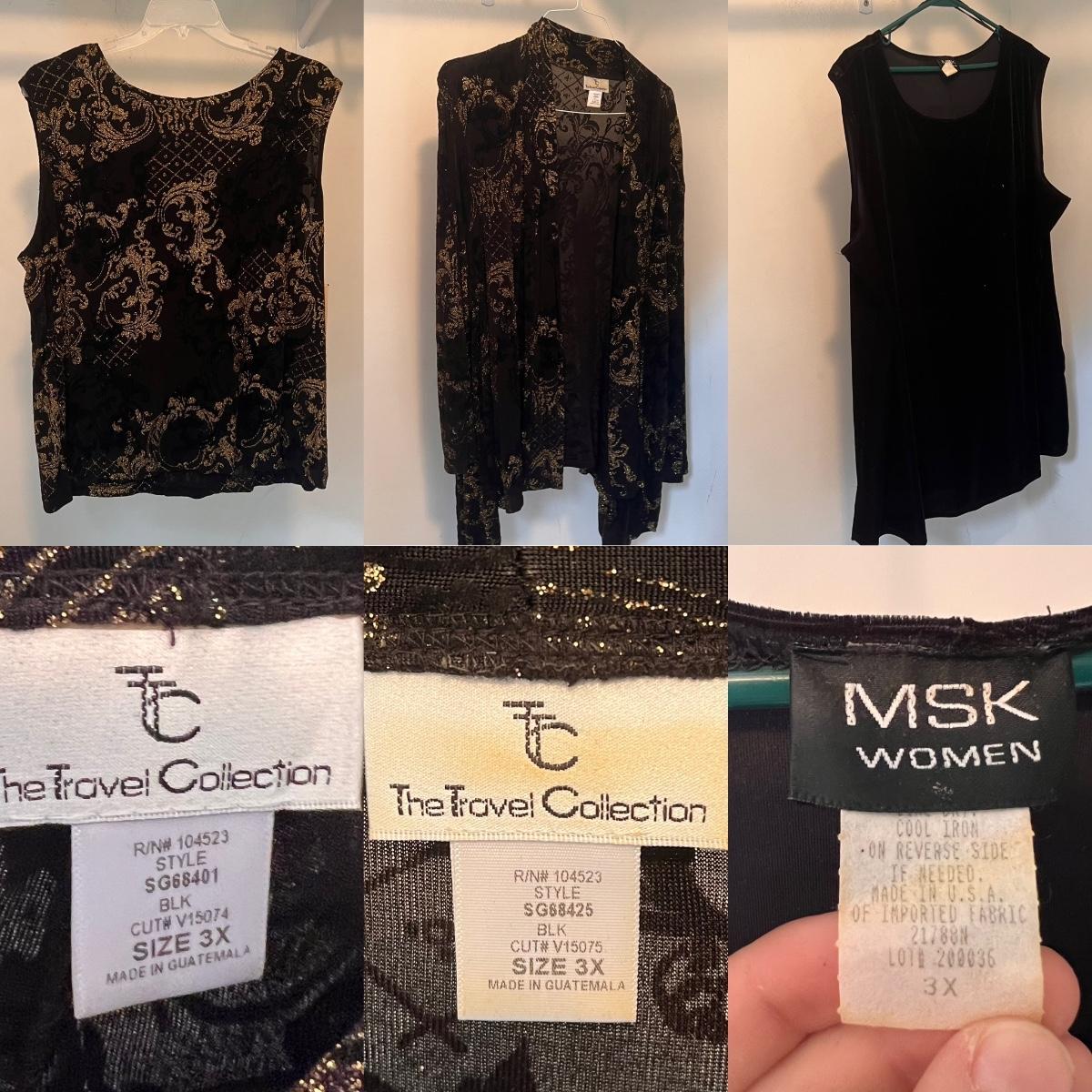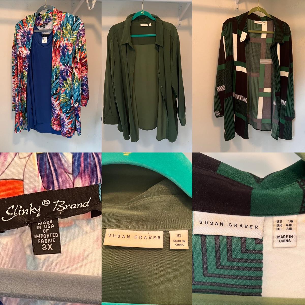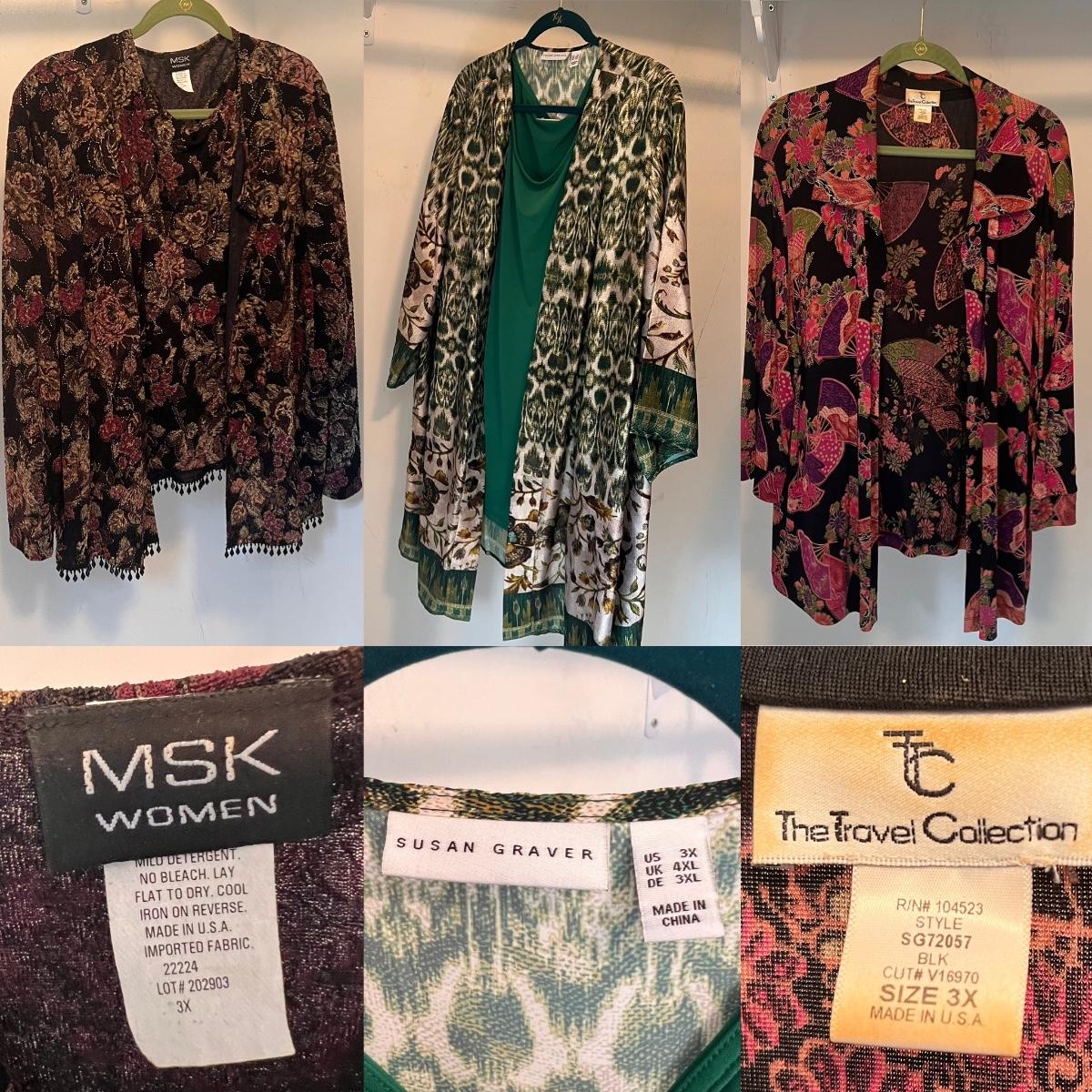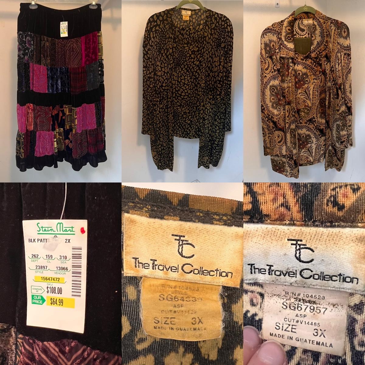 This lot includes around forty pieces of women’s skirts and blouses. All items range from size 2XL to 3XL. You’ll find the following brands: The Travel Collection, MSK Women, Susan Graver, Lady Dorby, and Slinky Brand. Shipping available.