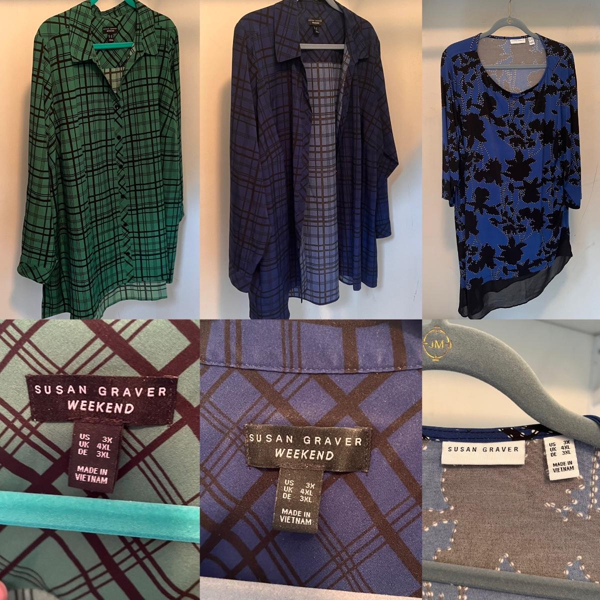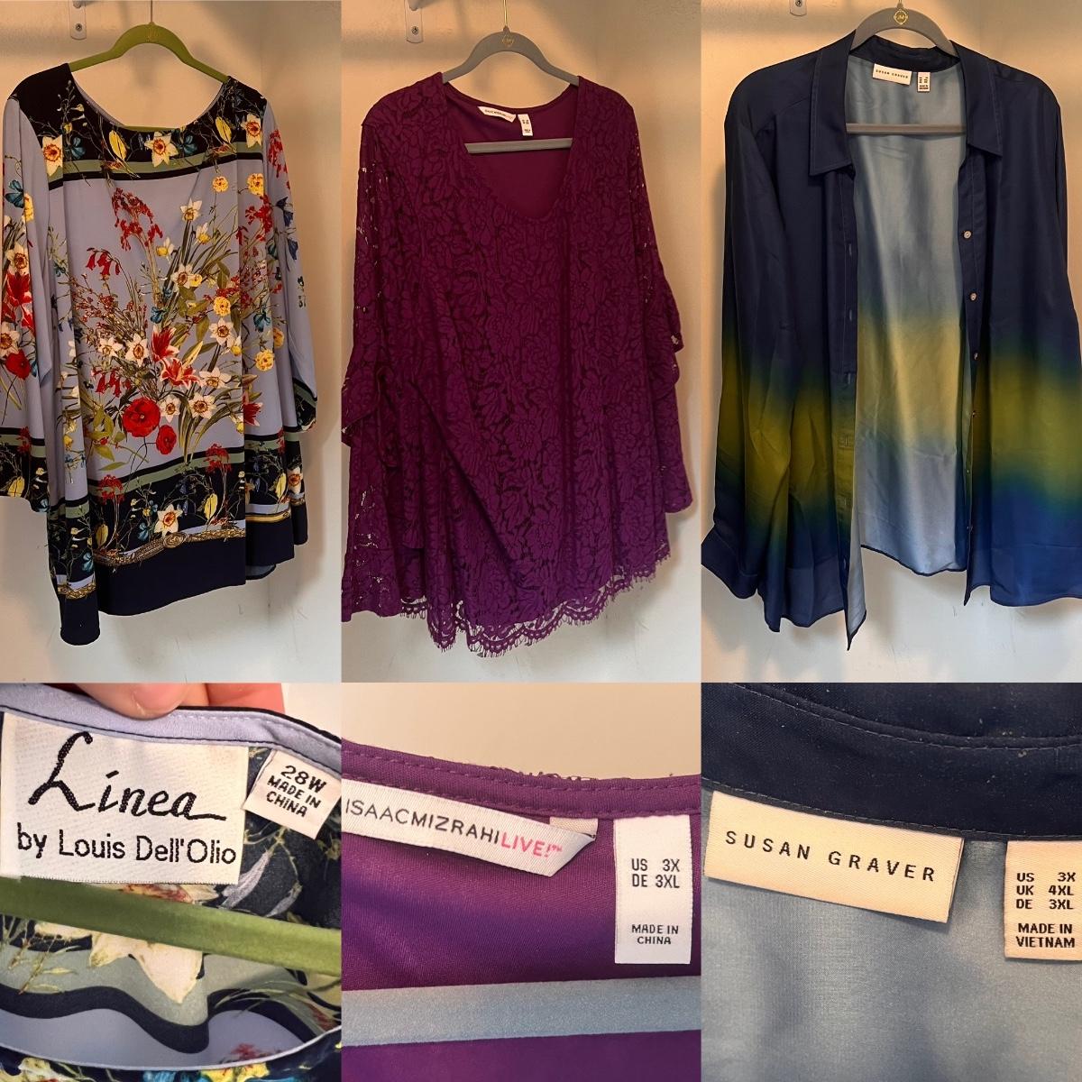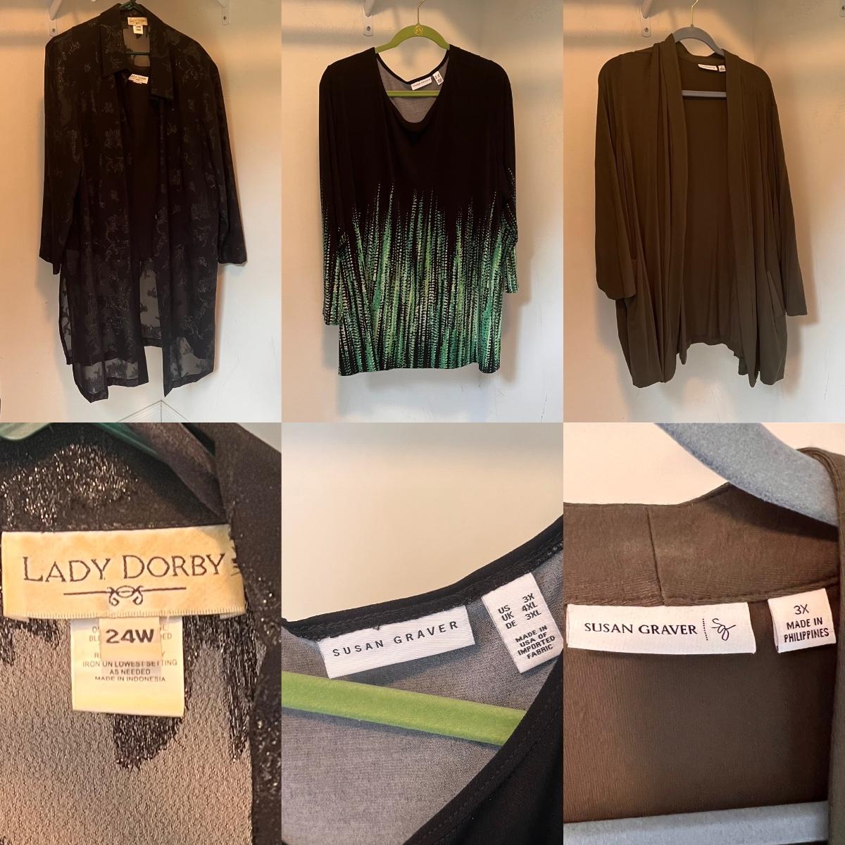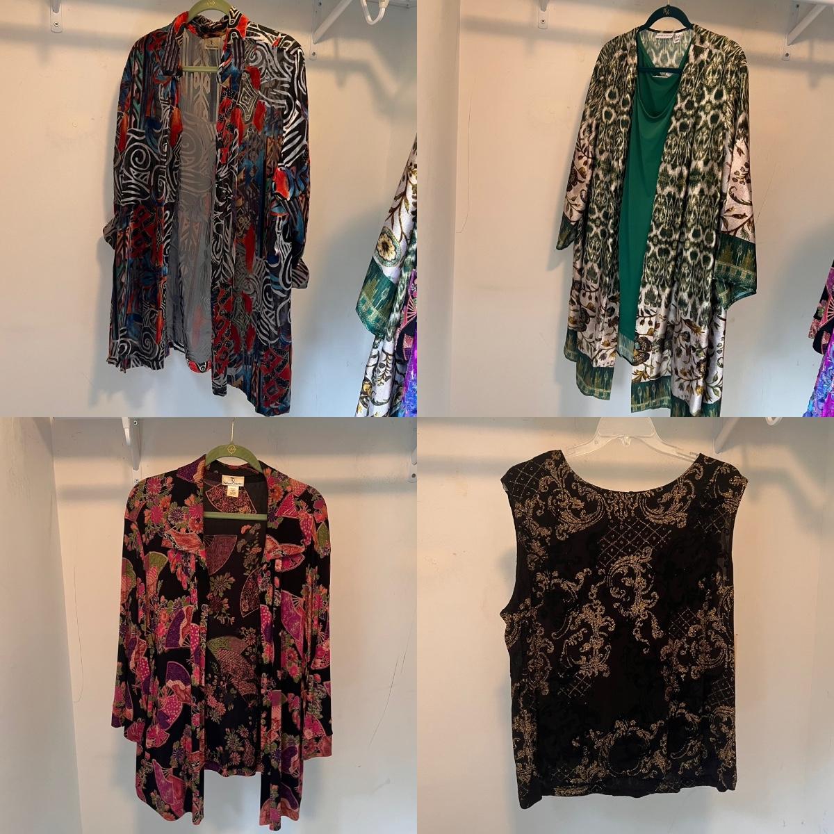 This lot includes around forty pieces of women’s skirts and blouses. All items range from size 2XL to 3XL. You’ll find the following brands: The Travel Collection, MSK Women, Susan Graver, Lady Dorby, and Slinky Brand. Shipping available.